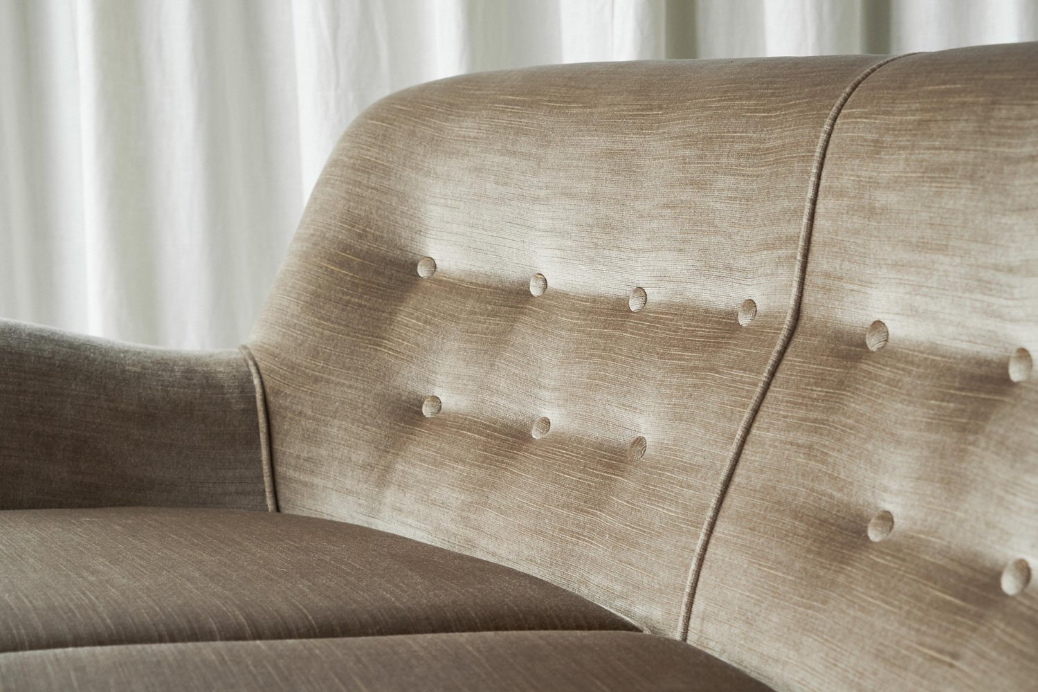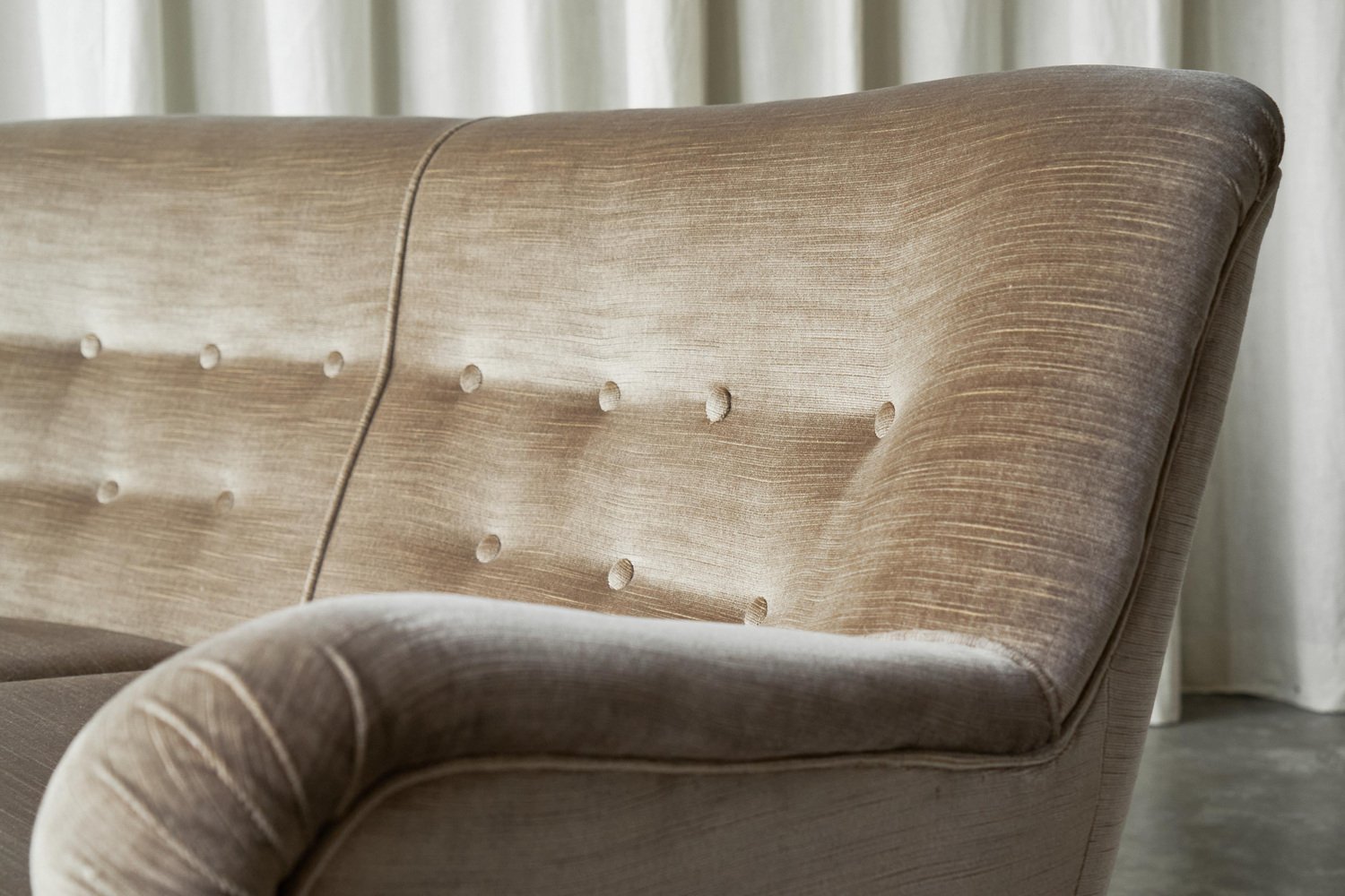 Divano moderno scandinavo a 2 posti "Banana" in velluto, Europa, 1960. Questo divano curvo a 2 posti "Banana", realizzato negli anni '60 in Scandinavia, emana un'eleganza e un fascino senza tempo. La dolce curvatura della silhouette del divano è elegante e confortevole. Rivestito in morbido velluto grigio/verde, il design del divano è caratterizzato da linee pulite e da una sottile raffinatezza. Lo schienale imbottito con bottoni aggiunge un dettaglio delicato, esaltando il suo fascino classico senza sovrastare l'estetica generale. Le gambe in legno leggermente affusolate - due davanti e tre dietro - forniscono una base solida, pur mantenendo la sensazione di leggerezza e ariosità del pezzo. Si presenta in condizioni vintage oneste e originali. Questo divano "Banana" è invecchiato con grazia, con il rivestimento in velluto che mostra alcuni segni di usura, visibili soprattutto sul retro del divano. Inoltre, uno dei bottoni del ciuffo è allentato, ma nel complesso non è molto visibile.