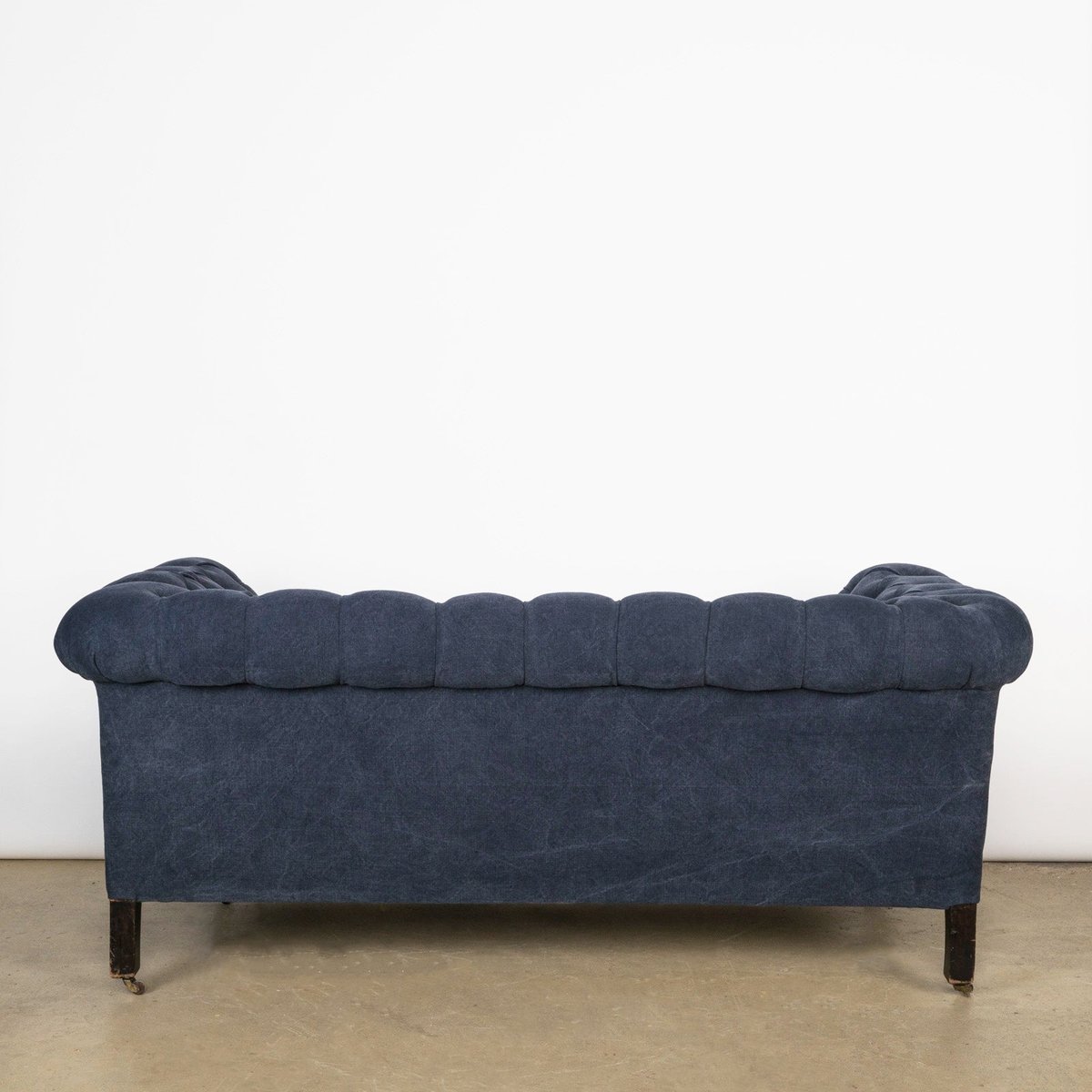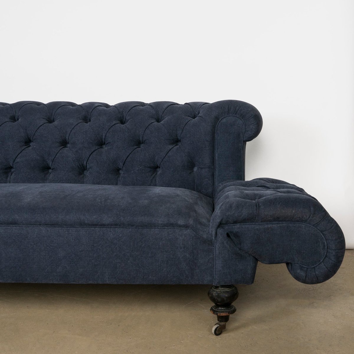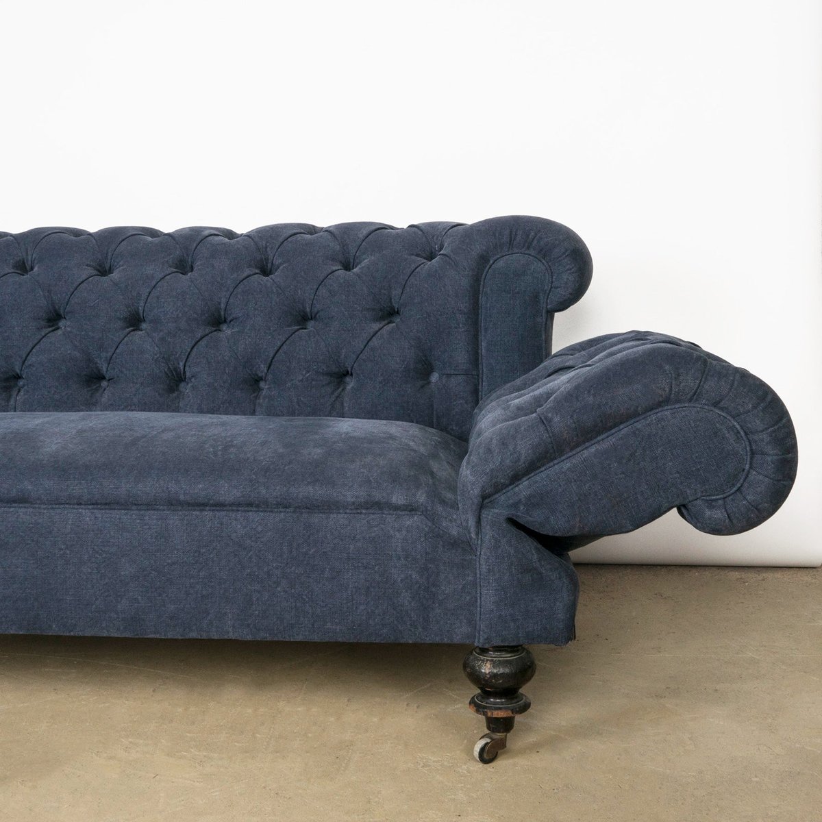 Elegantly tufted 19th-century French Napoleon III Sofa, a true testament to the craftsmanship of its era.The addition of casters on all four legs ensures effortless mobility, enabling you to effortlessly rearrange your space. The truly exceptional feature of this sofa is its drop-end, enhancing its comfort for leisurely lounging.with a fresh and sturdy update, the sofa embraces a new chapter with resilient blue stonewashed linen upholstery. Upholstered in the traditional manner, it eschews modern foam in favor of horsehair, adding to its authenticity and charm.A timeless addition to any home, this sofa seamlessly combines comfort and classic style.