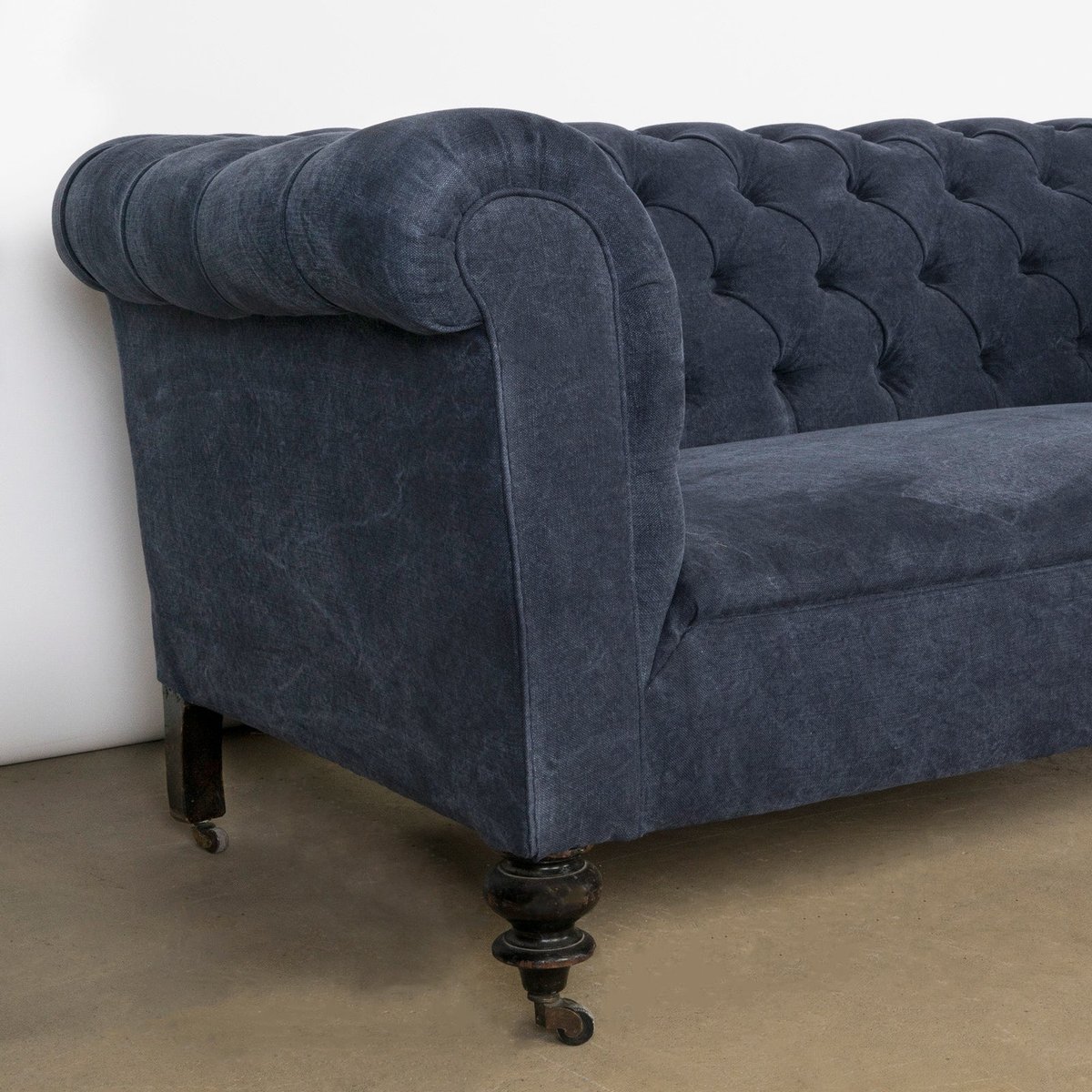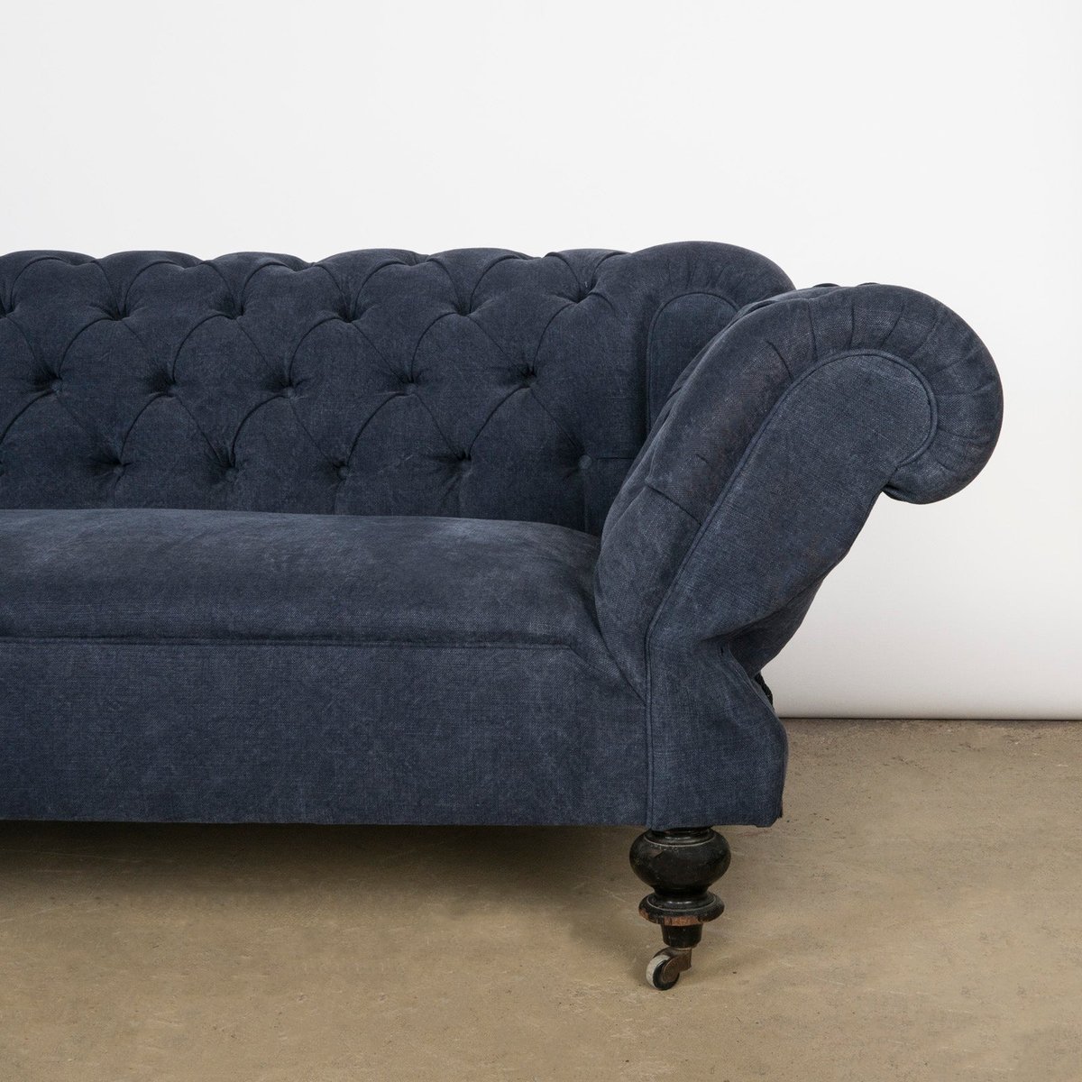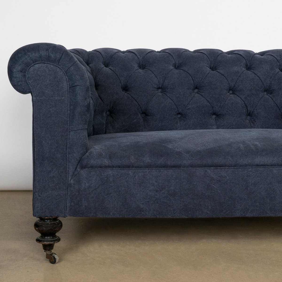 Elegantly tufted 19th-century French Napoleon III Sofa, a true testament to the craftsmanship of its era.The addition of casters on all four legs ensures effortless mobility, enabling you to effortlessly rearrange your space. The truly exceptional feature of this sofa is its drop-end, enhancing its comfort for leisurely lounging.with a fresh and sturdy update, the sofa embraces a new chapter with resilient blue stonewashed linen upholstery. Upholstered in the traditional manner, it eschews modern foam in favor of horsehair, adding to its authenticity and charm.A timeless addition to any home, this sofa seamlessly combines comfort and classic style.
