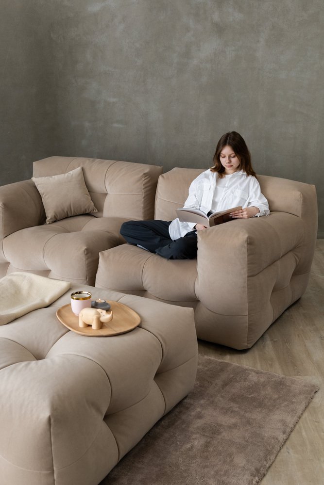 EMKO invites you to create your personal comfort zone with Not-A-Sofa.Forget rigid lines in furniture. Imagine sinking into the cloud-like comfort of a sofa, inspired by the minimalist elegance of Scandinavian design, yet light and adaptable like a bean bag. Not-A-Sofa is your personal sanctuary, crafted to transformrelaxation.Born from a desire to innovate sustainably, Not-A-Sofa transforms leftoverfoam from furniture production into a luxuriously cosy and durable haven. Its modular design, featuring three interconnected sections and a plush pouf, allows you to effortlessly create your perfect seating arrangement. Transform it from a sleek 2-seater to a sprawling 3-seater, or add the pouf for a luxurious chaise lounge feel.We invite you to reclaim your comfort zone. Unwind, recharge, and rediscover the joy of true relaxation with Not-A-Sofa.