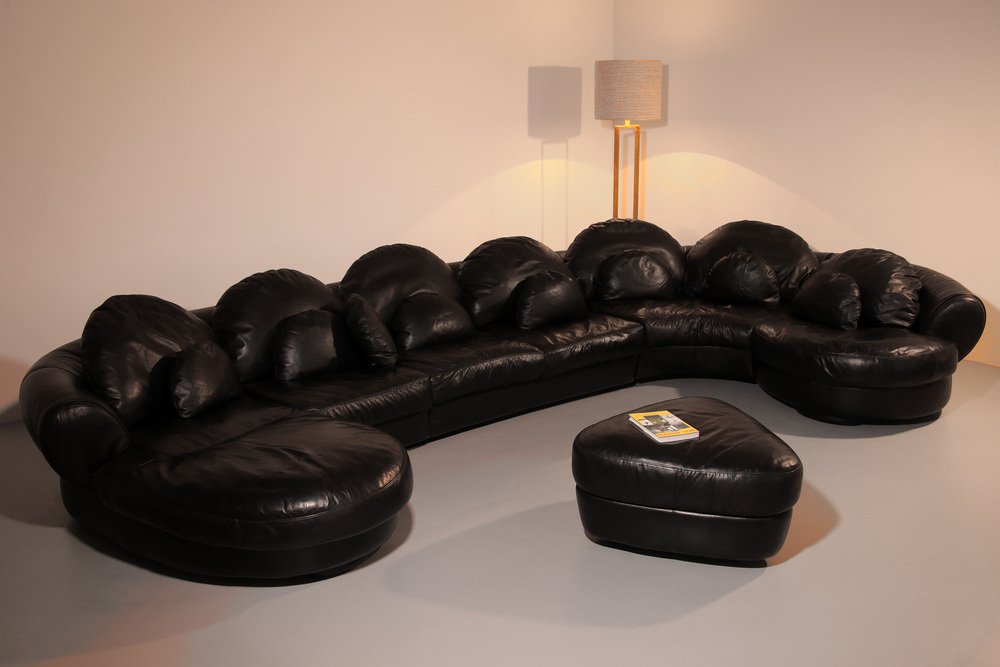Step into a world where comfort meets artistry with this extraordinary 1980s sectional sofa. Crafted in Europe during the height of post-modern design, this sofa is more than just a seat—it’s a statement. Its fluid, sinuous curves and generously cushioned, expansive seats invite you to relax, lounge, or entertain in complete comfort. Every element exudes personality, yet the sleek black leather ensures a timeless elegance that complements any interior. Whether you’re curating a modern living space or adding an eccentric touch to a contemporary home, this modular masterpiece commands attention.