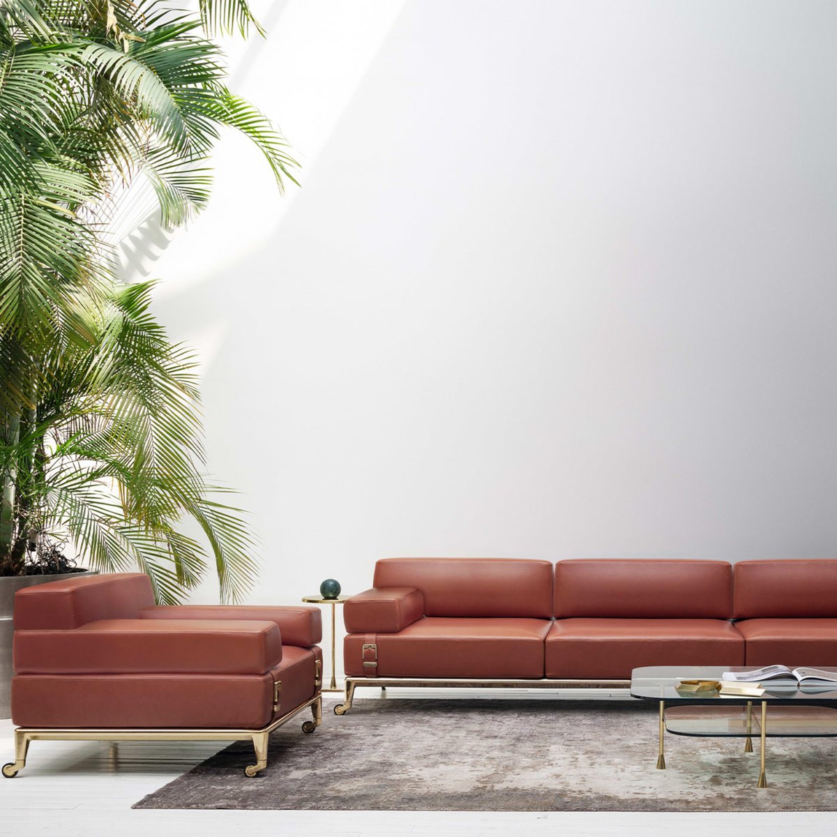 A clever solution exuding opulence and class, this three-seater sofa makes for a superb addition to both professional and residential contexts distinguished by a luxe appeal. Its plump geometric volumes are generously stuffed and upholstered in orange Aida leather, accented with belts whose buckles' glossy golden finish matches the wheeled base. Cushions not included. For the US market, please contact the Concierge for CAL TB 117 certified fabrics.A clever solution exuding opulence and class, this three-seater sofa makes for a superb addition to both professional and residential contexts distinguished by a luxe appeal. Its plump geometric volumes are generously stuffed and upholstered in orange Aida leather, accented with belts whose buckles' glossy golden finish matches the wheeled base. Cushions not included. For the US market, please contact the Concierge for CAL TB 117 certified fabrics.