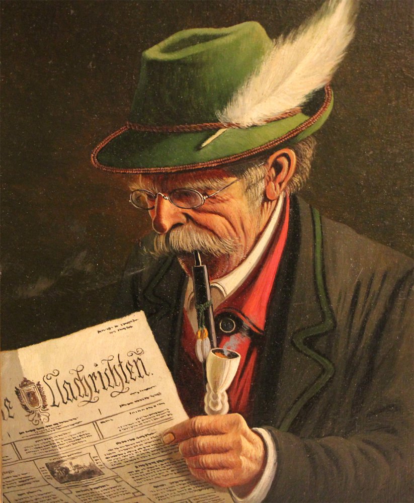 Vintage mid-20th-century original oil painting on wood by German artist Ernst Lang. This accomplished work depicts a man absorbed in the news of the day. with his distinguished wire-rimmed spectacles, feather-adorned hat, and a lush mustache, complemented by a pipe between his lips, he has a great deal of character and charm. The painting features a vibrant color palette, where bright hues are skillfully tempered with subdued tones. The artwork is signed with location indication: "E. Lang, München". Good vintage condition and presented in a gilded baroque frame - in good vintage condition, structurally sound with signs of very light cosmetic wear.