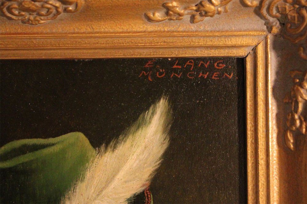 Dipinto a olio su tavola originale della metà del XX secolo dell'artista tedesco Ernst Lang. Con i suoi distinti occhiali con montatura a filo, il cappello ornato di piume e i baffi rigogliosi, completati da una pipa tra le labbra, l'uomo ha un grande carattere e fascino. Il dipinto è caratterizzato da una tavolozza di colori vivaci, dove le tonalità brillanti sono abilmente temperate da toni tenui. L'opera è firmata con indicazione del luogo: "E. Lang, München". In buone condizioni d'epoca e presentato in una cornice barocca dorata - in buone condizioni d'epoca, strutturalmente solido con segni di leggerissima usura estetica.