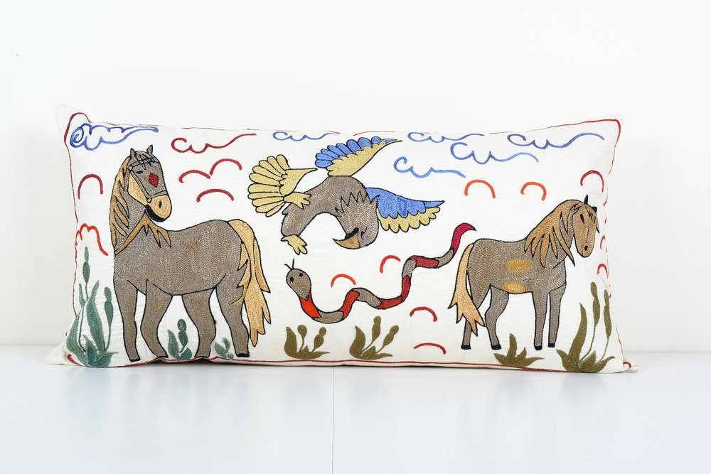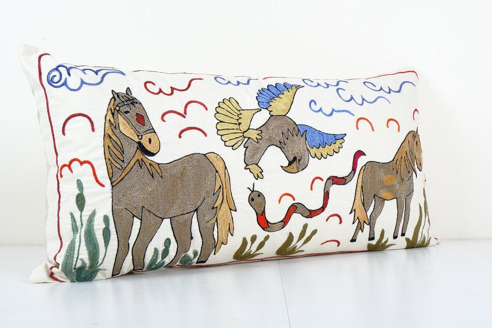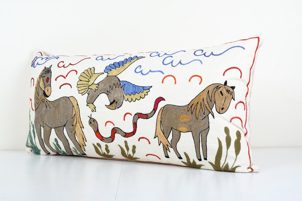 Federa vintage fatta a mano con animali Samarkand Suzani, Uzbeco, anni '60