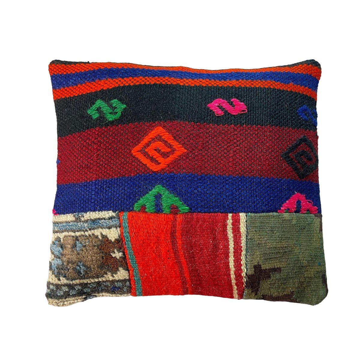 Unique Kilim Cushions, these are made from old handmade kilims, often Turkish ones, My cushions have the best quality fabric backing with a heavy duty zip. Have a look at all cushions and brighten up your home. These cushions are made from old and antique kilims, some may have fading, colour variations and sometimes signs of old repairs. please check photos carefully. Hand knotted Turkish kilim cushion cover ,Size is 43 x 37 cm Fashioned (cutted and stitched), from 40-80 years old hand knotted old & antique Turkish kilims. Kilim is a handwoven rug. Colored with vegetable dyes. Material is wool.Back side is cotton fabric and with hidden zipper. Pictures at this listing are exact photos of the pillow.Photos are taken in daylight, but on the screens of different computers the colors of pillow photos can be a little different than the original. Each pillow cover is unique.But above link you can find similar covers in my shop cutted from same kilim. Maybe is some minor deformation in some motives but they are fixed and the product is ready to use Cushion cover sold without insert.LL2236_40X40