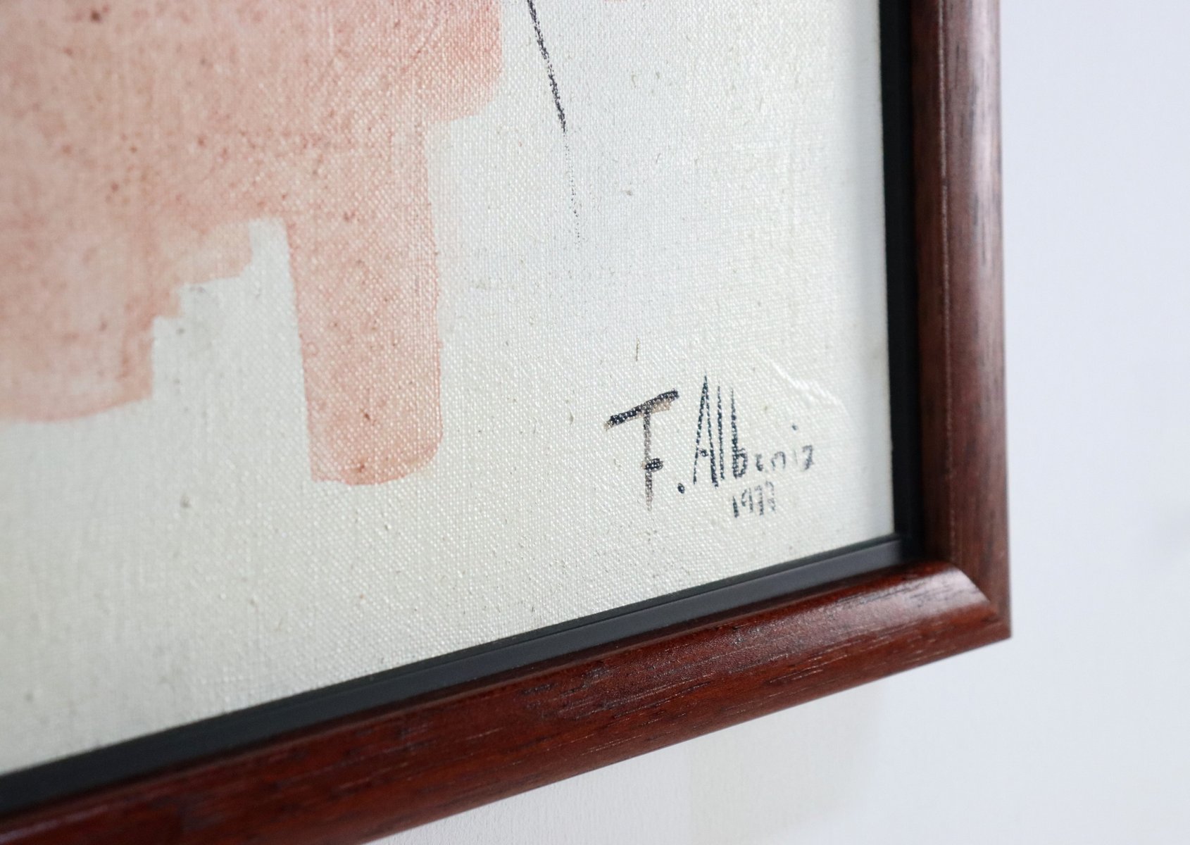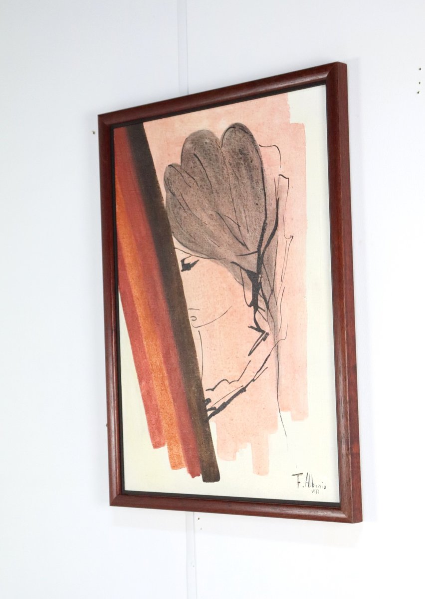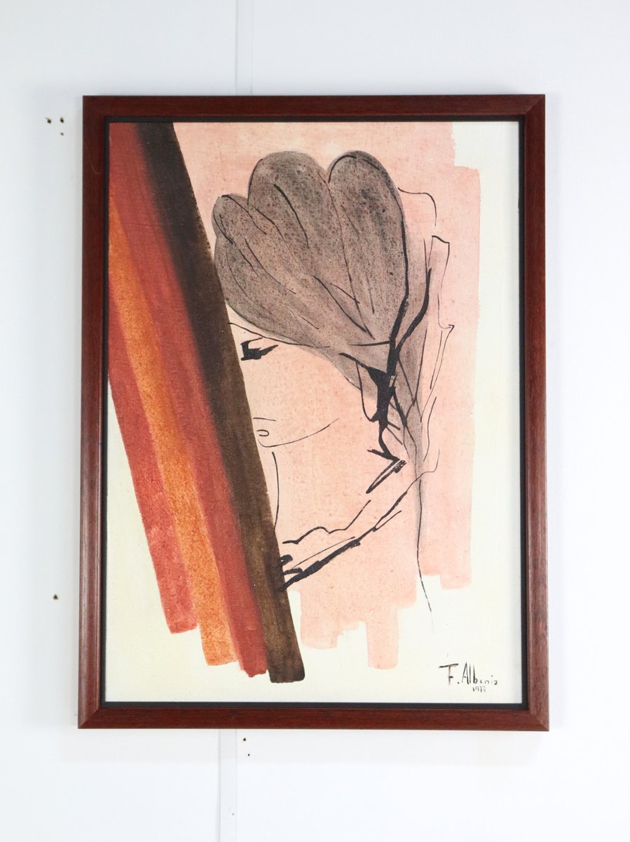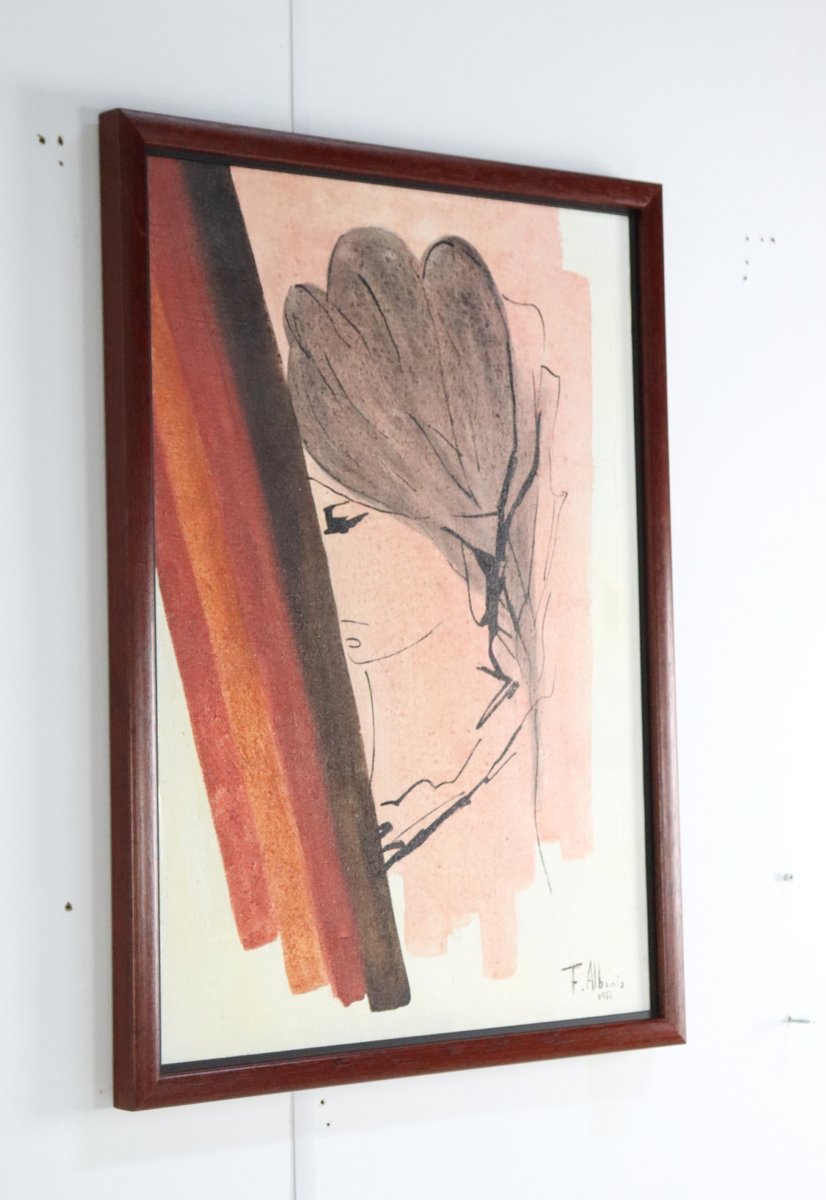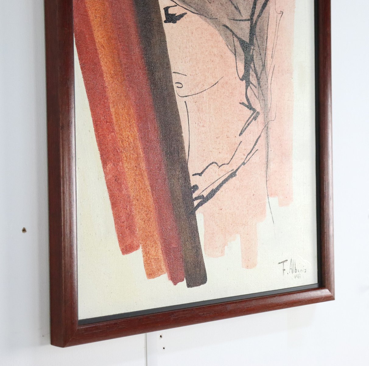 The painting by Fernando Alzamora Albeniz that we offer here shows an abstract composition with a large, half-hidden female figure in the center. This figure has a dark outline and is placed against a background and foreground of warm tones, ranging from beige to deep red and brown. There are also some darker, linear strokes that add to the abstract nature of the work. The artist's signature, “F. Albeniz,” is visible in the bottom right corner as well as the year 1977. About Fernando Alzamora Albeniz Fernando Alzamora Albeniz is a Spanish artist (1927) known for his often somewhat abstract works. His paintings are characterized by the use of female figures and a rich but warm color palette. He often plays with color and shape to create a sense of movement and depth in his works. Albeniz's style invites the viewer to make their own interpretations, making each piece a unique experience. His work is often inspired by nature and human emotion, resulting in art that is both visually appealing and profound. Albeniz's works are loved by collectors worldwide and are rapidly becoming increasingly popular. Due to their beautiful colors and wide applicability within various popular living styles, his work is now more appreciated than ever before. In this , only the work visible in photo 1 is offered. The other works are offered separately. Country of origin: Spain Artist: Fernando Alzamora Albeniz Year: 1977 Height: 76 cm Width: 55.5 cm Depth: 3 cm