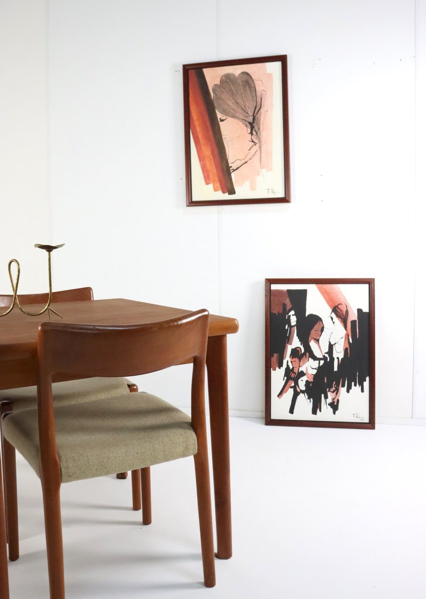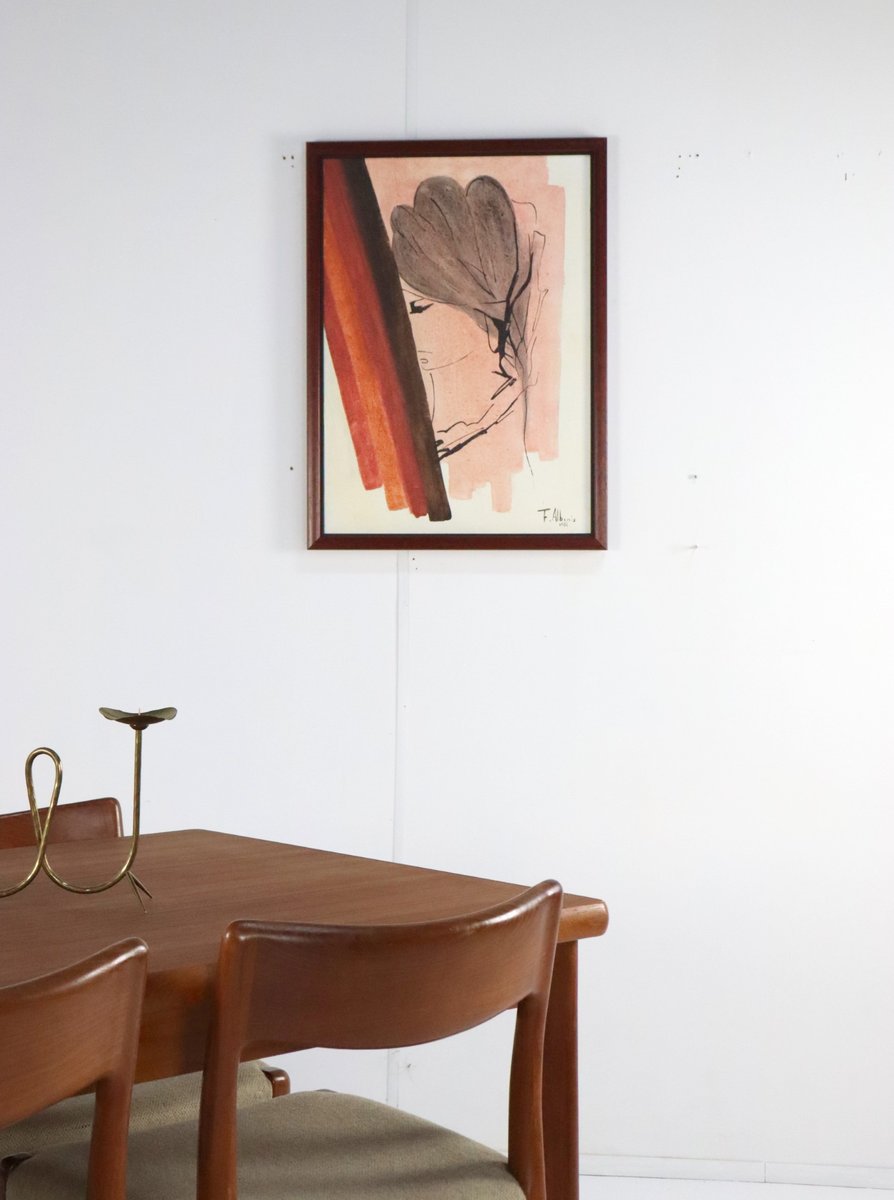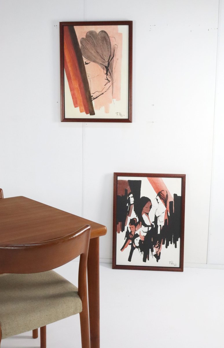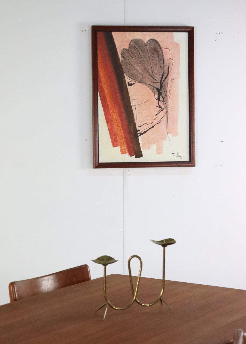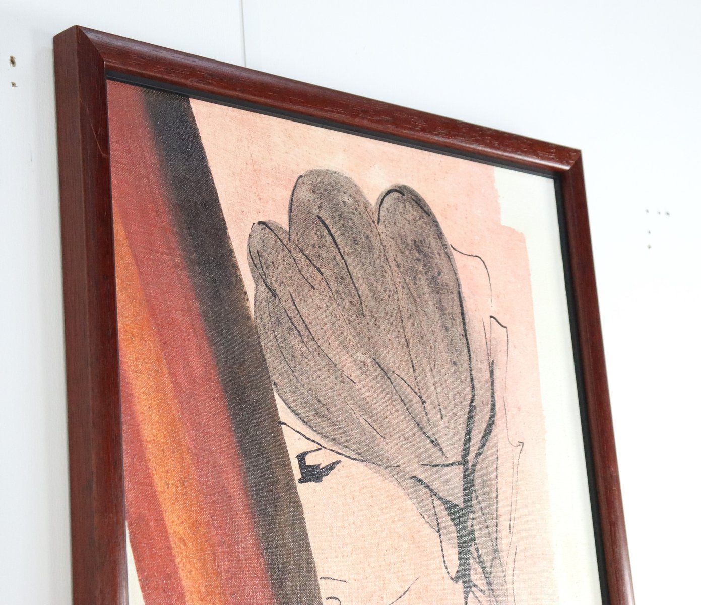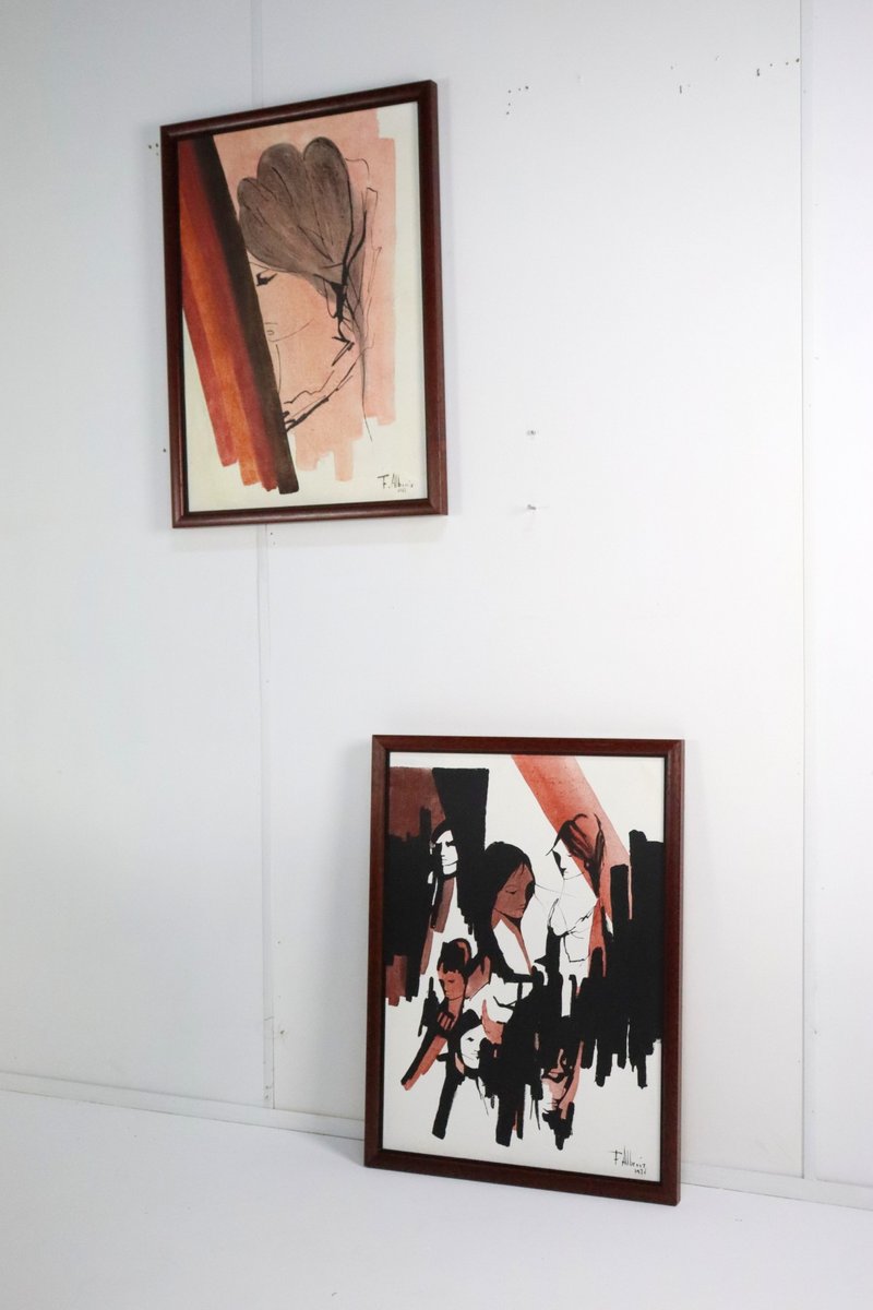 The painting by Fernando Alzamora Albeniz that we offer here shows an abstract composition with a large, half-hidden female figure in the center. This figure has a dark outline and is placed against a background and foreground of warm tones, ranging from beige to deep red and brown. There are also some darker, linear strokes that add to the abstract nature of the work. The artist's signature, “F. Albeniz,” is visible in the bottom right corner as well as the year 1977. About Fernando Alzamora Albeniz Fernando Alzamora Albeniz is a Spanish artist (1927) known for his often somewhat abstract works. His paintings are characterized by the use of female figures and a rich but warm color palette. He often plays with color and shape to create a sense of movement and depth in his works. Albeniz's style invites the viewer to make their own interpretations, making each piece a unique experience. His work is often inspired by nature and human emotion, resulting in art that is both visually appealing and profound. Albeniz's works are loved by collectors worldwide and are rapidly becoming increasingly popular. Due to their beautiful colors and wide applicability within various popular living styles, his work is now more appreciated than ever before. In this , only the work visible in photo 1 is offered. The other works are offered separately. Country of origin: Spain Artist: Fernando Alzamora Albeniz Year: 1977 Height: 76 cm Width: 55.5 cm Depth: 3 cm