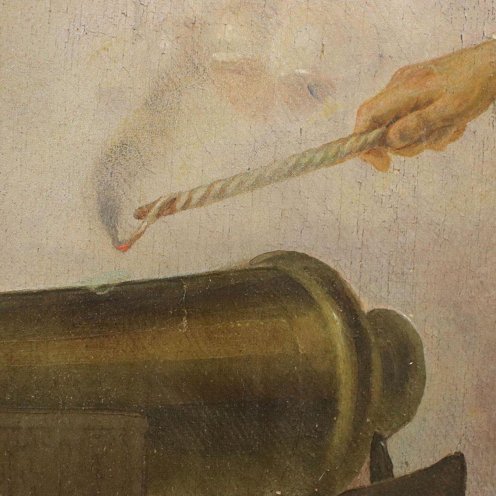 Al di fuori delle fortificazioni di una città un condottiero, attorniato dai suoi soldati, si accinge ad accendere la miccia del cannone. L'esercito difende la cittadella al di fuori delle mura e i soldati scrutano l'orizzonte guardando verso il basso: ciò induce a collocare la scena sulle fortificazioni di una città, in particolare di quelle di Genova che si ergono sulle montagne retrostanti e dalle quali i genovesi difendevano la città dagli attacchi provenienti dal mare; la collocazione a Genova è avallata dallo stendardo che sventola sulle mura, la Croce di San Giorgio (croce rossa in campo bianco) vessillo della Repubblica di Genova. La foggia delle armature, delle armi e delle vesti rimanderebbe all'assedio di Genova del 1522.