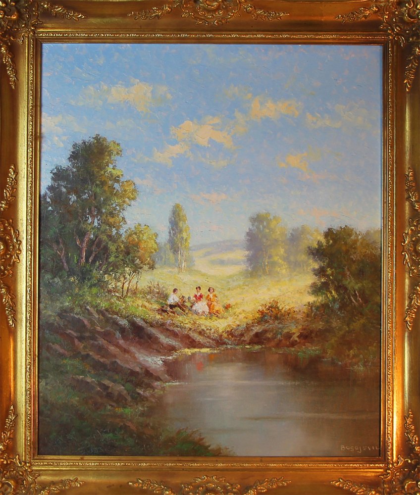 This captivating oil painting, created around the 1960s by the esteemed artist Hans Bogojevic (1894-1967), depicts a delightful lakeside picnic scene.