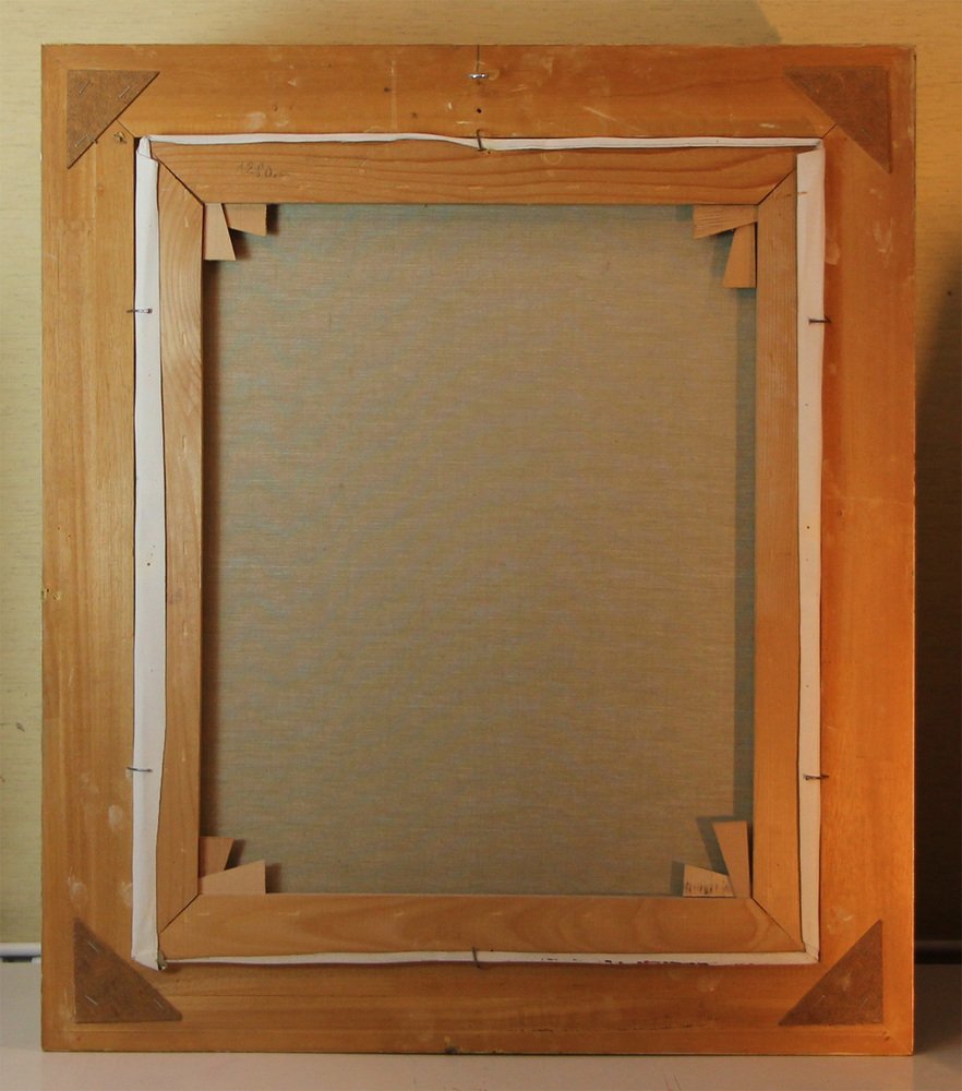 Executed on canvas with oil paints, the painting is framed in a high-quality baroque-style frame.