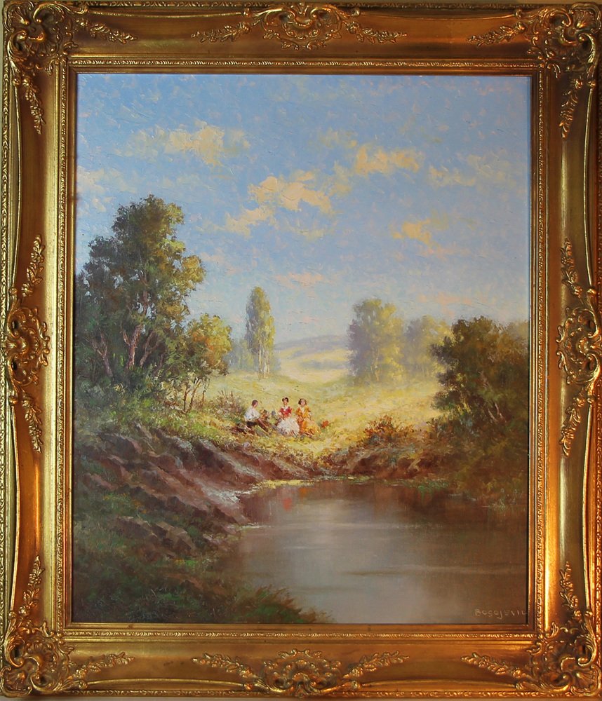 Questo affascinante dipinto a olio, realizzato intorno agli anni Sessanta dallo stimato artista Hans Bogojevic (1894-1967), raffigura una deliziosa scena di picnic in riva al lago.