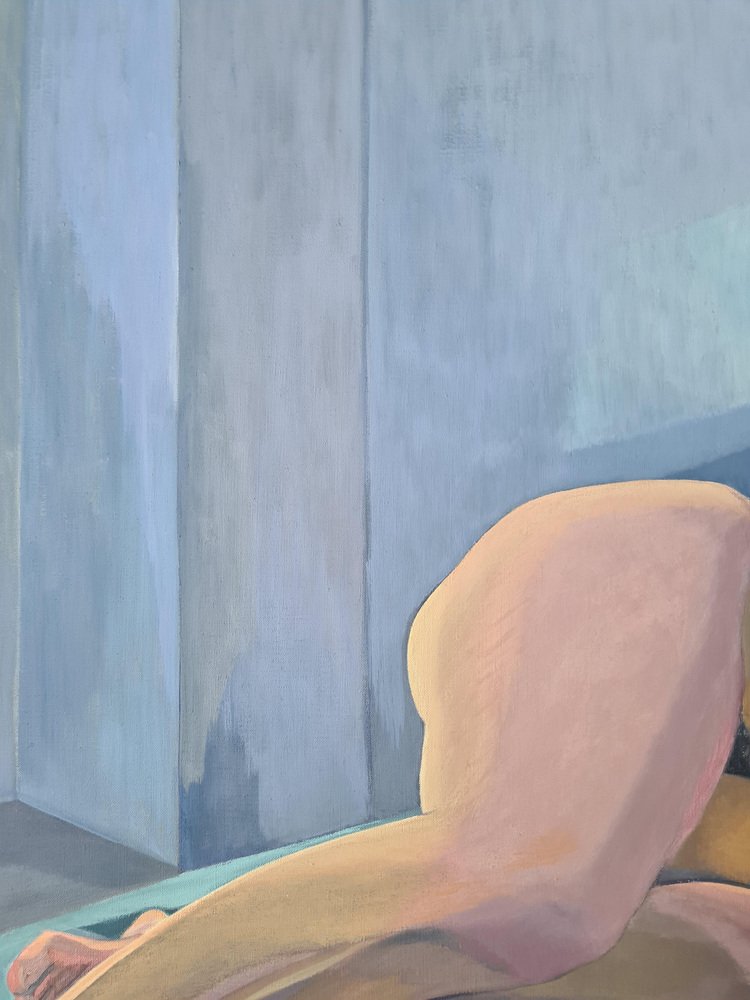 Questo dipinto forte e d'impatto ritrae una figura femminile nuda e reclinata, che emana tranquillità e vulnerabilità. La figura, resa in toni morbidi e tenui, poggia su un'audace superficie turchese, in contrasto con le verticali rosse e blu dello sfondo. L'uso di luci e ombre accentua le curve aggraziate del corpo, evidenziando l'abilità dell'artista nel catturare forma e profondità. La composizione è allo stesso tempo intima ed espansiva, con la posa rilassata della figura che invita alla contemplazione. L'interazione dei colori, dalle tonalità calde della pelle a quelle fredde dell'ambiente circostante, crea un equilibrio armonioso. La miscela unica di realismo e astrazione dell'opera invita gli spettatori a esplorare le sottili sfumature emotive che trasmette.