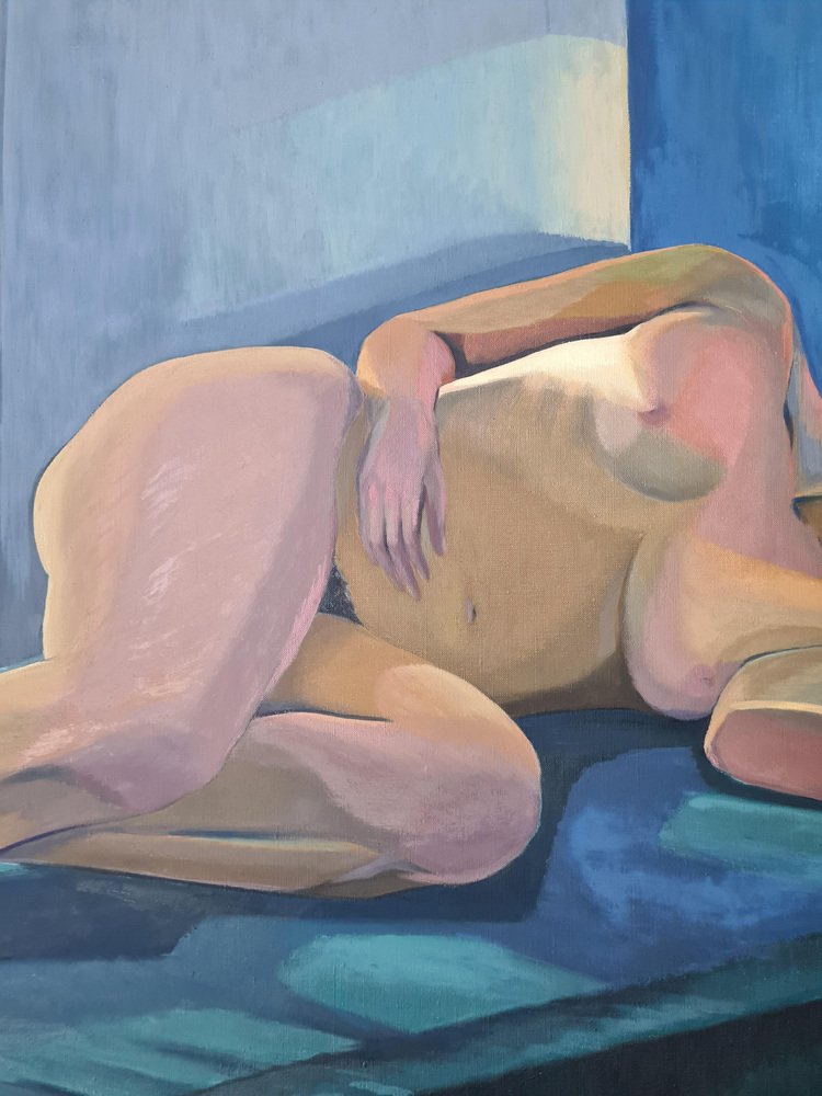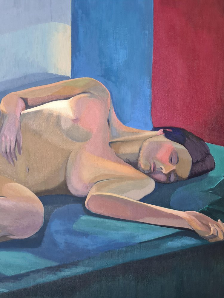 This strong and impactful painting portrays a reclining female nude figure, exuding tranquillity and vulnerability. The figure, rendered in soft, muted tones, rests on a bold turquoise surface, contrasting with the stark red and blue verticals in the background. The use of light and shadow accentuates the graceful curves of the body, highlighting the artist's skill in capturing form and depth. The composition is both intimate and expansive, with the figure's relaxed pose inviting contemplation. Notably, the interplay of colours, from the warm skin tones to the cool surrounding hues, creates a harmonious balance. The artwork’s unique blend of realism and abstraction invites viewers to explore the subtle emotional nuances it conveys.