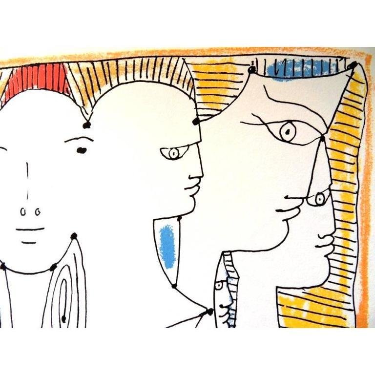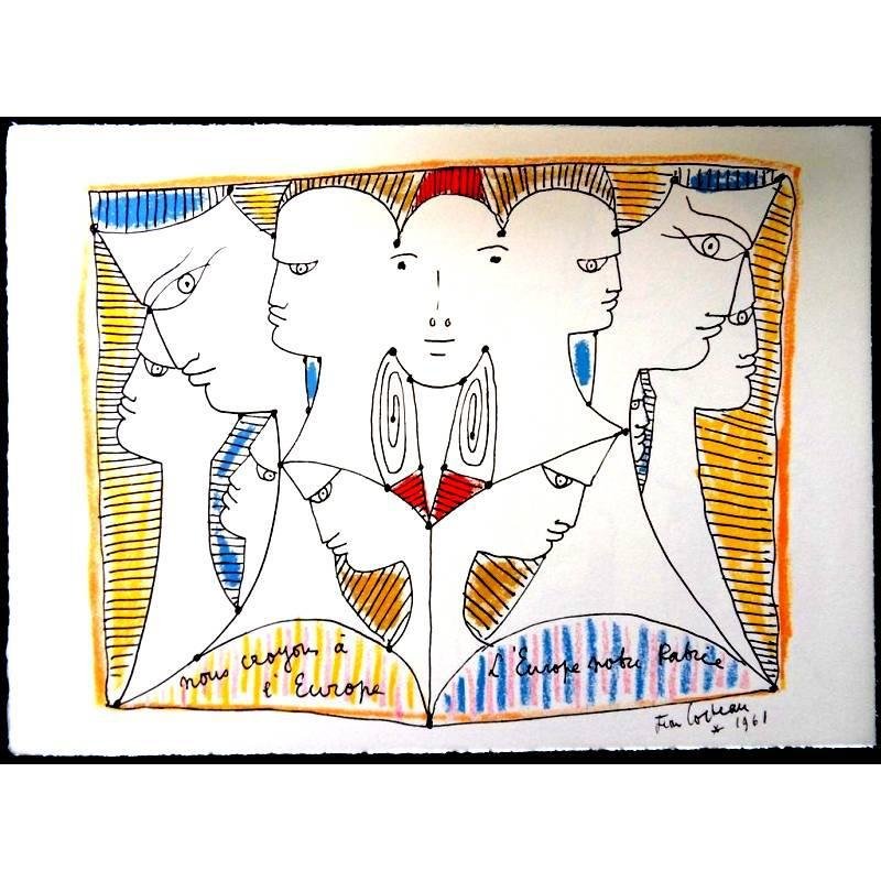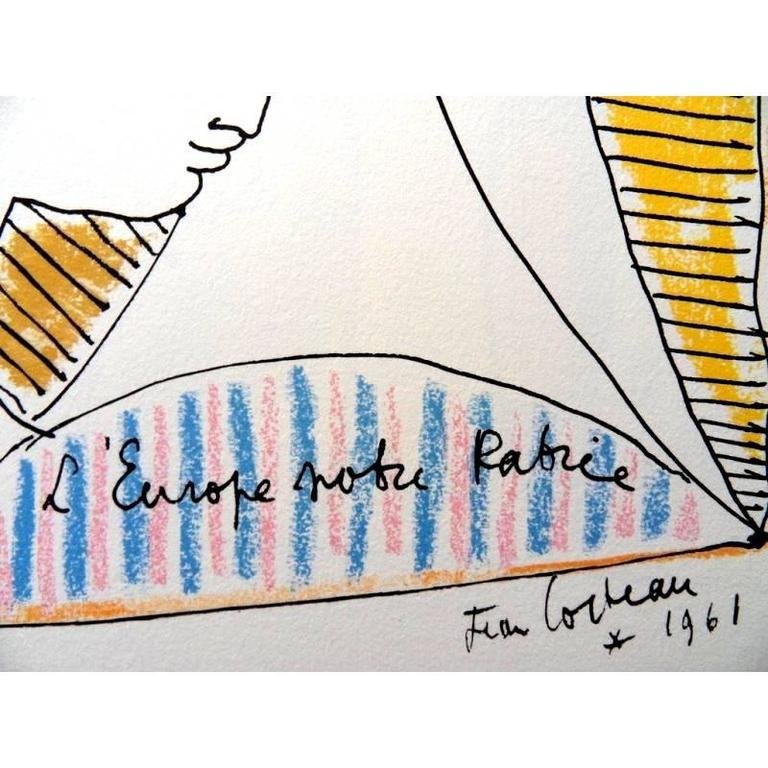 Original Lithograph by Jean Cocteau Title: Europe's Diversity Signed in the plate Dimensions: 33 x 46 cm Edition: 200 Luxury print edition from the portfolio of Sciaky 1961 Jean Cocteau Writer, artist and film director Jean Cocteau was one of the most influential creative figures in the Parisian avant-garde between the two World Wars. “The poet never asks for admiration; he wants to be believed.” —Jean Cocteau Synopsis Jean Cocteau was born on July 5, 1889, in Maisons-Laffitte, France. He spent most of his life in Paris, where he became part of the artistic avant-garde and was known for his variety of accomplishments. Over a 50-year career, he wrote poetry, novels and plays; created illustrations, paintings and other art objects; and directed influential films, including The Beauty and the Beast and Orpheus. He died on October 11, 1963. Early Life and Literary Debut Jean Cocteau was born on July 5, 1889, in Maisons-Laffitte, France, a village 12 miles outside Paris, to Georges and Eugénie (née) Lecomte Cocteau. He and his two older siblings were brought up in comfortable household in Paris, where they were introduced to the arts by their parents. Their father, a lawyer and amateur artist, committed suicide in 1898. After his father's death, Cocteau was raised by his mother and his maternal grandfather. He attended school at the Lycée de Condorcet in Paris and he showed an early talent for writing. When he was just 18, his poetry was read aloud in performance arranged by the well-known actor Edouard de Max, and he became the toast of literary Paris. His first book of poems, La Lampe d'Aladin (Aladdin's Lamp), was published a year later, in 1909. Cocteau and the Parisian Avant-Garde In the 1910s, Cocteau formed friendships with many prominent members of the Parisian avant-garde, including writer Guillaume Apollinaire and artists Amedeo Modigliani and Pablo Picasso. He was so impressed by seeing the dancer Vaslav Nijinsky perform with the Ballets Russes that he met the company's founder, Sergei Diaghilev, and asked to work with him. Cocteau designed posters for the Ballets Russe, and in 1917 he was one of the collaborators on the ballet Parade: Cocteau wrote the story, Erik Satie composed the music, Léonide Massine choreographed the dance and Picasso designed the set and costumes. Cocteau's activities of the 1920s were remarkably varied. He composed opera libretti for several composers. He published collections of poetry and illustrations as well as a novel inspired by his experiences during World War I. He staged a ballet called Le Boeuf Sur le Toit (The Ox on the Roof) and directed modern adaptations of several classic dramas. He promoted the work of young writer Raymond Radiguet, with whom he fell in love. When Radiguet died of typhoid fever, Cocteau was despondent and tried to console himself by taking opium. Filmmaking In 1930, Cocteau wrote and directed his first motion picture, the silent, surrealistic film Le Sang d'un Poète (The Blood of a Poet). Like many of his signature works, it portrayed a creative artist's encounters with love and death. After a 16-year interval, Cocteau made his most famous film, La Belle et la Bête (The Beauty and the Beast), a retelling of a classic fairy tale. This motion picture, starring Josette Day and Jean Marais, would inspire many other filmmakers with its dreamlike atmosphere and surrealistic special effects. Cocteau went on to write and direct several other films in the 1940s. Later Years Cocteau returned to the subject of the solitary artist-poet in his film Orphée, a surreal adaptation of the ancient Greek myth of Orpheus starring Jean Marais. He completed his ''Orpheus trilogy'' in 1960 with Le Testament d'Orphée (The Testament of Orpheus), in which he played a poet much like himself. In his late years, Cocteau was also famous just for being Cocteau: He had rightfully gained a reputation as one of the most versatile and influential creative minds of his era. In 1955, he was inducted into the Academie Française. Cocteau died of a heart attack at the age of 74, on October 11, 1963, at his chateau in Milly-la-Forêt, France.