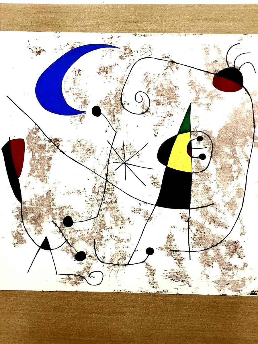 Joan Miro - Luna e sole - Pochoir Dalla rivista letteraria ''XXe Siècle'' 1957 Dimensioni: 32 x 24 cm Editore: G. di San Lazzaro. Biografia Joan Miró i Ferrà (20 aprile 1893 - 25 dicembre 1983) è stato un pittore, scultore e ceramista catalano spagnolo di fama mondiale, nato nella città portuale di Barcellona. Figlio di un padre orologiaio e di una madre orafa, Miro fu esposto alle arti fin dalla più tenera età. Sono stati recuperati alcuni disegni di Miro risalenti al 1901, quando aveva solo 8 anni. Miro si iscrisse alla Scuola di Arti Industriali e Belle Arti di Barcellona fino al 1910; durante la sua frequenza ebbe come insegnanti Modest Urgell e Josep Pascó. Dopo aver superato un grave attacco di febbre tifoidea nel 1911, Miro decise di dedicarsi interamente alla pittura frequentando la scuola d'arte di Francesc Galí. Studia alla Scuola di Belle Arti La Lonja di Barcellona e nel 1918 allestisce la sua prima mostra individuale nelle Gallerie Dalmau, nella stessa città. Le sue opere prima del 1920 (data del suo primo viaggio a Parigi) riflettono l'influenza di diverse tendenze, come i colori puri e brillanti usati nel fauvismo, le forme prese dal cubismo, le influenze dell'arte folclorica catalana e gli affreschi romani delle chiese. Il suo viaggio a Parigi lo introdusse e sviluppò la sua tendenza alla pittura surrealista. Nel 1921, espose la sua prima mostra individuale a Parigi, alla galleria La Licorne. Nel 1928, espose con un gruppo di surrealisti nella Galleria Pierre, sempre a Parigi, anche se Miró doveva sempre mantenere le sue qualità indipendenti rispetto ai gruppi e alle ideologie. A partire dal 1929-1930, Miró comincia ad interessarsi all'oggetto in quanto tale, sotto forma di collage. Una pratica che lo porterà a realizzare sculture surrealiste. In questo decennio appaiono i suoi mostri tormentati, che danno luogo al consolidamento del suo vocabolario plastico. Sperimentò anche molte altre forme artistiche, come l'incisione, la litografia, i colori ad acqua, i pastelli e la pittura su rame. Di questo periodo si evidenziano in particolare i due murales in ceramica che realizzò per il palazzo dell'UNESCO a Parigi (The Wall of the Moon e the Wall of the Sun, 1957-59). Murale UNESCO di Joan Mirò - "La Luna e il Sole" È alla fine degli anni 60 che si segna il suo ultimo periodo, che durerà fino alla sua morte. Durante questo periodo si concentrò sempre più su opere monumentali e pubbliche. Si caratterizzò per il linguaggio corporeo e la freschezza con cui eseguiva le sue tele, così come l'attenzione speciale che prestava alla materia e il timbro che riceveva dall'informalismo. Concentrava il suo interesse sul simbolo, non dando troppa importanza al tema rappresentativo, ma al modo in cui il simbolo emergeva come opera. Mirò aveva uno stile molto eccentrico che è l'incarnazione del suo approccio unico alla sua opera d'arte. Nel 1976 fu ufficialmente aperto nella città di Barcellona il Centro di Studi di Arte Contemporanea della Fondazione Joan Miró e nel 1979, quattro anni prima della sua morte, fu nominato dottore honoris causa dall'Università di Barcellona.