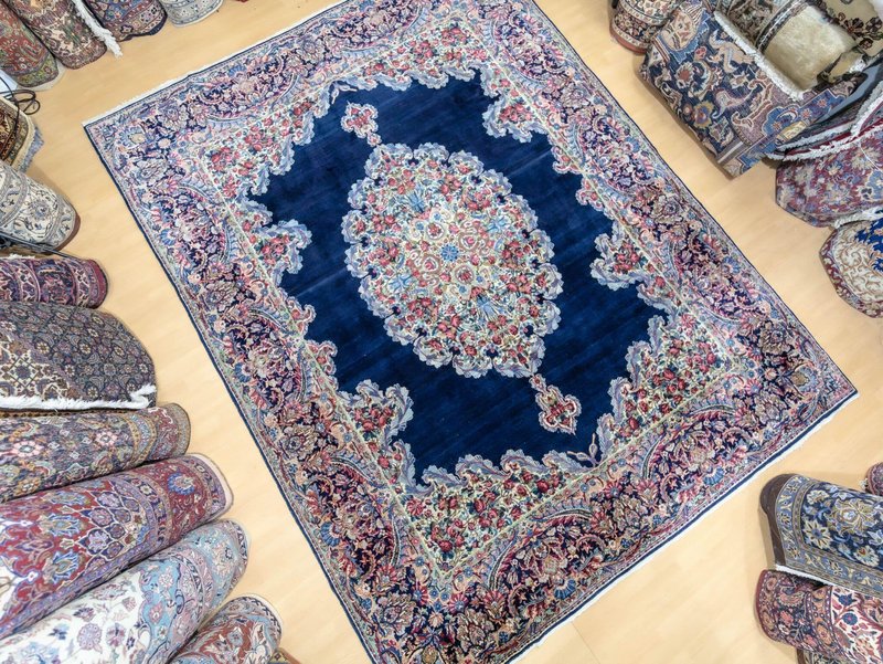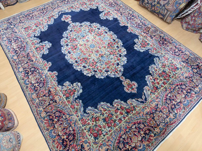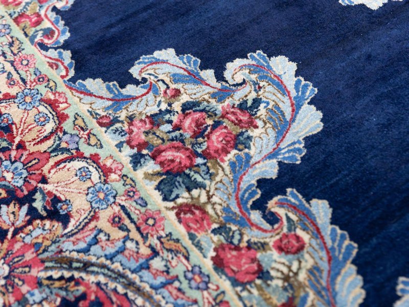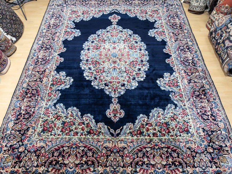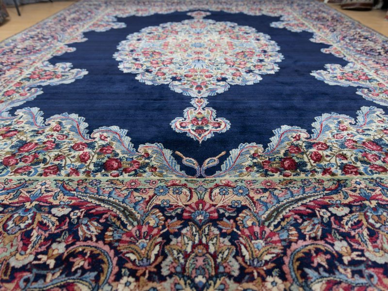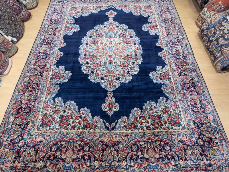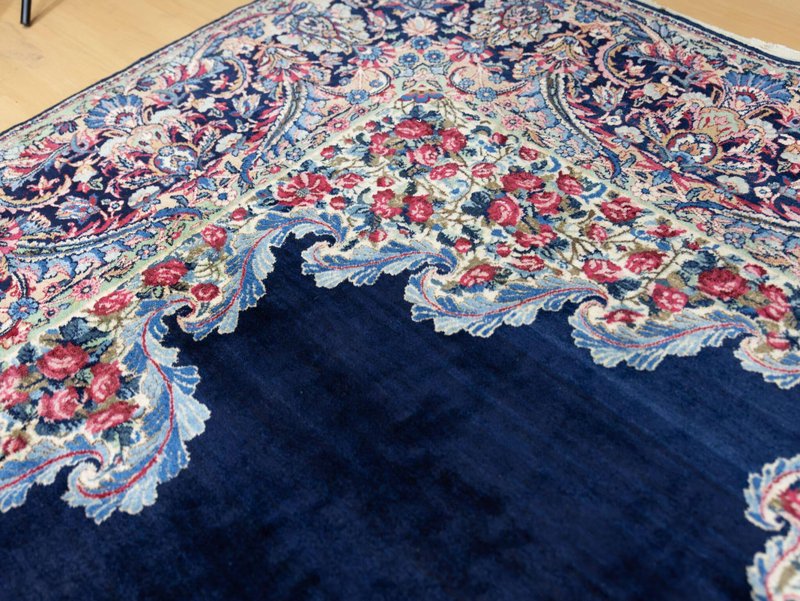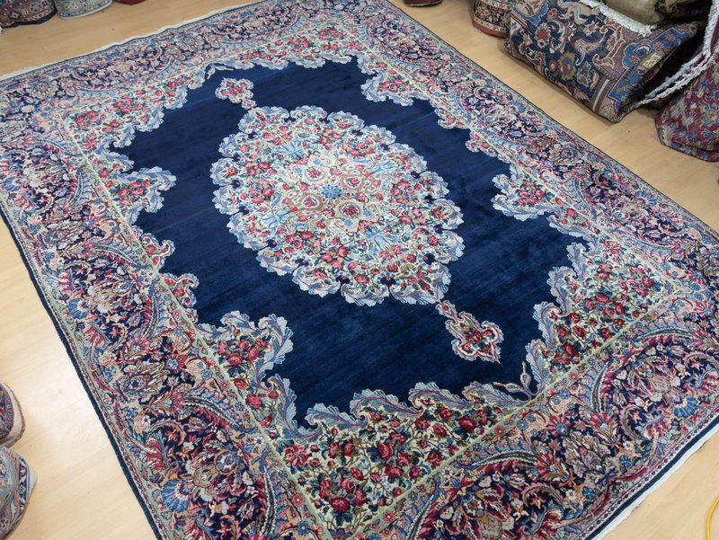 Knotendichte: 300000-360000 pro Quadratmeter | 342 × 212 cm | ORIGINAL Kirman Kusheh Anguri Motiv | Handgeknüpfter Perserteppich aus ORIGINAL Iran (kein Replika – historische Kirman-Muster wurden häufig kopiert) | Minimal Patina, auf Wunsch Renovierung möglich | Flor: Hochwertige Wolle | Zustand: Top | Herkunft: Kirman, Iran The YouTube link with the complete video tour can be found in the gallery as well as a product link on our website. Important note: Antique and original Kirman carpets like this one are rare. Mass-produced copies cannot achieve the quality or historical depth of a genuine Kirman original. Description Original Kirman Persian carpet – 342 × 212 cm This extraordinary specimen is a authentic Kirman Persian rug From Iran, hand-knotted in the traditional way. The pattern shows the well-known historical design. Kusheh Anguri Motif (Grape cluster), a particularly popular and original motif from Kirman. The piece dates from 1970–1980 and is located in a Top condition with minimal patina. Hand-knotted – Traditional Kirman craftsmanship Each knot of this rug was individually tied by hand, using centuries-old techniques. The pile is made of high-quality wool and is dense, stable, and durable. This results in a rug that is not only visually impressive but also retains its shape and beauty for decades and generations to come. Minimal patina – historical character The rug displays a light, natural patina that emphasizes its historical character. Professional restoration can be carried out upon request for an additional fee. However, we recommend leaving the piece in its original condition to preserve its historical value and authenticity. Due to its high degree of originality and popular pattern, this rug is particularly attractive to collectors and enthusiasts of antique Kirman rugs. Original vs. Replica – A crucial difference Kirman patterns were widely copied both within and outside of Iran. This example is a genuine original – not a replica – and is certified and verified by us. Copies cannot achieve the quality, density, or historical depth of a genuine Kirman carpet. Condition – Excellent condition The surface is soft, dense, and even. The pattern is clear and vibrant, and the edges and fringes are sturdy. This piece is suitable both as a decorative collector's item and for everyday use in living spaces, galleries, or representative areas. Decorative effect – timeless and popular The Kusheh Anguri pattern is known for its harmonious composition and fine detailing. The color combinations of blue and subtle contrasts create an elegant, classic, and timeless look. It's a striking feature in any room, blending traditional character with vibrant presence. FAQ 1. Is this rug a genuine original from Kirman? Yes. This piece is 100% from Kirman, Iran, and is a historical original with an authentic Kusheh Anguri motif – not a replica. 2. Can the carpet be renovated? Yes, it can be professionally renovated upon request for an additional fee. However, we recommend leaving the carpet in its original condition to preserve its historical patina and value. 3. Why are Kirman patterns so sought after? Kirman carpets are known for their exceptional knot density, craftsmanship, and timeless patterns. Historical originals are rare and possess high cultural and collector value.