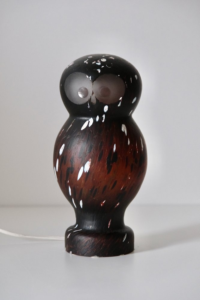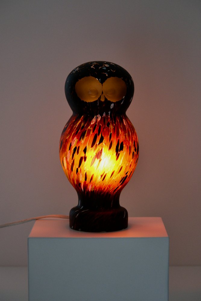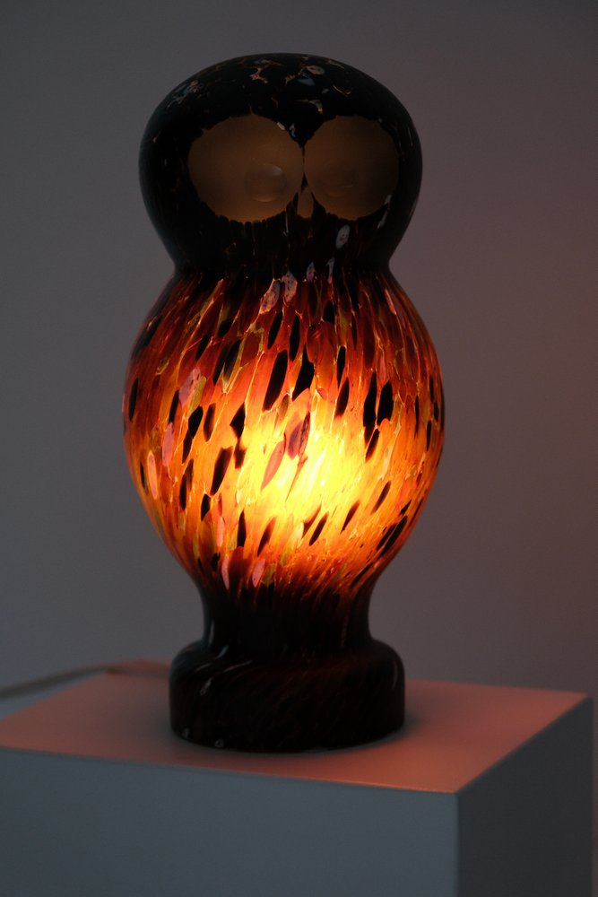 The Glass Owl Lamp features a hand-blown glass owl as the base, with its body serving as the lampshade. The Glass Owl Lamp in the style of Monica Backström is a perfect addition to any interior decor, whether it be a modern, Scandinavian, or eclectic style. It adds a touch of nature-inspired beauty and a sense of wonder to any room. This lamp is not only a functional lighting source but also a conversation piece that will captivate anyone who sees it.