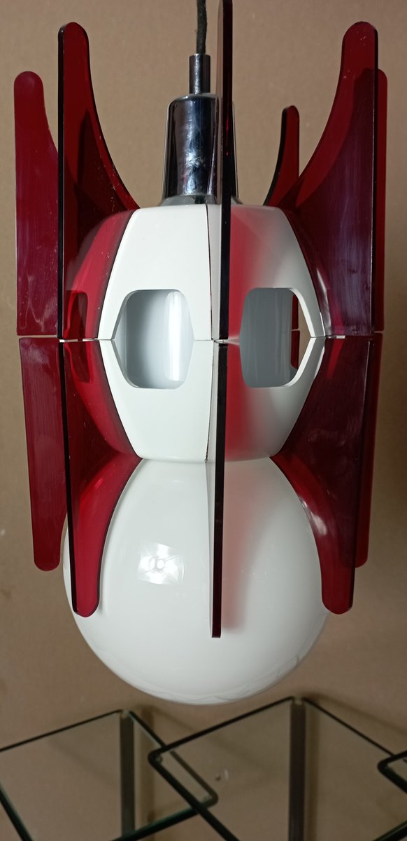 This authentic vintage pendant lamp encapsulates the space aesthetic that defined the 1960s. Its futuristic design combines elegance and originality, making it a must-have for lovers of decor with history. The white central structure, enriched with red details, evokes rocket or spaceship shapes, capturing the fascination with space exploration of its time.