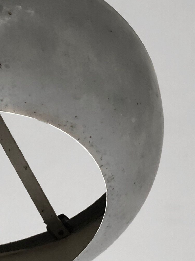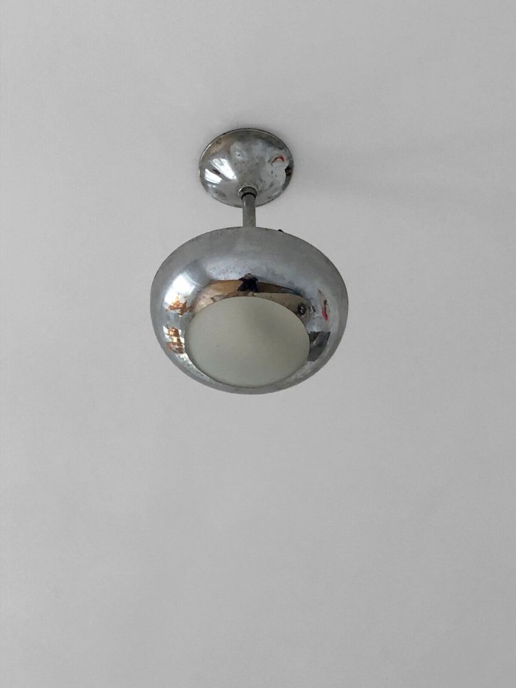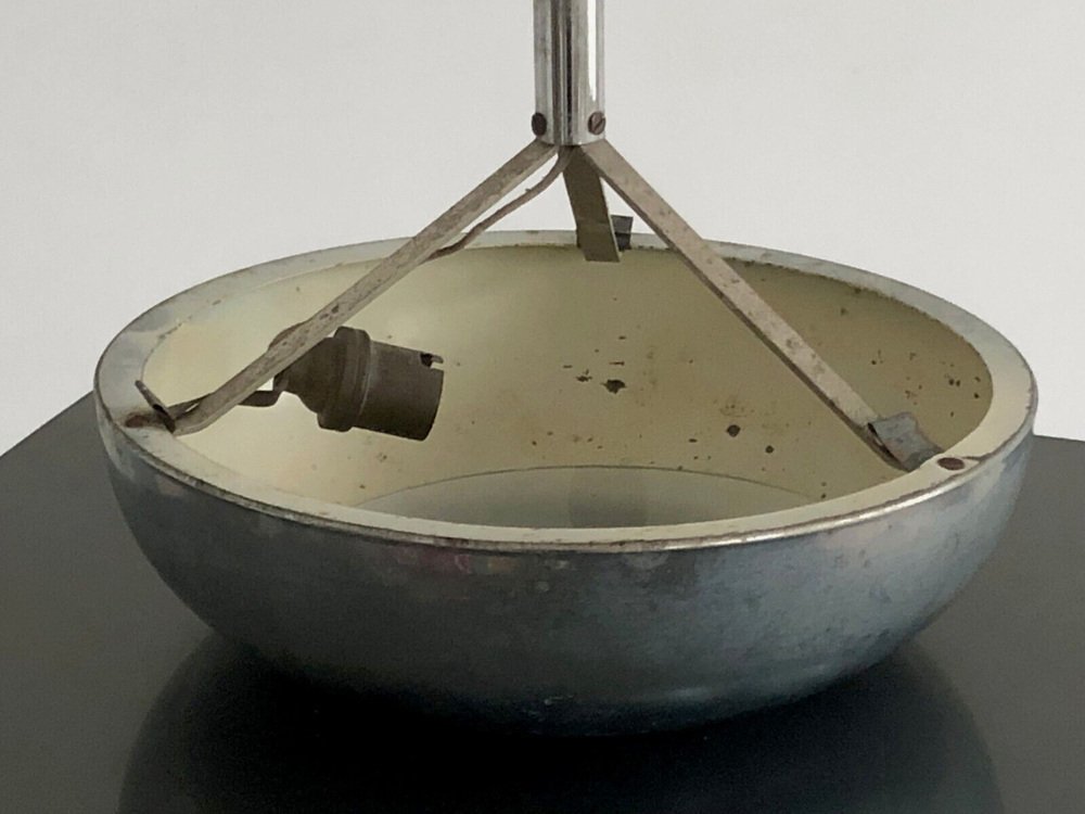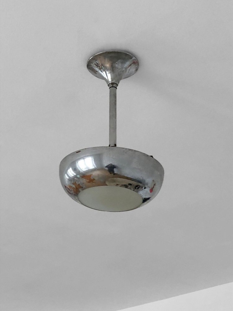 One (of 2 identical pieces forming a possible pair) small circular chandelier or suspension, Art-Deco, Modernist, Cubist, Constructivist, in nickel-plated brass, half-sphere in nickel-plated brass open on a rounded diffuser in sandblasted glass, the whole suspended by 3 metal rods on a tubular axis with orifine bail cover, to be attributed, France 1930.