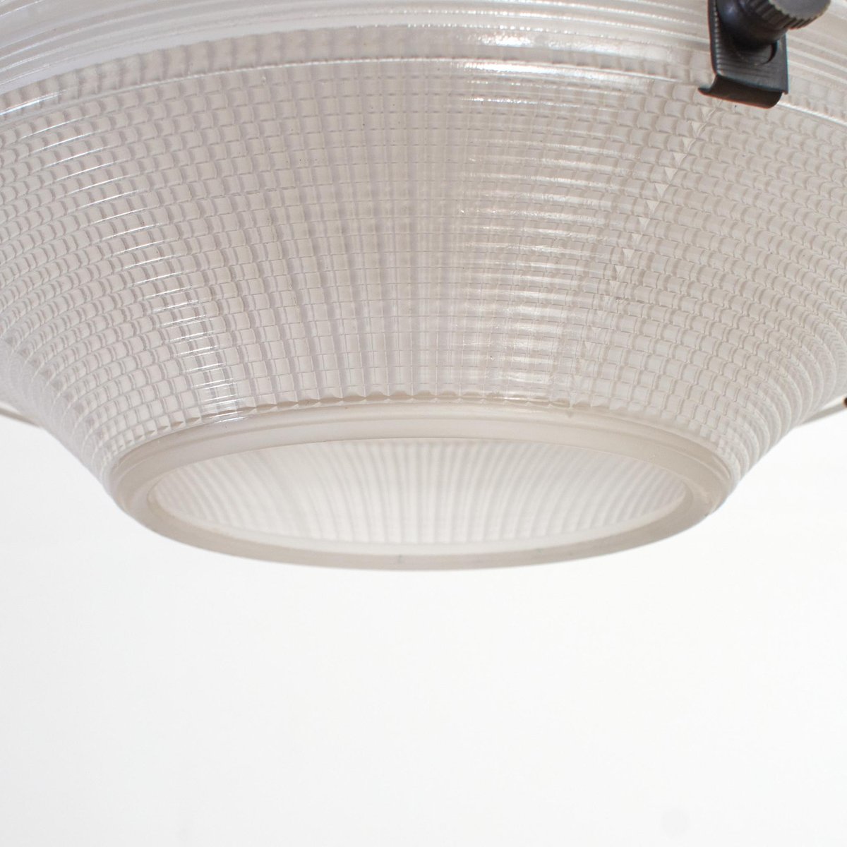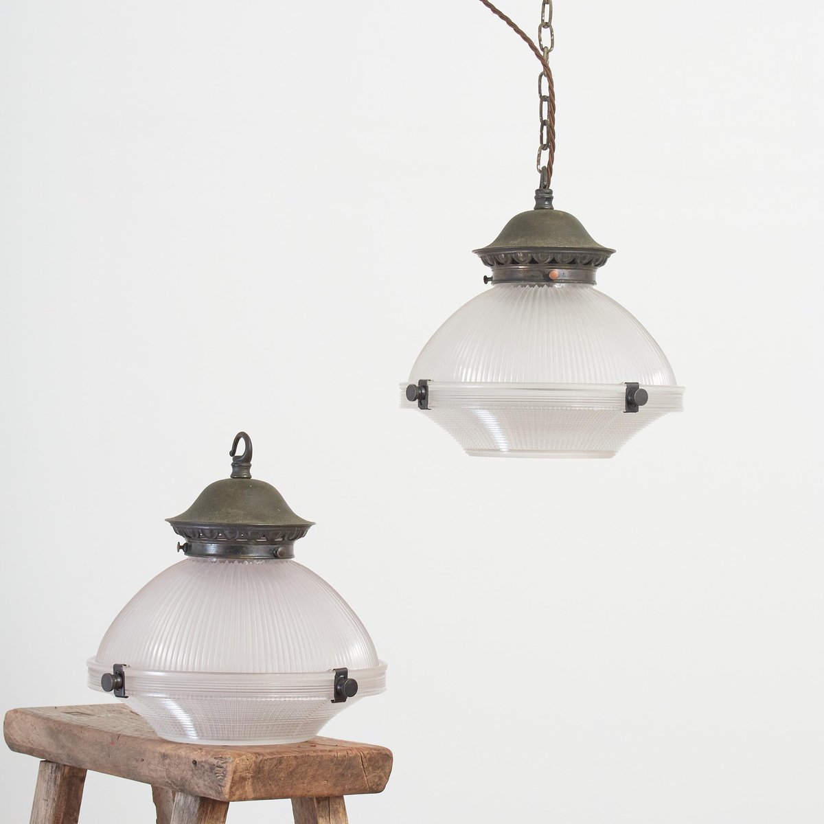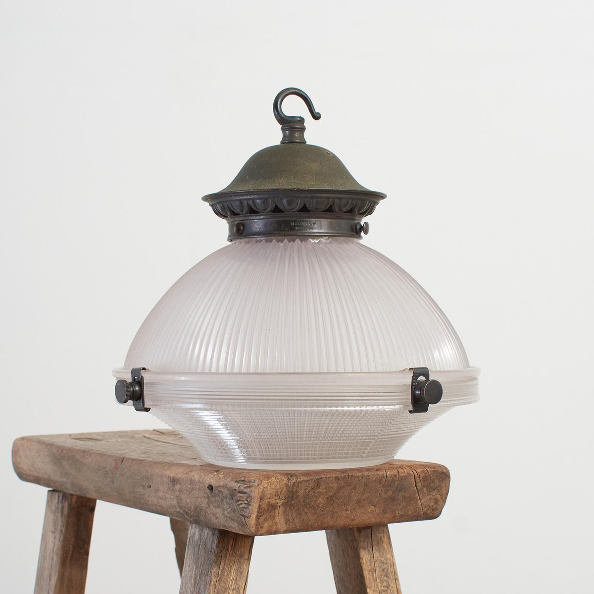 Antique Holophane Church Pendant 2 Part Reflector Light – D An original Holophane ‘Reflector Refractor’ glass pendant light retaining its original gallery and components. The metalwork has been left in its original condition. This 2 part type glass prismatic pendant retain its original Holophane makers mark to the glassware along with a stamp to the The crisp clean lines create a beautiful glow when illuminated. Holophane glass was invented in the 1890s and was made in many shapes, sizes and patterns to provide specific types of illumination, these particular ones were used in a church. Dimensions: Height: cm Diameter : cm Origin: Chapel, Cheltenham, UK Circa: 1930s Workshop Report: The workshop team inspect all products and perform any necessary repairs to ensure many more years of future use, with lighting we deep clean the shades and professionally remove all existing electrical components and fit new CE certified electrical fittings. This light is supplied with new period style brown twisted 3 core fabric flex and CE certified E27 bayonet lampholder. Lights can take up to 100W Equivalent LED bulb. We can wire for the US with UL Certified flex and bulb holder if required.