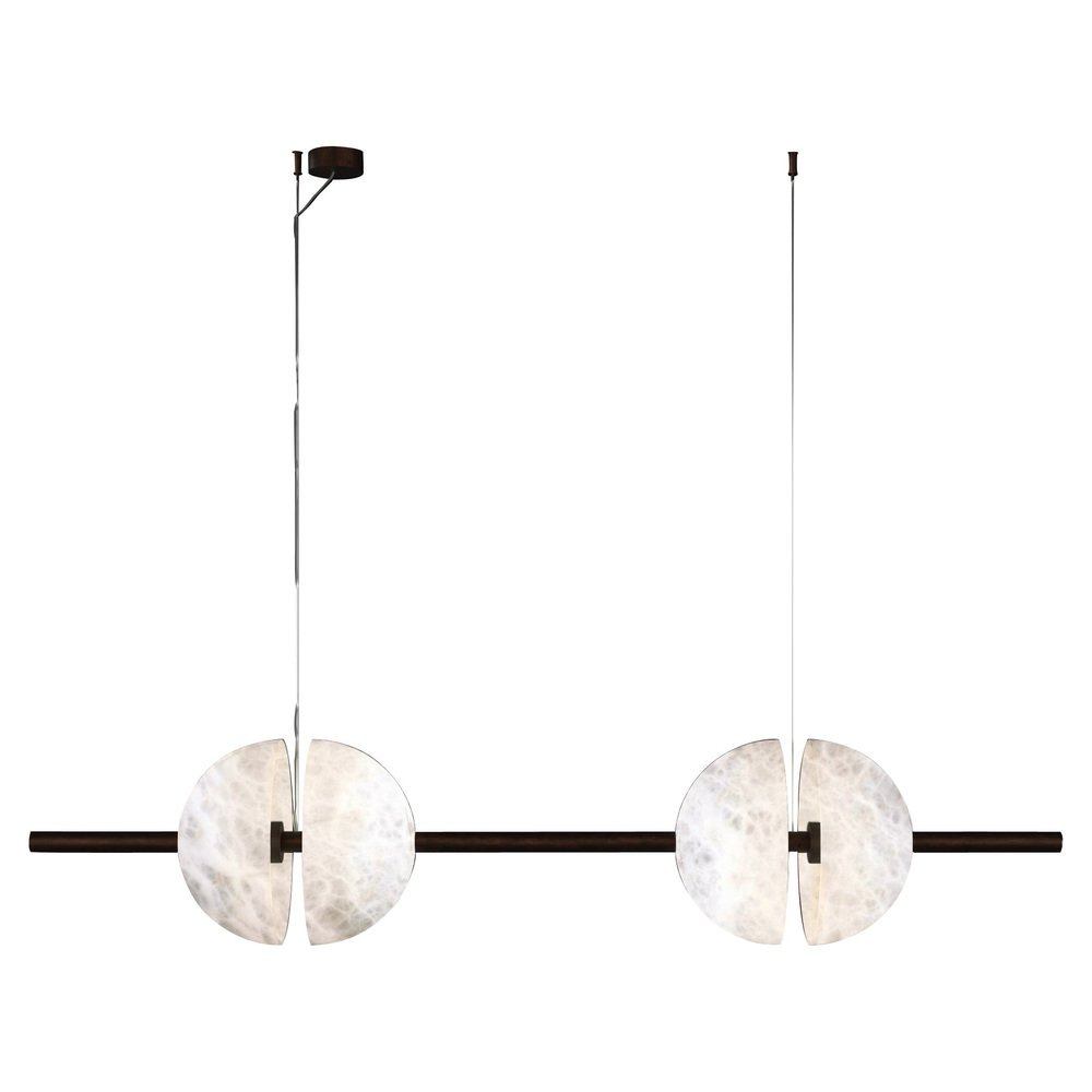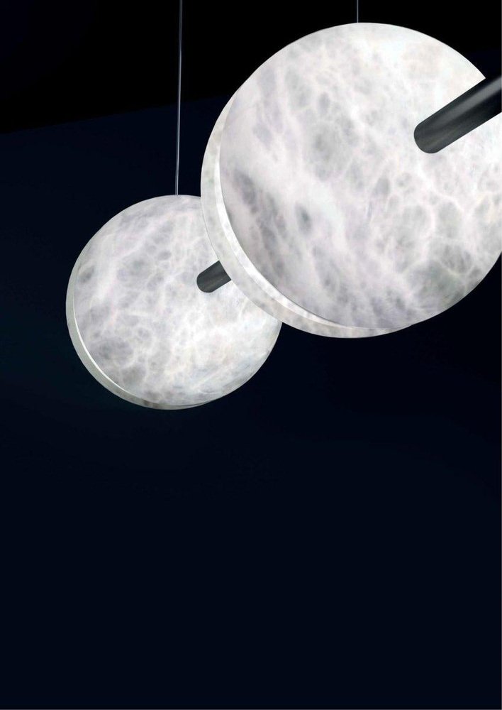 Ermes Ruggine Of Florence And Alabaster Pendant Light 1 by Alabastro Italiano Dimensions: D 30 x W 150 x H 300 cm. Materials: White alabaster and ruggine of Florence metal. Available in different finishes: Shiny Silver, Bronze, Brushed Brass, Ruggine of Florence, Brushed Burnished, Shiny Gold, Brushed Black, Freedom Green, Shiny Black and Copper. Please contact us. All our lamps can be wired according to each country. If sold to the USA it will be wired for the USA for instance. Ermes, known as the messenger of the gods, is the deity this line is inspired by. A tubular element supports and connects four alabaster half spheres, through this play of symmetries and correspondences we want to reproduce the idea of communication, a moment of meeting between division and union; it is also no coincidence that Hermes is the god of travel and borders. After years of experience in the family business, which specializes in design and lighting, Riccardo and Alberto Ongarato found the brand Alabastro Italiano. Each project is conceived and designed to give a strong sign of recognizability and uniqueness. The use of precious materials such as alabaster, brass, leather and blown glass, worked by the skilful hands of our craftsmen, are combined to create “timeless” objects. from the depths of the earth to the light of the sun. ALABASTRO ITALIANO care about these extremes and transcends them in a creative dynamic that emphasizes simplicity and clean-cut lines. The company has created an entirely new project MADE IN ITALY, revolutionizing the previously existing collections into eternal and evergreen lighting elements. By designing clean-cut and original lines, built-in with the latest technology and continuously innovating, ALABASTRO ITALIANO has never lost sight of its goal: perfection. The result of this work is an extraordinary collection of alabaster lightings. Alabaster needs human hands to come to life. The charm of these stone objects comes from their uniqueness, from the fact that they come from the hand of those who has left a mark and a memory with their work, each grain makes each piece unique. Alabaster needs human hands to come to life. The charm of these stone objects comes from their uniqueness, from the fact that they come from the hand of those who has left a mark and a memory with their work, each grain makes each piece unique. Alabaster is a Material that leaves little traces of magic all around it. It is difficult to identify the exact point where the Material ends and its reflection begins. It is impossible to understand how far the light sinks in its soft transparency. It changes according to the positions in which it is placed, depending on the point of view. Alabaster is a compact and rare stone that lays down very precise laws requires a familiarity that only Italian craftsmen possess. Alabastro Italiano collaborates with each client to create a unique project. Starting from the advice for better architectural lighting, it brings its know-how, materials, design and creative inspiration to interior architects and interior designers.