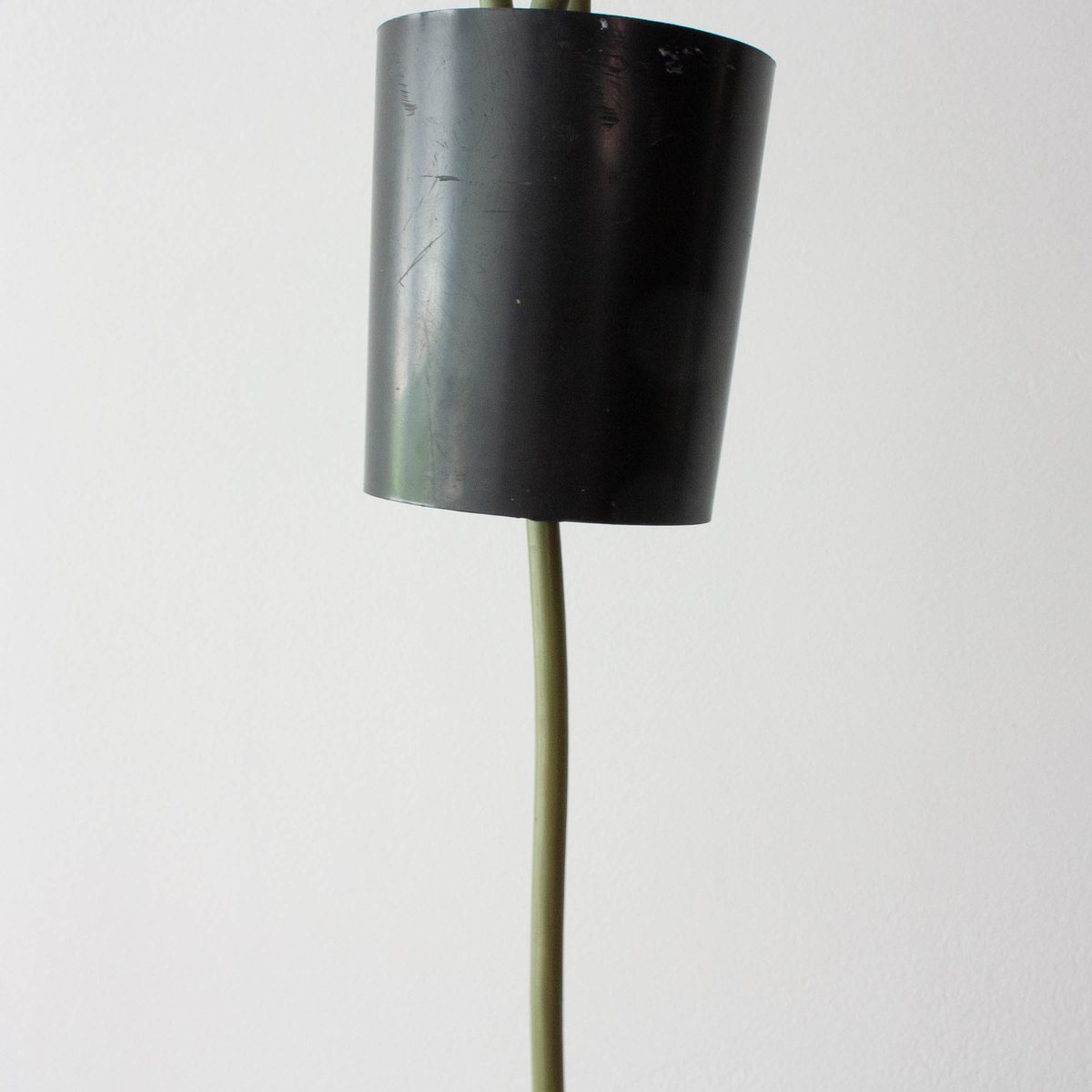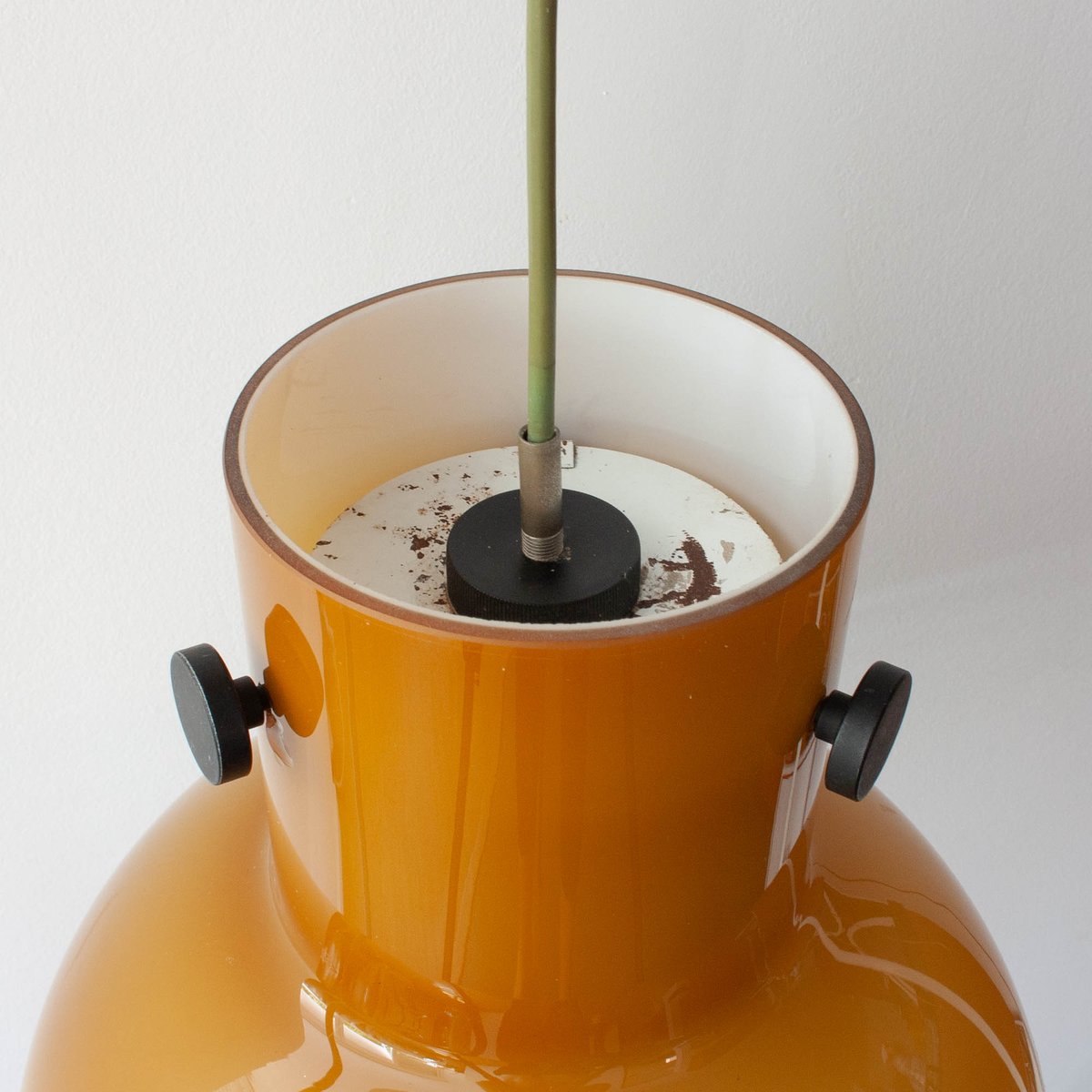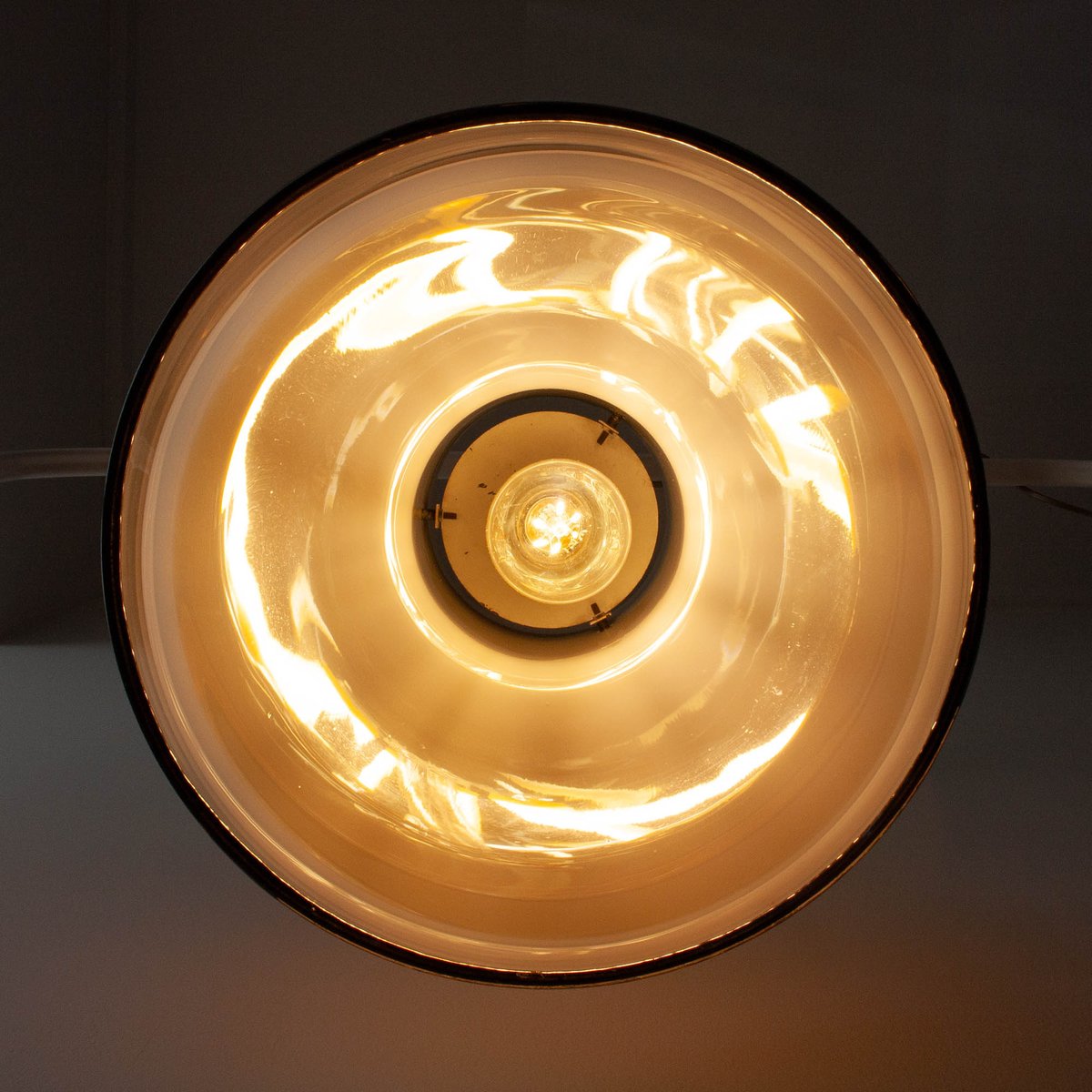 In original and good vintage condition. The glass has a small chip close to one of the black metal fitting, barely noticeable when it's mounted. The rubber finish is with a bit of wear. Inside, in the bulb fitting is the original label from Peill & Putzler.