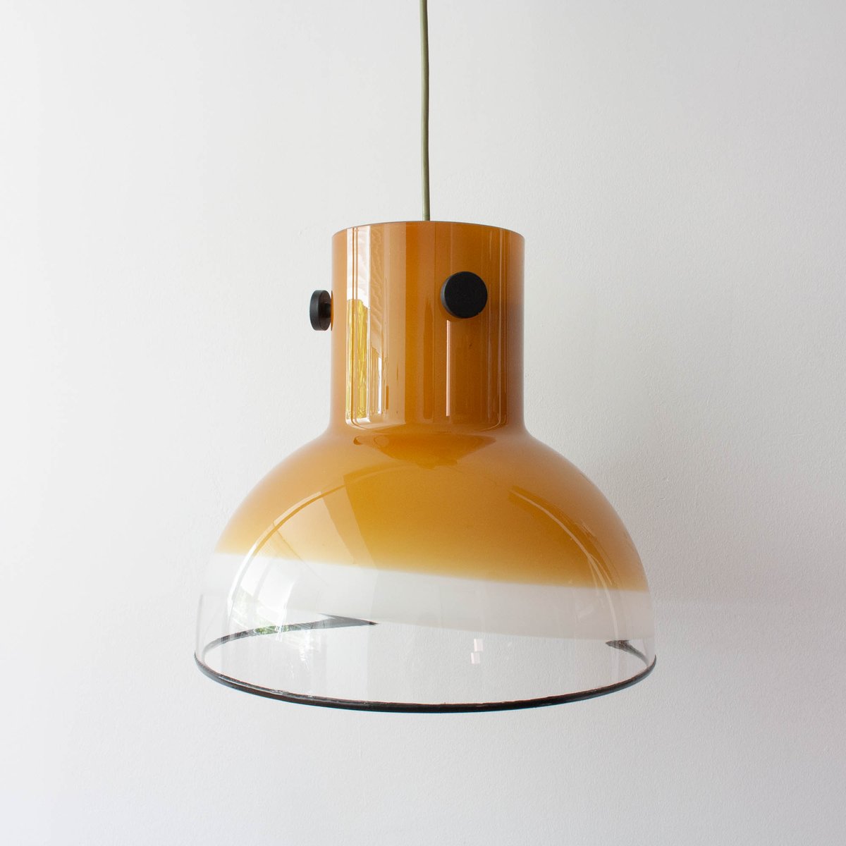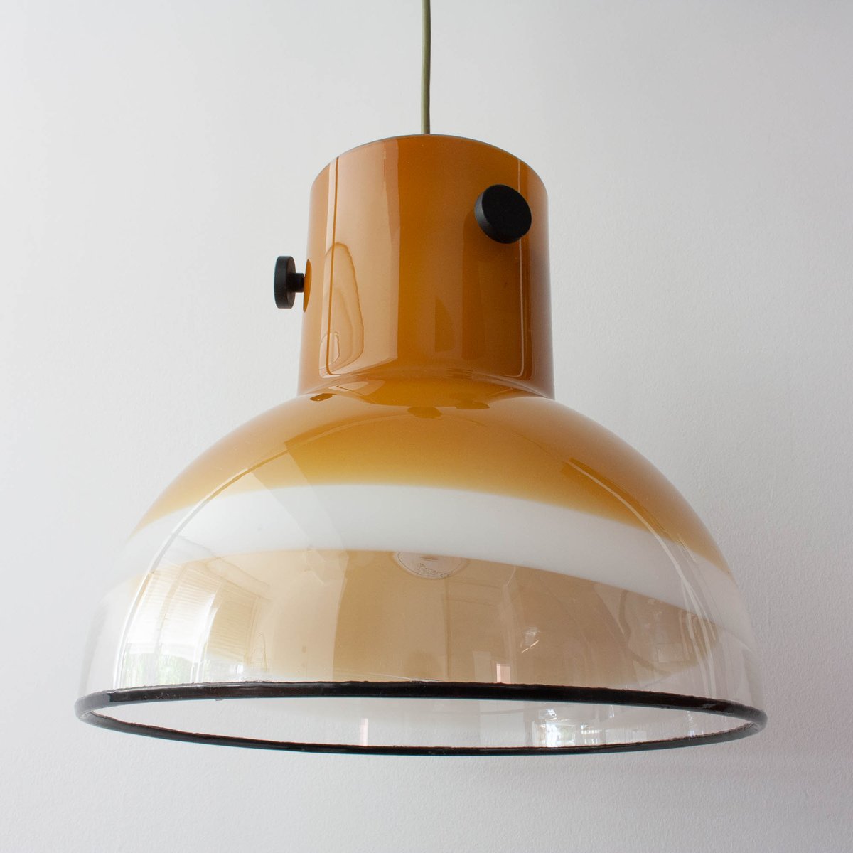 Questa lampada a sospensione è stata progettata e prodotta da Peill & Putzler, in Germania, negli anni Settanta. È un pezzo realizzato interamente in vetro, che va dal marrone chiaro (quasi giallo senape) al bianco e trasparente, con accessori in metallo nero e una finitura in gomma nera sulla base. La lampada a sospensione emette una luce calda e invitante, creando un ambiente intimo e accogliente in qualsiasi spazio.