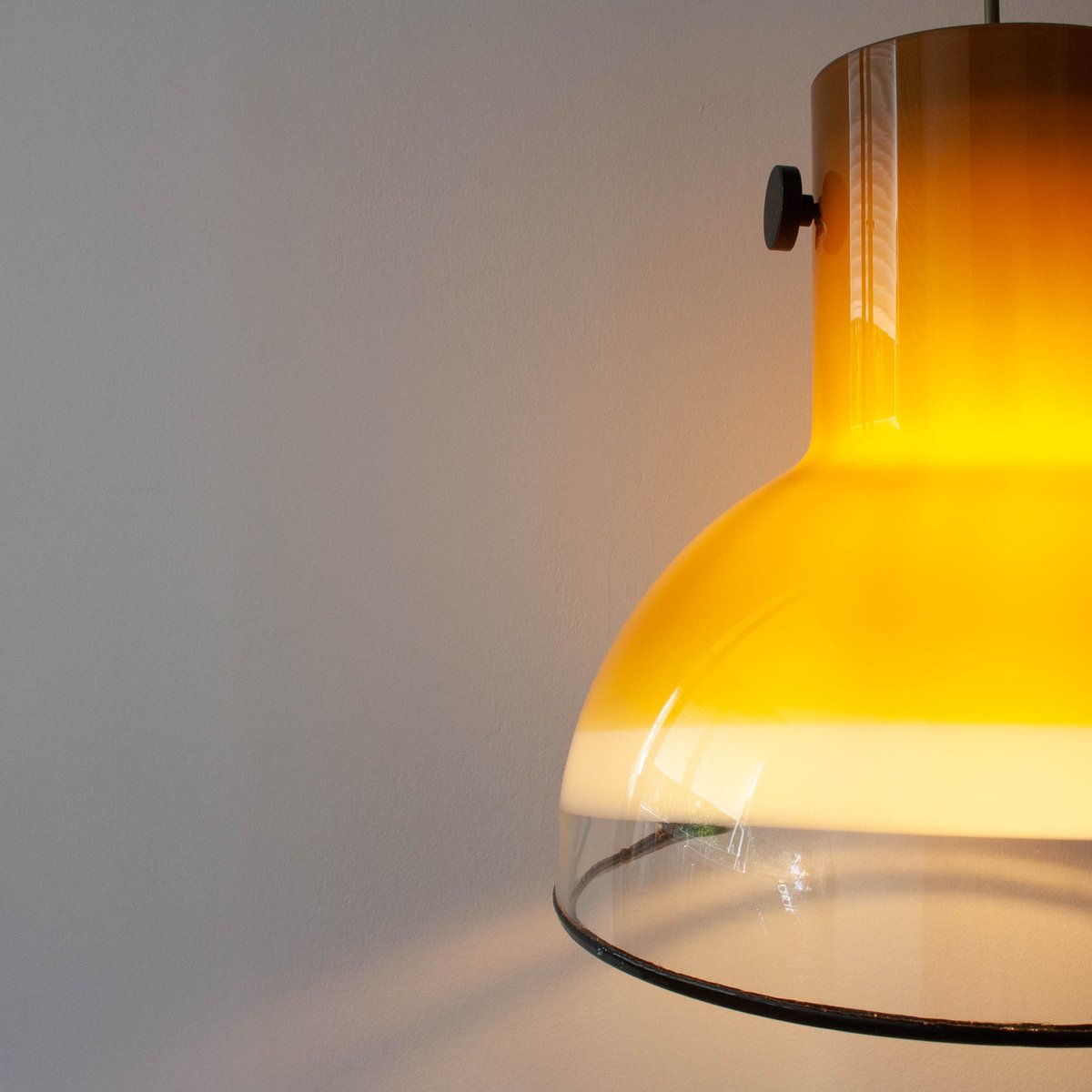 This pendant lamp was designed and produced by Peill & Putzler, in Germany, during the 1970's. It is a piece made entirely of glass, that goes from light brown (almost mustard yellow) to white and transparent, with black metal fittings and a black rubber finish on the base. The pendant light casts a warm and inviting glow, creating a cozy and intimate ambiance in any space.