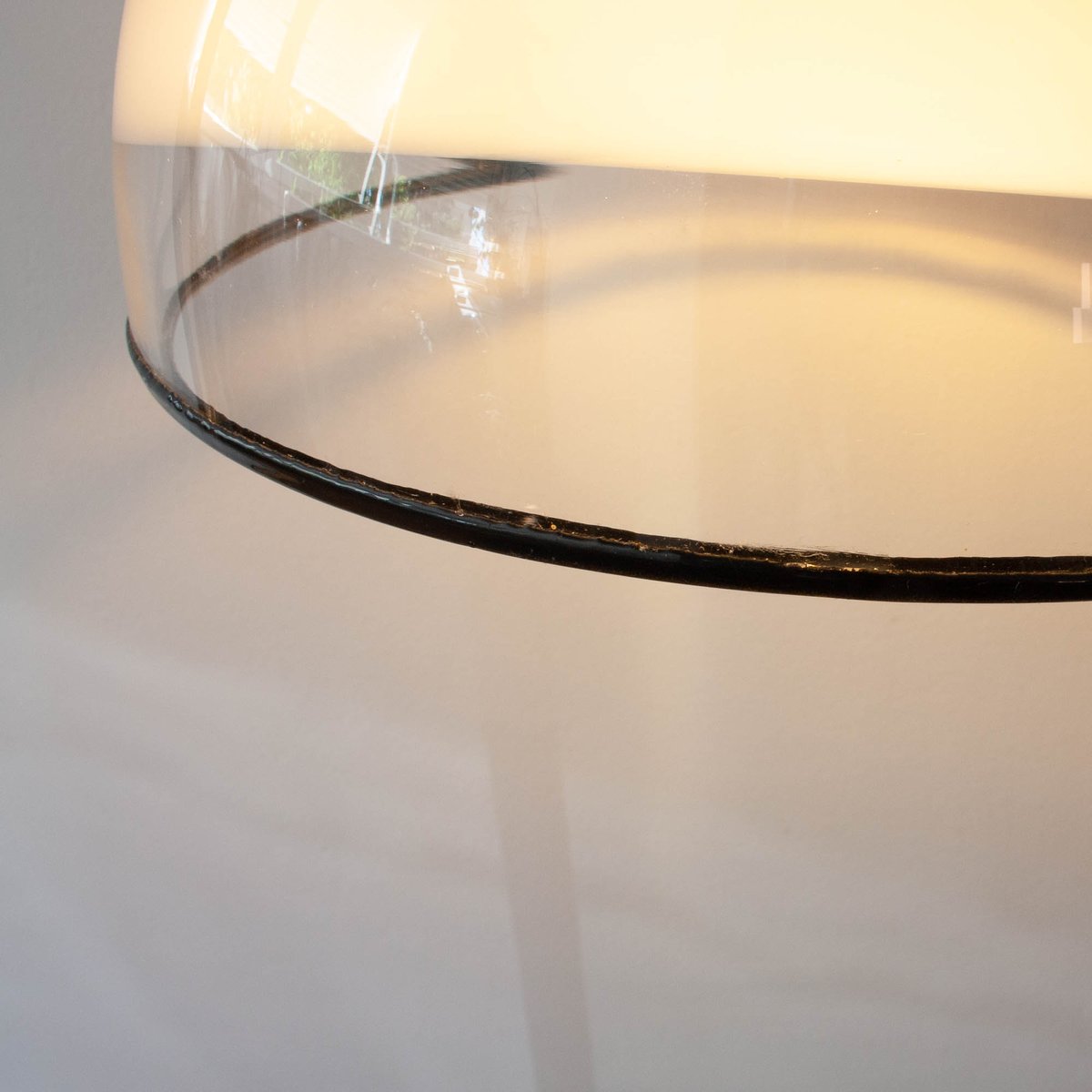 In buone condizioni originali e vintage. Il vetro ha una piccola scheggiatura vicino a uno degli attacchi in metallo nero, appena percettibile quando è montato. La finitura in gomma è un po' usurata. All'interno, nell'attacco della lampadina, è presente l'etichetta originale di Peill & Putzler.