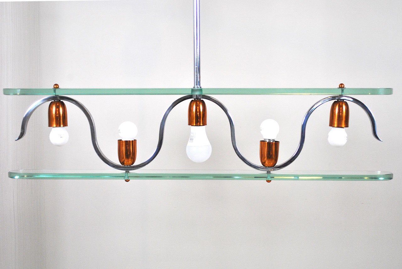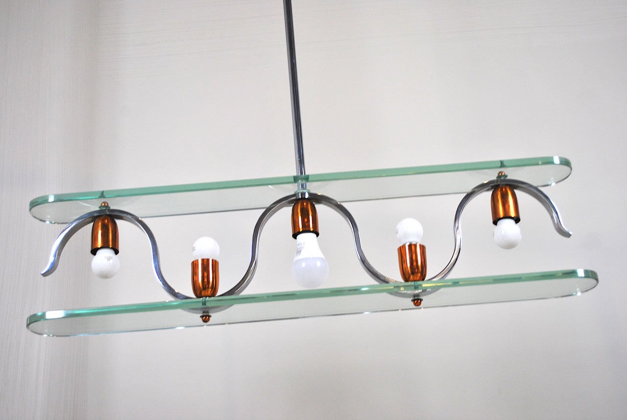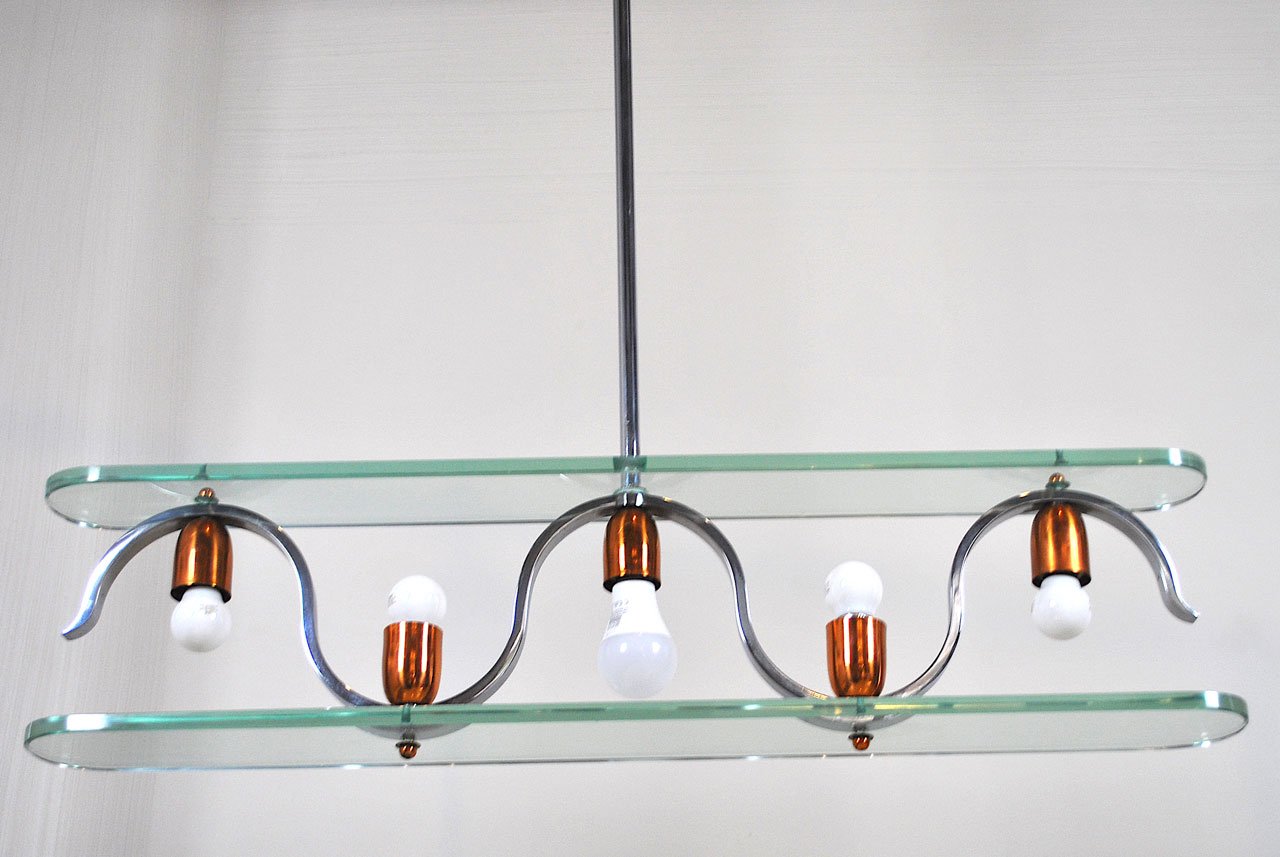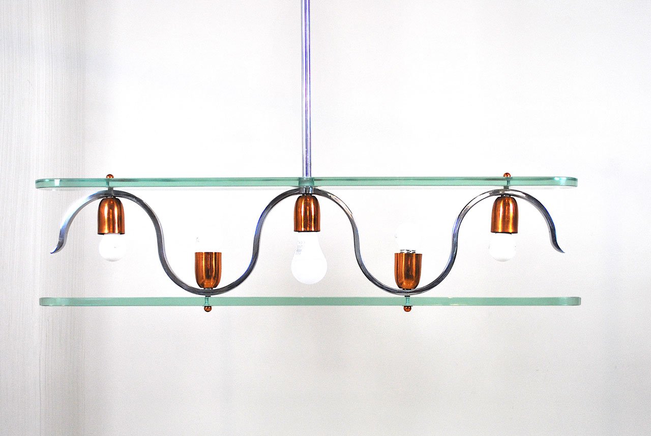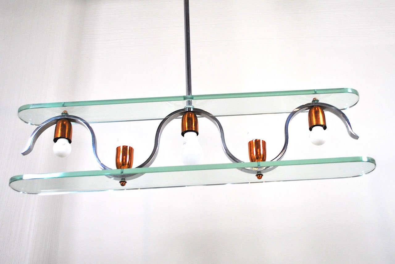 Between 1930 and 1932, hoping to make inroads in the art glass and décor sector, Fontana hired famed Italian architect-designer Gio Ponti (1891-1979)—then art director for the ceramics company Richard Ginori—to consult and create new designs for the domestic market, leading to Ponti’s now-iconic 0024 Pendant (1931) and Bilia Table Lamp (1931/32). By 1933, the collaboration gave rise to Fontana Arte, an artistic glass works division of Fontana’s company. The same year, Fontana Arte acquired Italian designer Pietro Chiesa’s (1892-1948) glass workshop, Bottega di Pietro Chiesa, and Ponti and Chiesa shared the role of art director for the expanded company. Soon they were garnering wide acclaim for a variety of sophisticated glass objects, encompassing stained glass, lighting, decorative mirrors, sculptural pieces, and even furniture made of glass, most of which were characterized by a purity of form remarkable for the time. Early successes included Chiesa’s Fontana Coffee Table (1932), Cartoccio Vase (1932), Luminator Floor Lamp (1933), and 006 Series (1933/37).