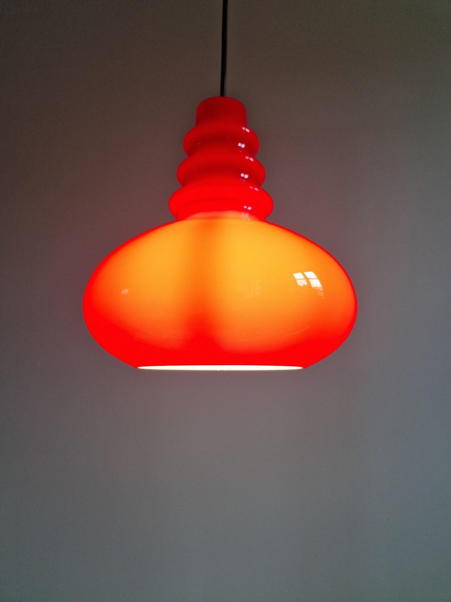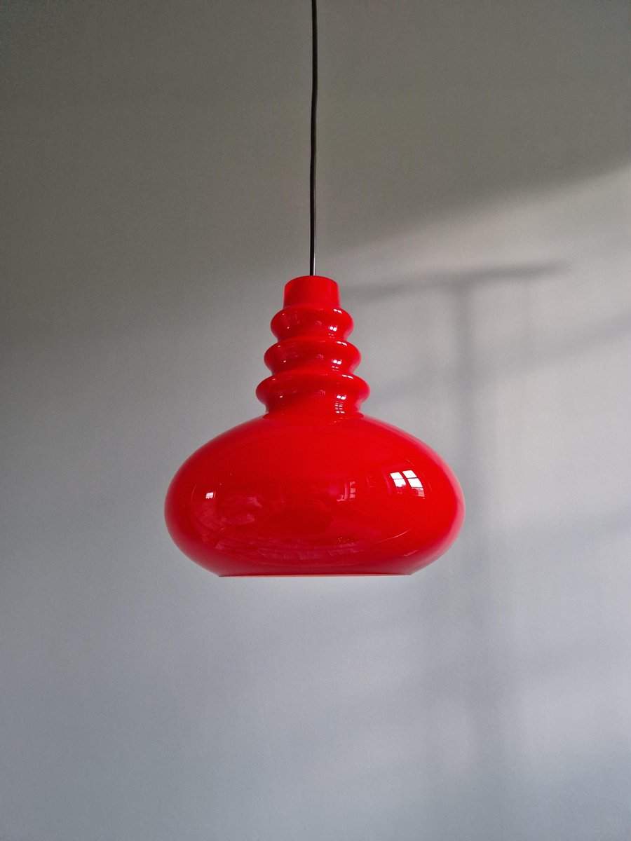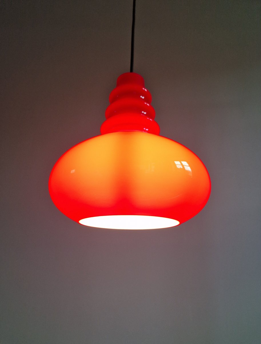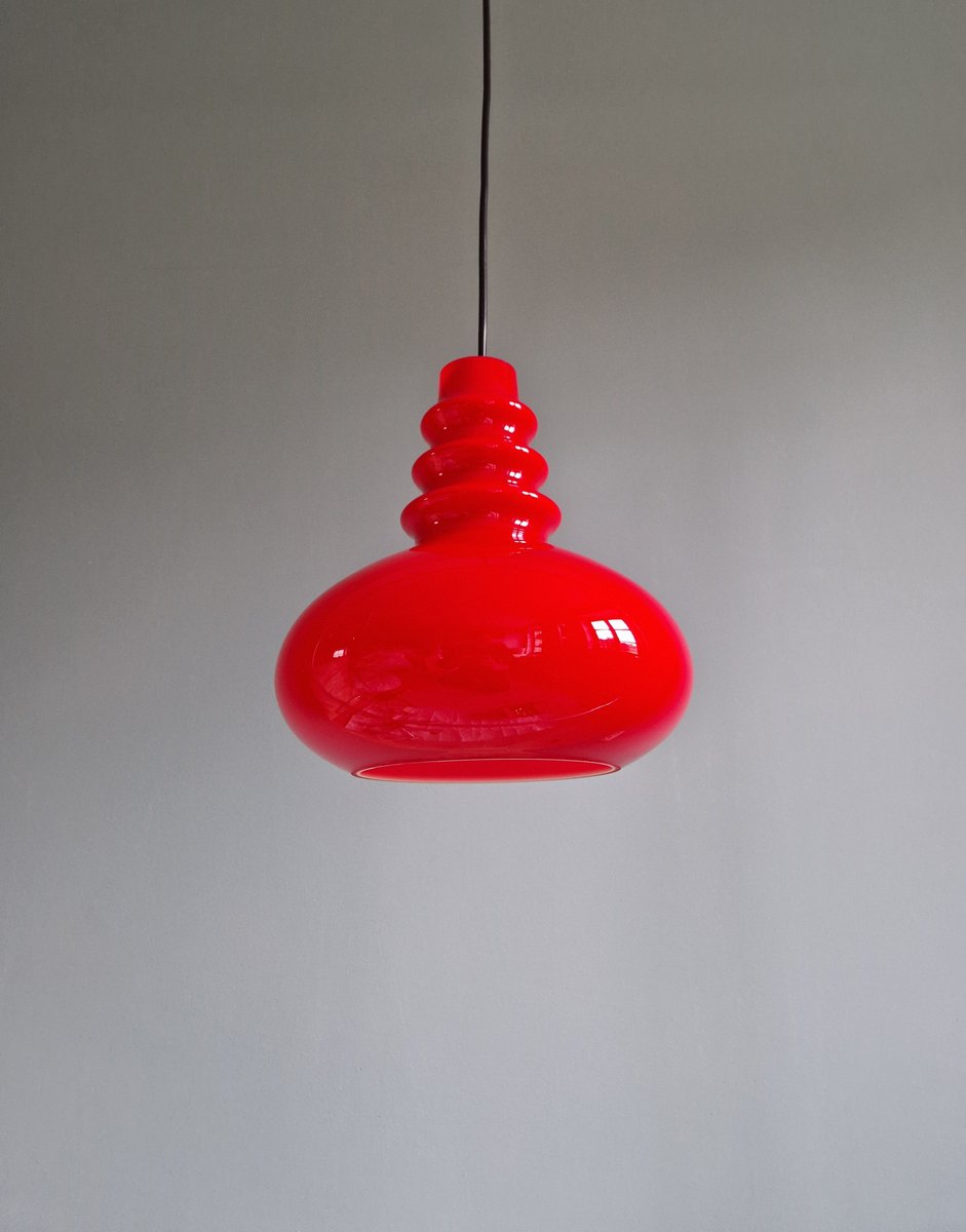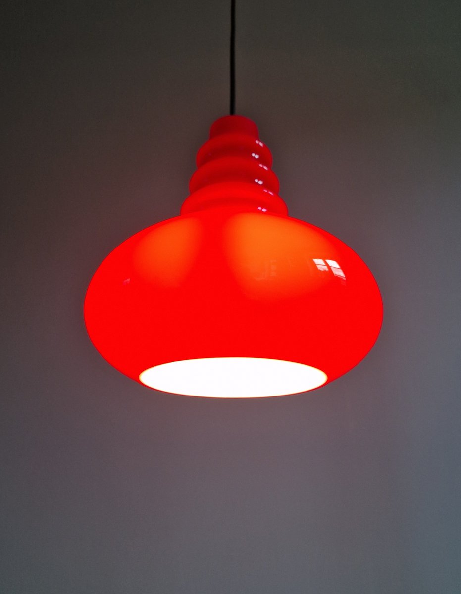 Lampada a sospensione Space Age in vetro opalino rosso di Peill & Putzler, anni '70