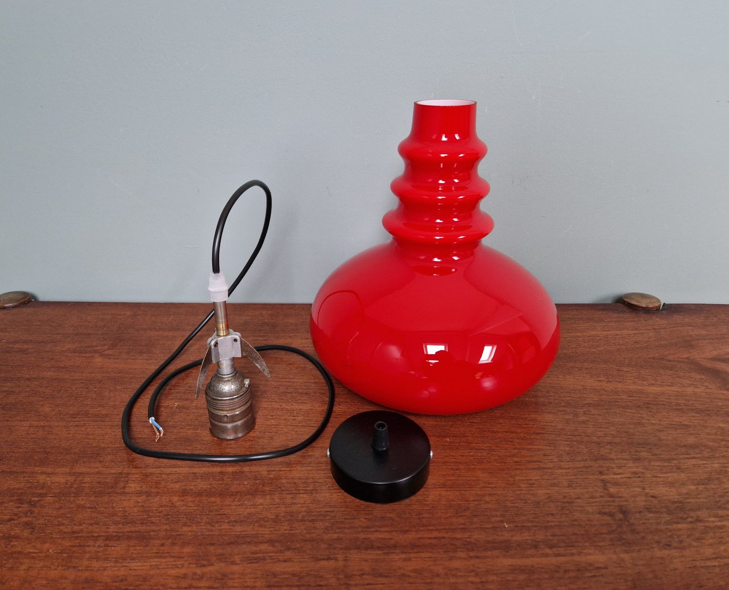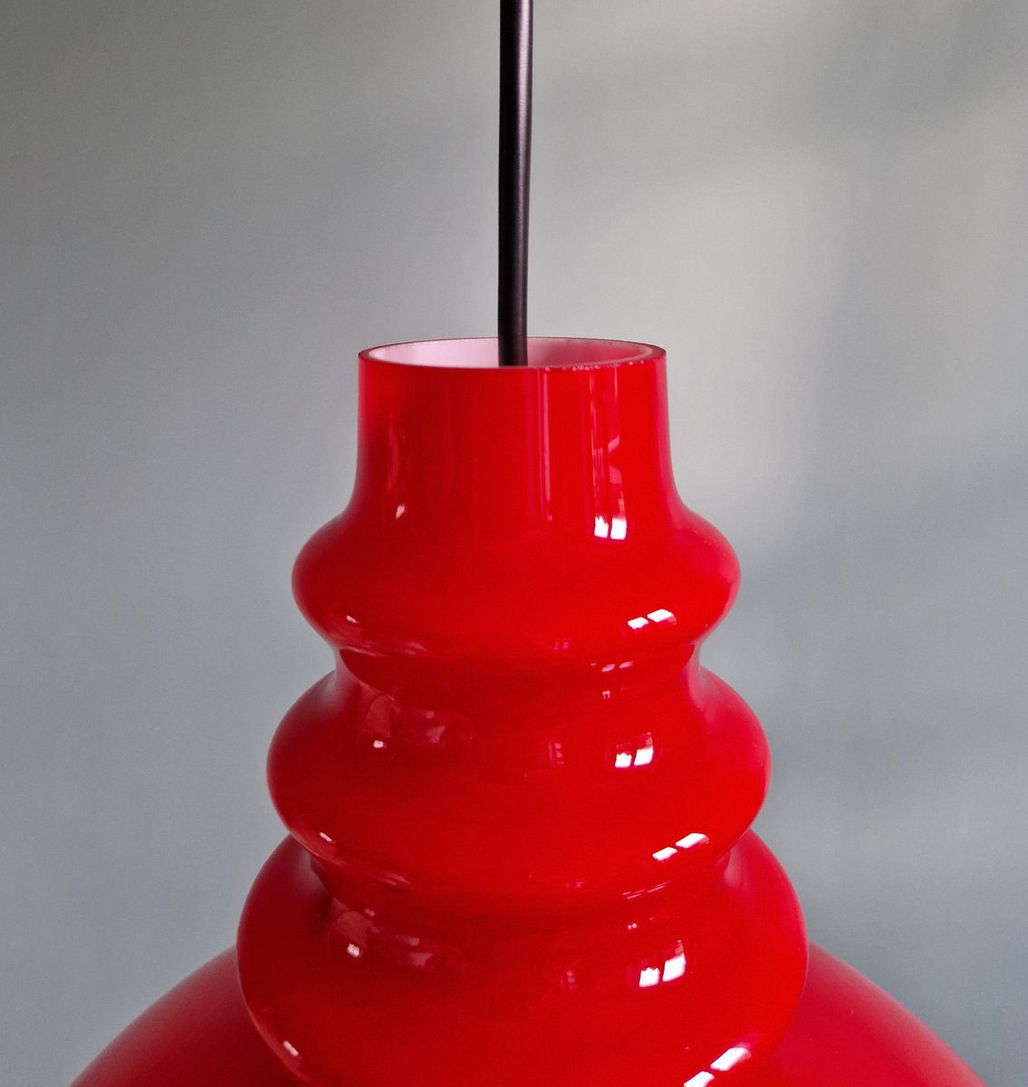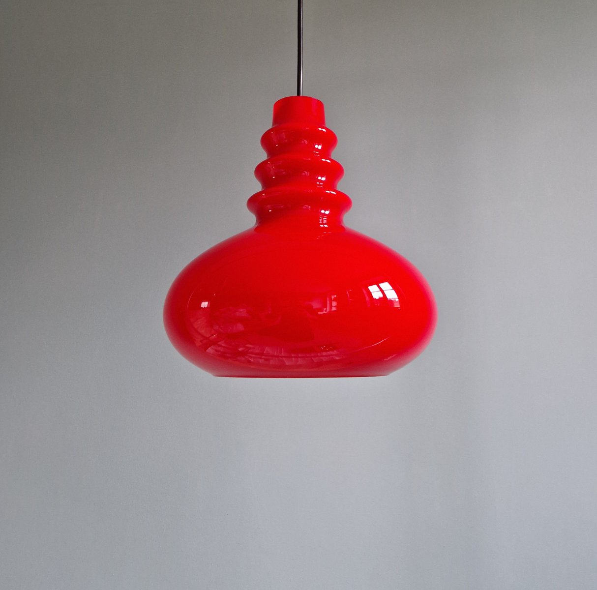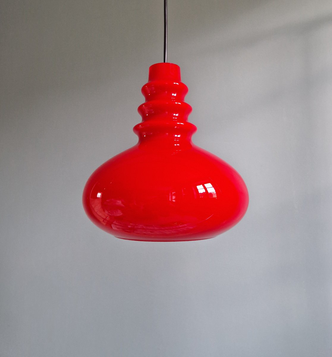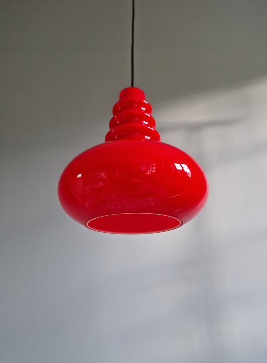 Lampada a sospensione Space Age in vetro opalino rosso di Peill & Putzler, anni '70