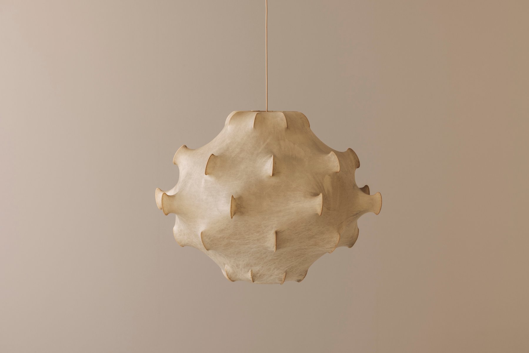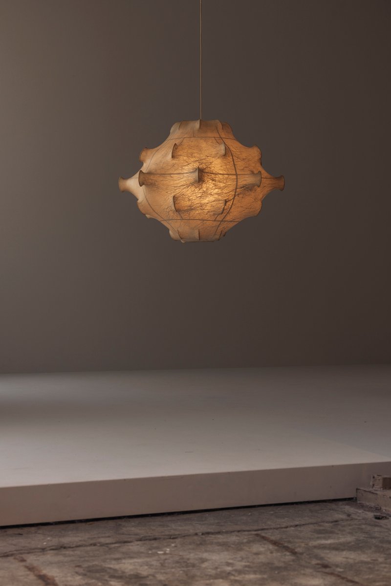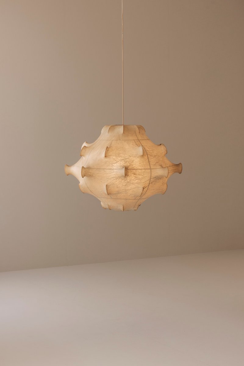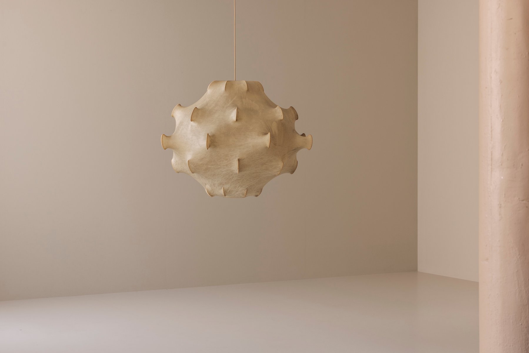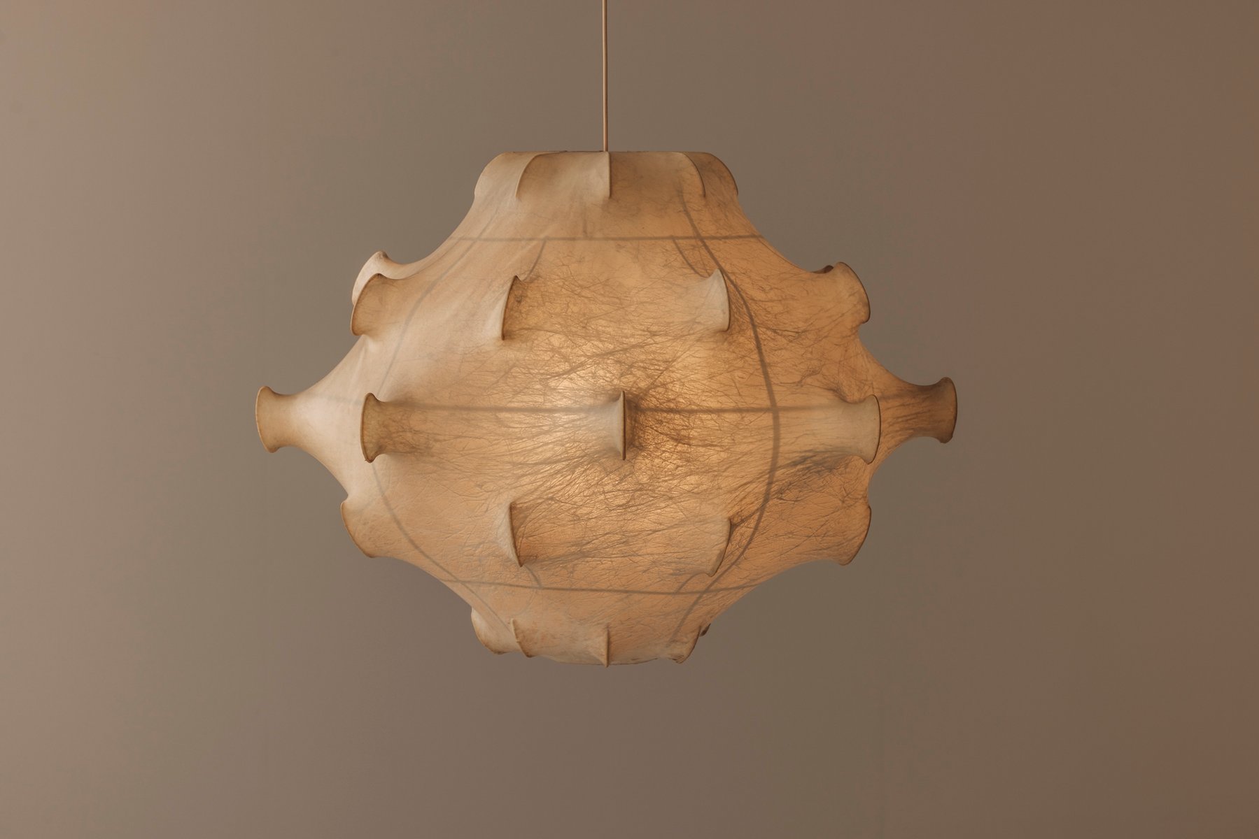 Un'eccezionale e rara prima produzione del ciondolo Taraxacum, disegnato negli anni '60 da Achille e Pier Giacomo Castiglioni per Flos. Delle due versioni create dai fratelli Castiglioni, questa è la più grande e la più rara, il che la rende un reperto eccezionale per i collezionisti seri. Il pendente presenta una struttura interna in acciaio verniciato di bianco, meticolosamente spruzzata con la resina cocoon, un materiale rivoluzionario per l'epoca, che crea una luce calda e diffusa quando viene illuminato. Le sue dimensioni generose ne fanno un pezzo forte, mentre la superficie organica, simile a una nuvola, conferisce una presenza morbida e atmosferica. Questo esemplare proviene dalla prima produzione, una versione molto ricercata che cattura perfettamente l'approccio innovativo dei Castiglioni sia al materiale che alla forma.