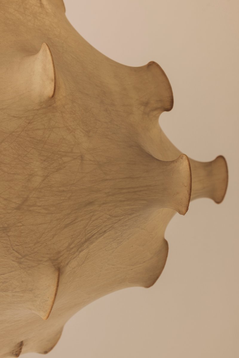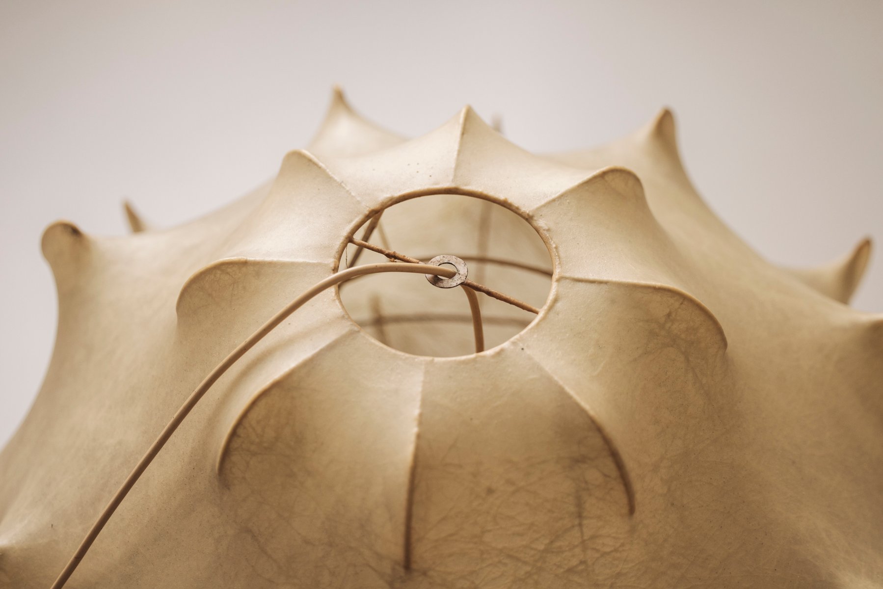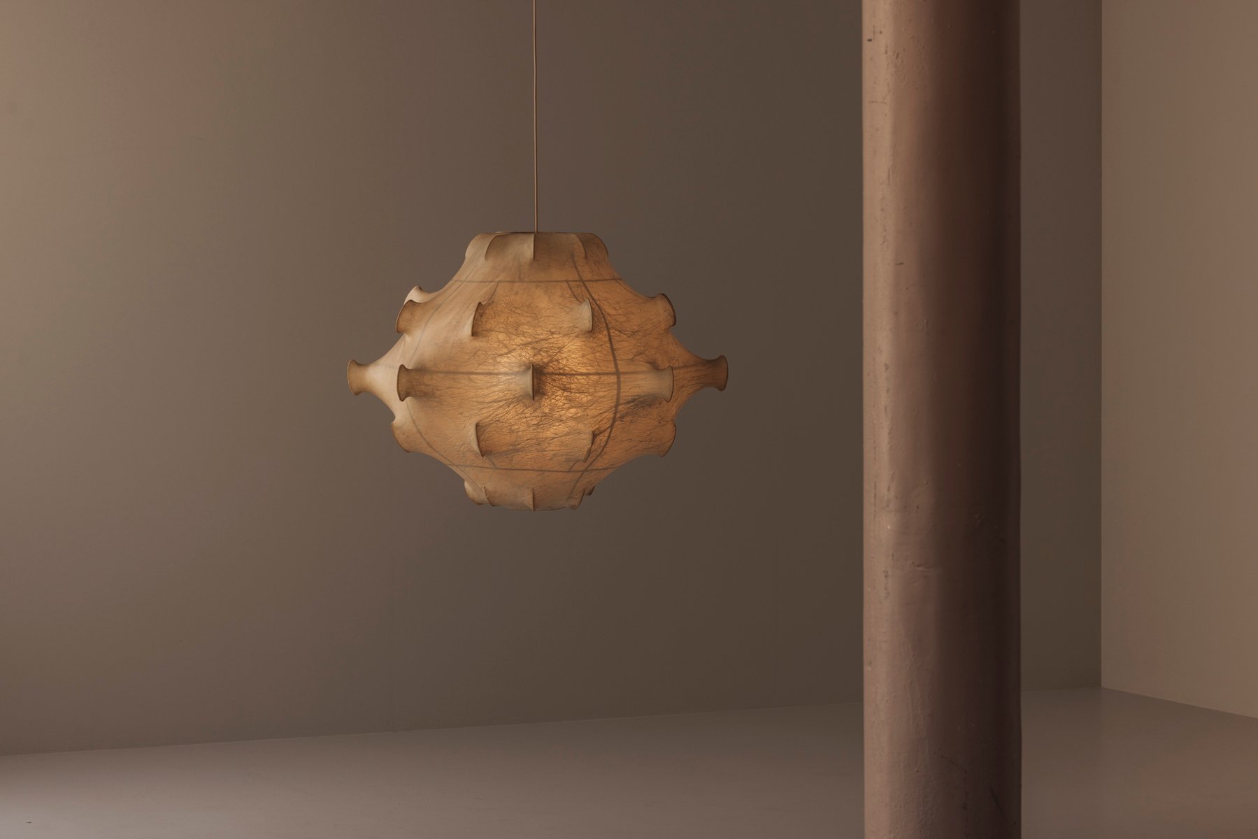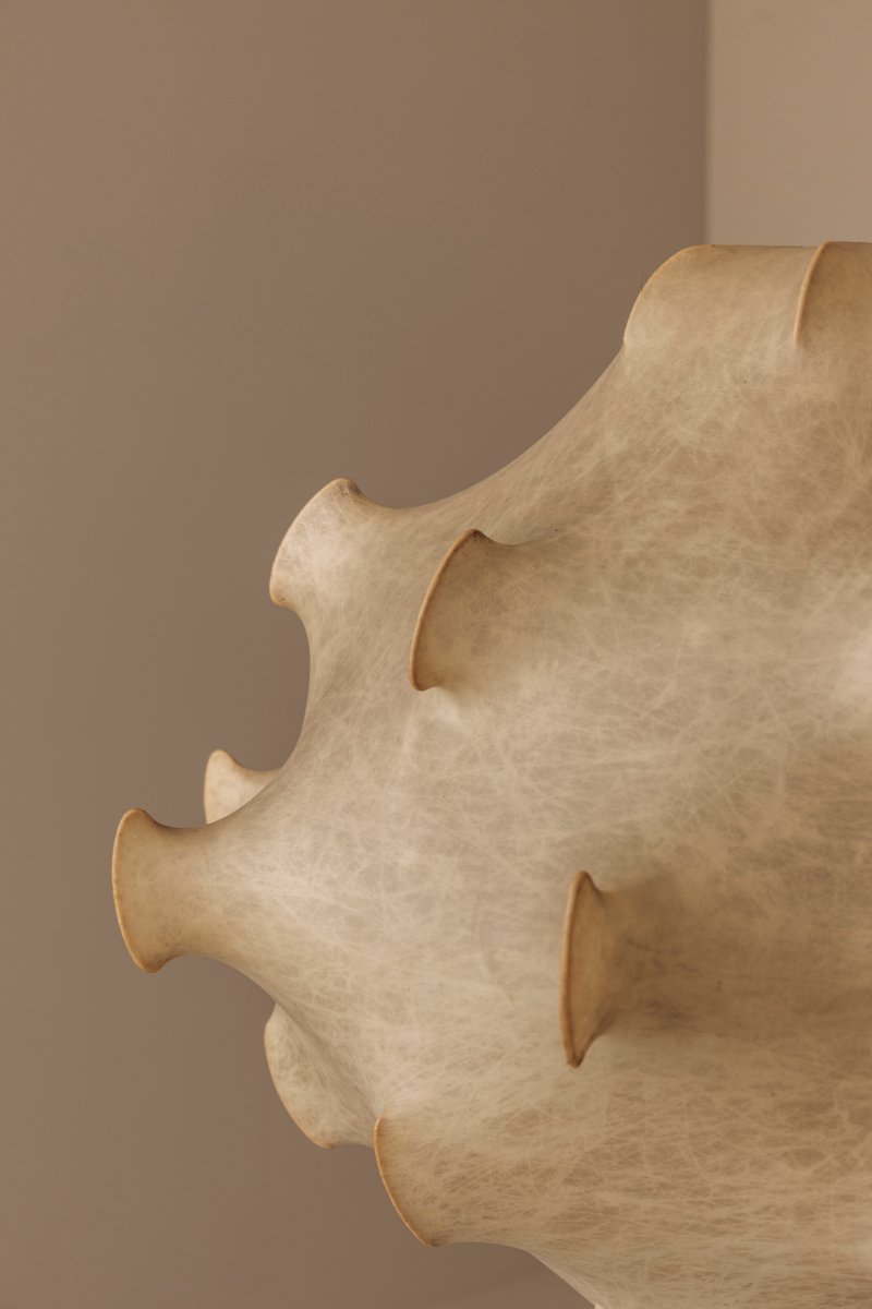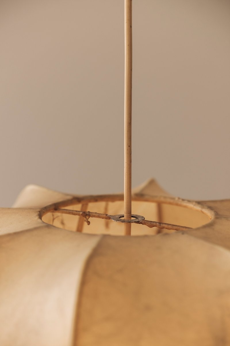 Un'eccezionale e rara prima produzione del ciondolo Taraxacum, disegnato negli anni '60 da Achille e Pier Giacomo Castiglioni per Flos. Delle due versioni create dai fratelli Castiglioni, questa è la più grande e la più rara, il che la rende un reperto eccezionale per i collezionisti seri. Il pendente presenta una struttura interna in acciaio verniciato di bianco, meticolosamente spruzzata con la resina cocoon, un materiale rivoluzionario per l'epoca, che crea una luce calda e diffusa quando viene illuminato. Le sue dimensioni generose ne fanno un pezzo forte, mentre la superficie organica, simile a una nuvola, conferisce una presenza morbida e atmosferica. Questo esemplare proviene dalla prima produzione, una versione molto ricercata che cattura perfettamente l'approccio innovativo dei Castiglioni sia al materiale che alla forma.