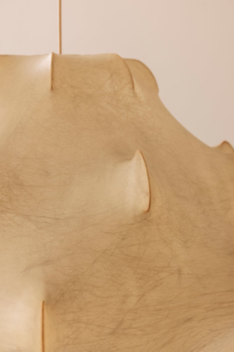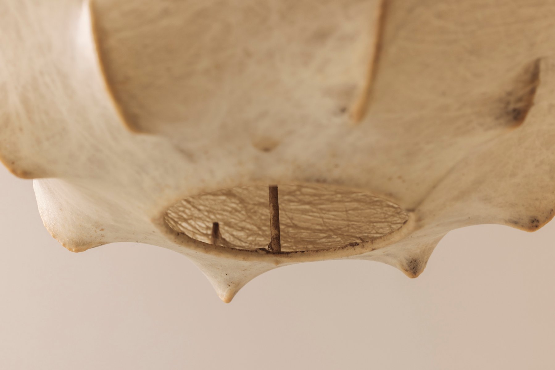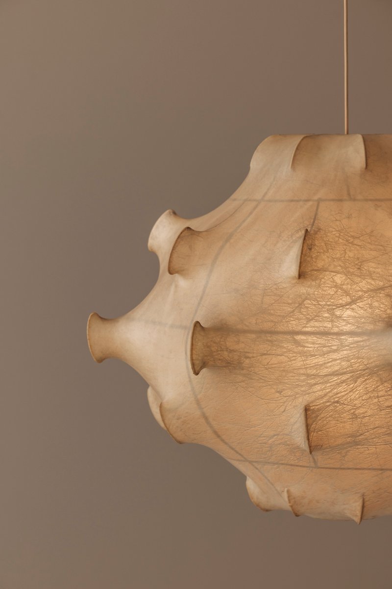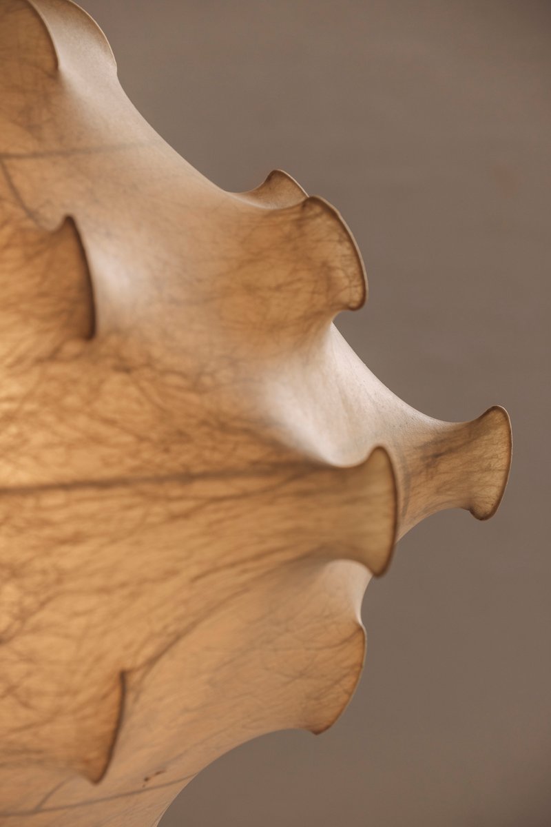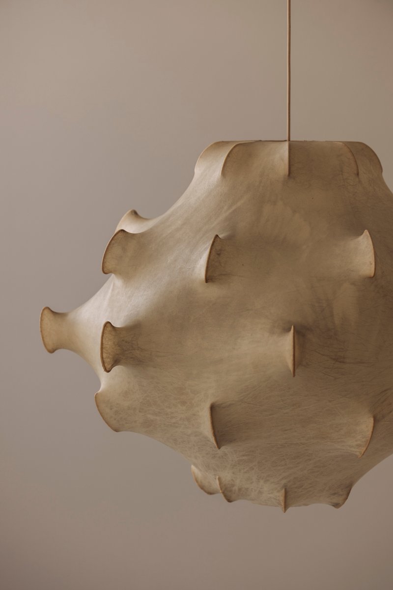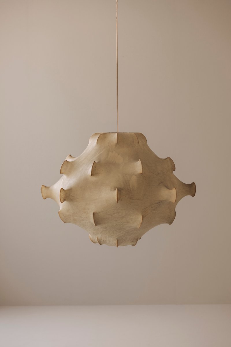 Un'eccezionale e rara prima produzione del ciondolo Taraxacum, disegnato negli anni '60 da Achille e Pier Giacomo Castiglioni per Flos. Delle due versioni create dai fratelli Castiglioni, questa è la più grande e la più rara, il che la rende un reperto eccezionale per i collezionisti seri. Il pendente presenta una struttura interna in acciaio verniciato di bianco, meticolosamente spruzzata con la resina cocoon, un materiale rivoluzionario per l'epoca, che crea una luce calda e diffusa quando viene illuminato. Le sue dimensioni generose ne fanno un pezzo forte, mentre la superficie organica, simile a una nuvola, conferisce una presenza morbida e atmosferica. Questo esemplare proviene dalla prima produzione, una versione molto ricercata che cattura perfettamente l'approccio innovativo dei Castiglioni sia al materiale che alla forma.