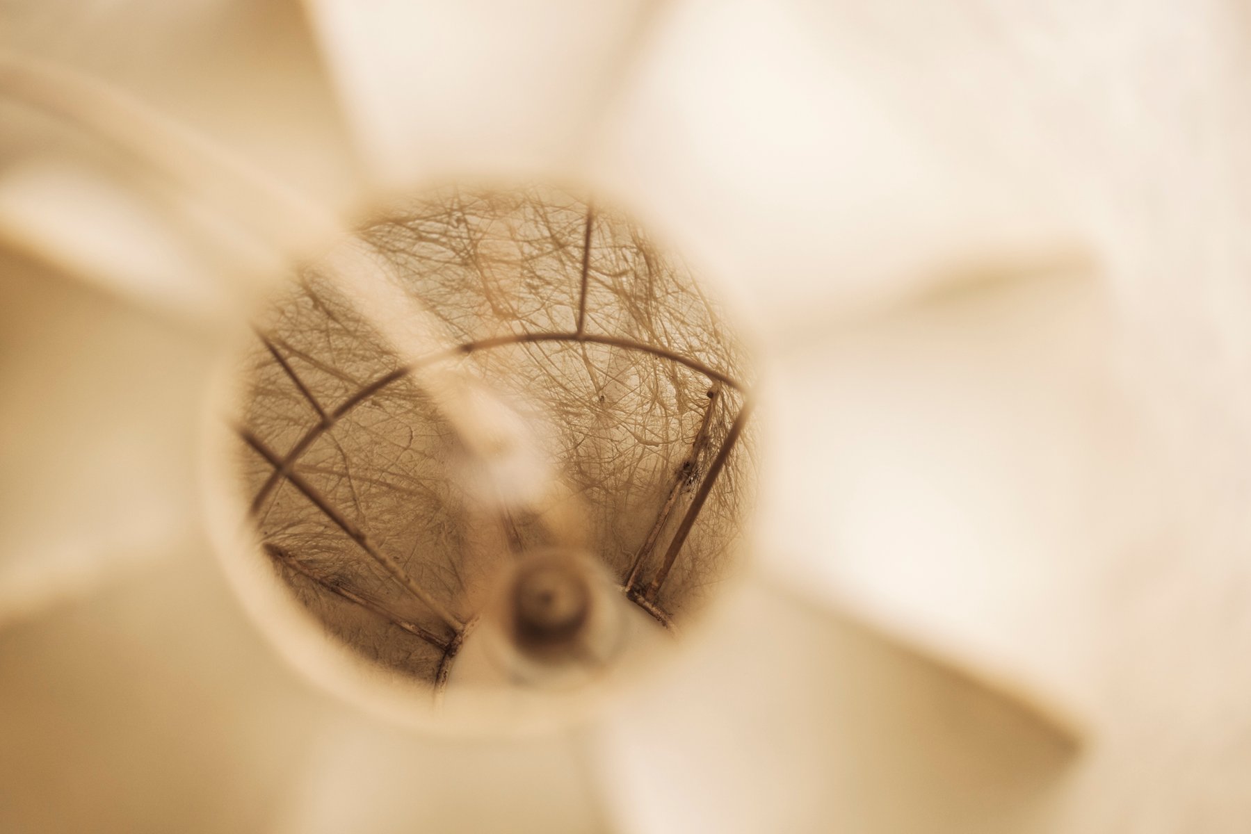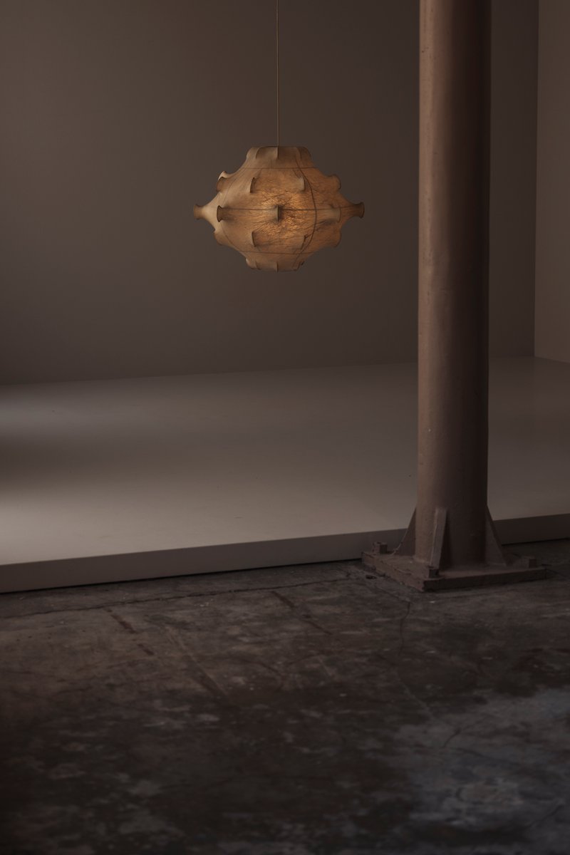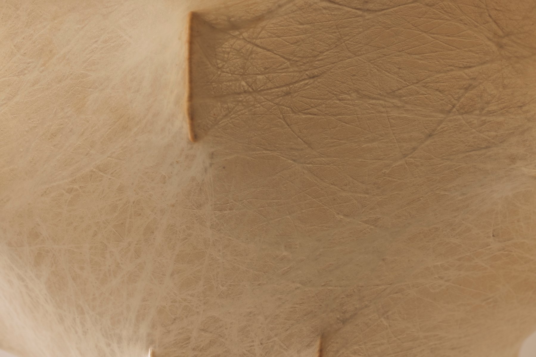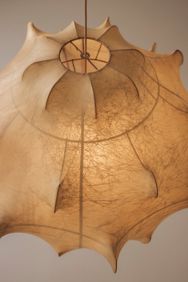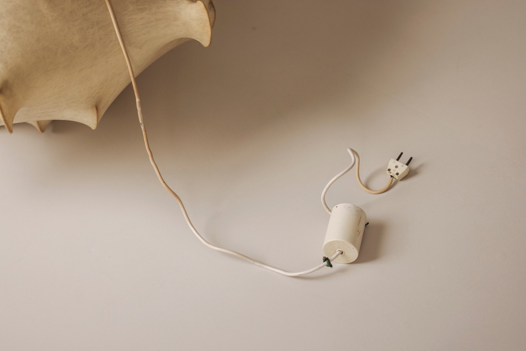 Un'eccezionale e rara prima produzione del ciondolo Taraxacum, disegnato negli anni '60 da Achille e Pier Giacomo Castiglioni per Flos. Delle due versioni create dai fratelli Castiglioni, questa è la più grande e la più rara, il che la rende un reperto eccezionale per i collezionisti seri. Il pendente presenta una struttura interna in acciaio verniciato di bianco, meticolosamente spruzzata con la resina cocoon, un materiale rivoluzionario per l'epoca, che crea una luce calda e diffusa quando viene illuminato. Le sue dimensioni generose ne fanno un pezzo forte, mentre la superficie organica, simile a una nuvola, conferisce una presenza morbida e atmosferica. Questo esemplare proviene dalla prima produzione, una versione molto ricercata che cattura perfettamente l'approccio innovativo dei Castiglioni sia al materiale che alla forma.