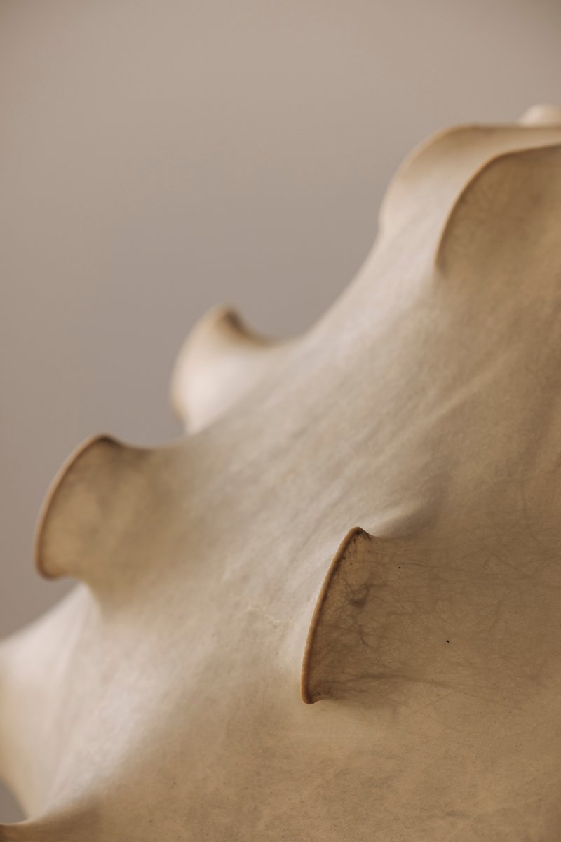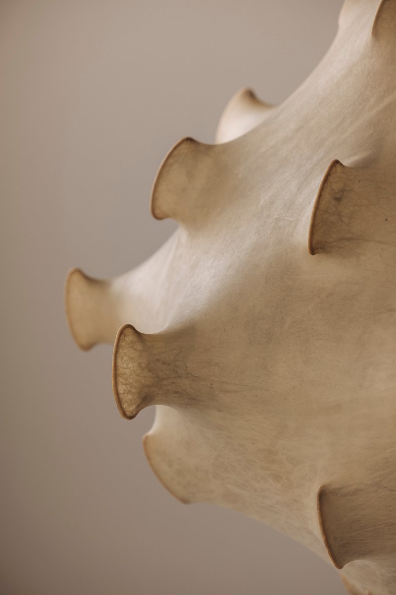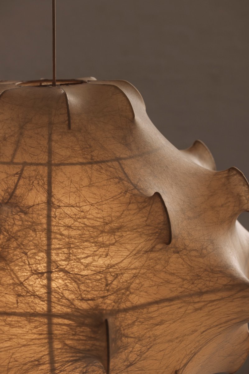 An outstanding and rare early production of the Taraxacum pendant, designed in the 1960s by Achille and Pier Giacomo Castiglioni for Flos. Of the two versions created by the Castiglioni brothers, this is the largest and rarest, making it an exceptional find for serious collectors. The pendant features an internal structure in white-painted steel, meticulously sprayed with the Castiglionis’ signature cocoon resin—a revolutionary material at the time—creating a warm, diffused glow when lit. Its generous scale makes it a commanding centerpiece, while the organic, cloud-like surface lends a soft, atmospheric presence. This example comes from the first production, a highly sought-after version that perfectly captures the Castiglionis’ innovative approach to both material and form.