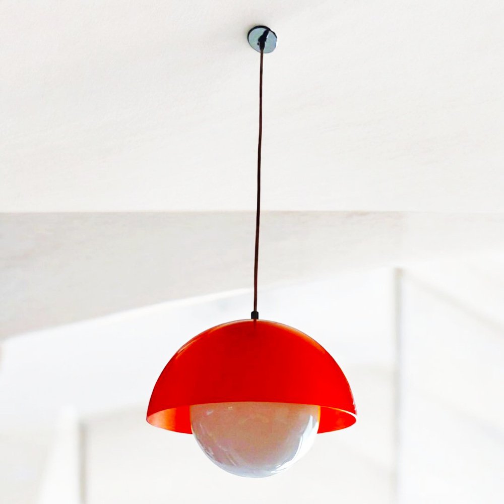 Bring a vibrant, authentic touch to your home with this spectacular 1970s vintage ceiling light, an iconic design of the Space Age movement. Featuring a dome-shaped structure in a vibrant bright orange color and a white interior sphere, this lamp is a true emblem of European mid-century modern design.