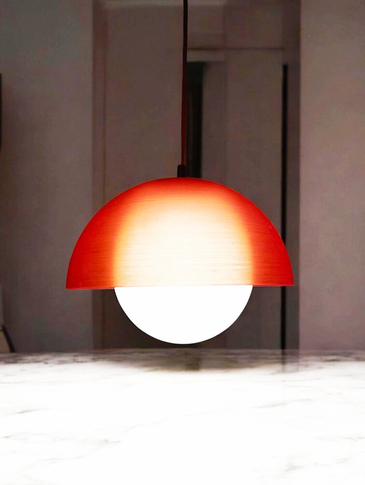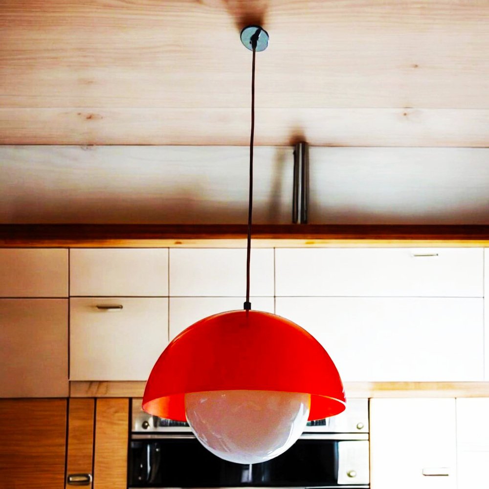 Date un tocco vibrante e autentico alla vostra casa con questa spettacolare plafoniera vintage anni '70, un design iconico del movimento Space Age. Caratterizzata da una struttura a forma di cupola in un vibrante colore arancione e da una sfera interna bianca, questa lampada è un vero e proprio emblema del design moderno europeo di metà secolo.