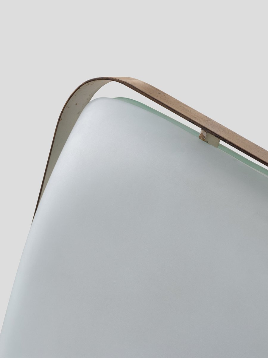 Between 1930 and 1932, hoping to make inroads in the art glass and décor sector, Fontana hired famed Italian architect-designer Gio Ponti (1891-1979)—then art director for the ceramics company Richard Ginori—to consult and create new designs for the domestic market, leading to Ponti’s now-iconic 0024 Pendant (1931) and Bilia Table Lamp (1931/32). By 1933, the collaboration gave rise to Fontana Arte, an artistic glass works division of Fontana’s company. The same year, Fontana Arte acquired Italian designer Pietro Chiesa’s (1892-1948) glass workshop, Bottega di Pietro Chiesa, and Ponti and Chiesa shared the role of art director for the expanded company. Soon they were garnering wide acclaim for a variety of sophisticated glass objects, encompassing stained glass, lighting, decorative mirrors, sculptural pieces, and even furniture made of glass, most of which were characterized by a purity of form remarkable for the time. Early successes included Chiesa’s Fontana Coffee Table (1932), Cartoccio Vase (1932), Luminator Floor Lamp (1933), and 006 Series (1933/37).