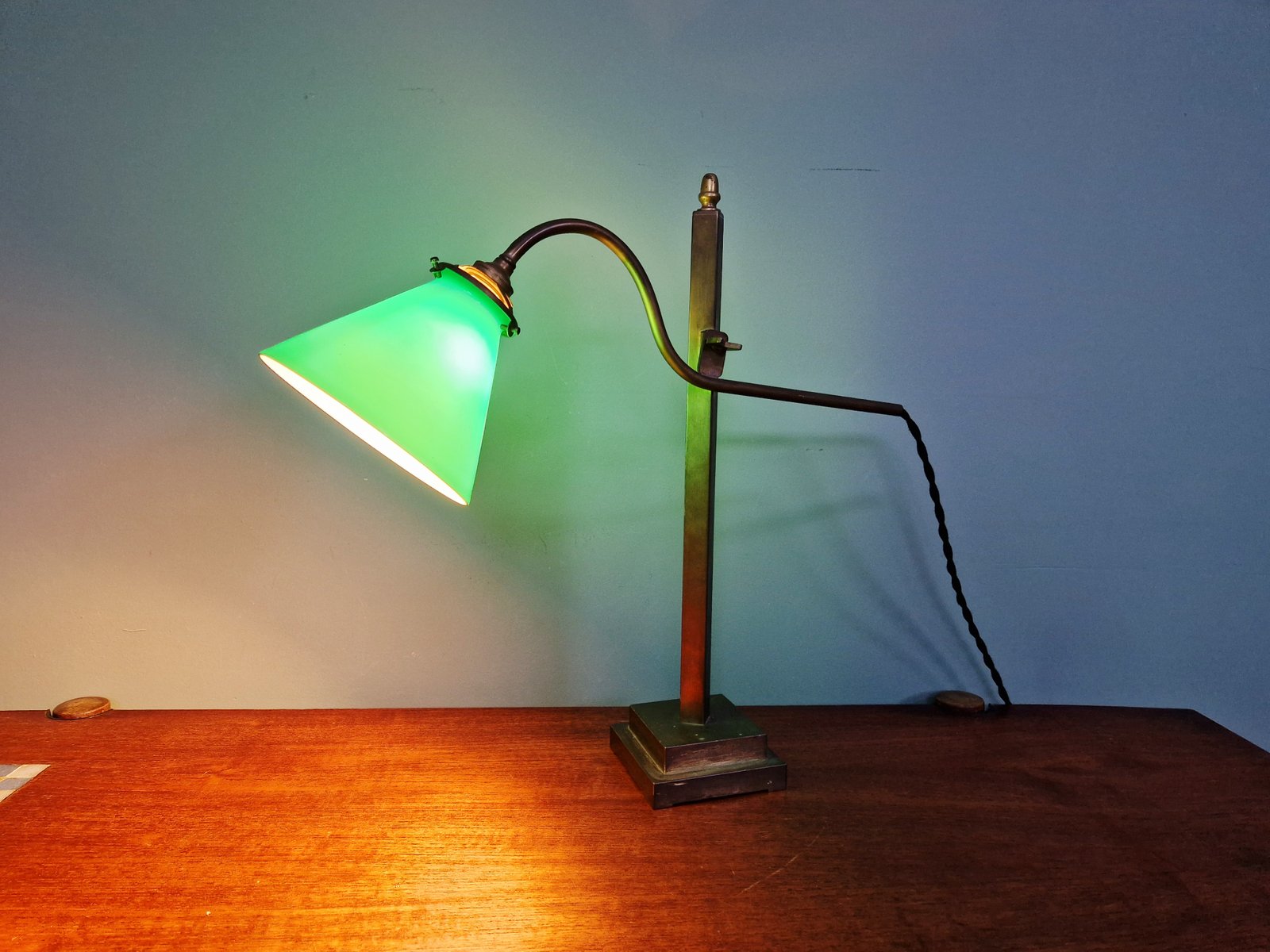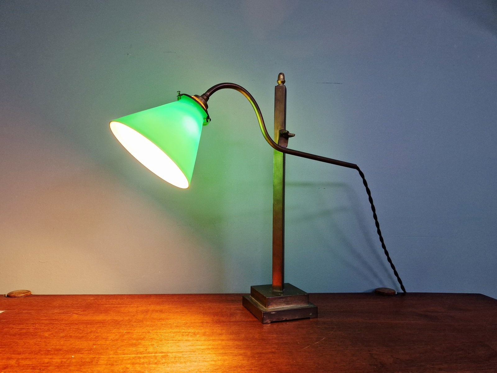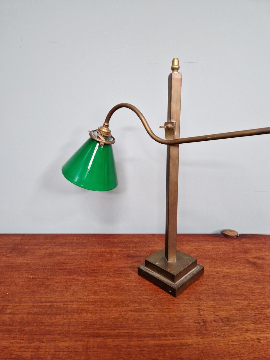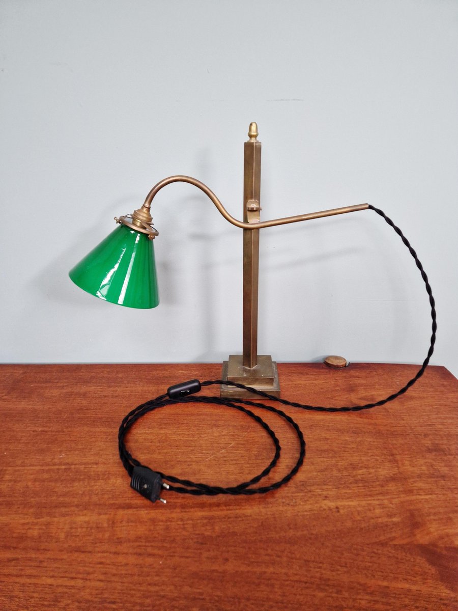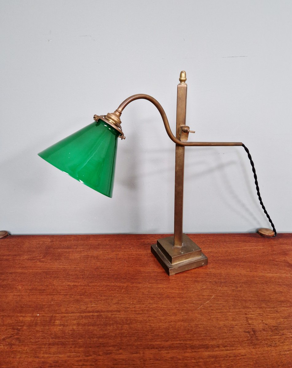 Lampada da scrivania conica in bronzo e vetro opalino verde, anni '20