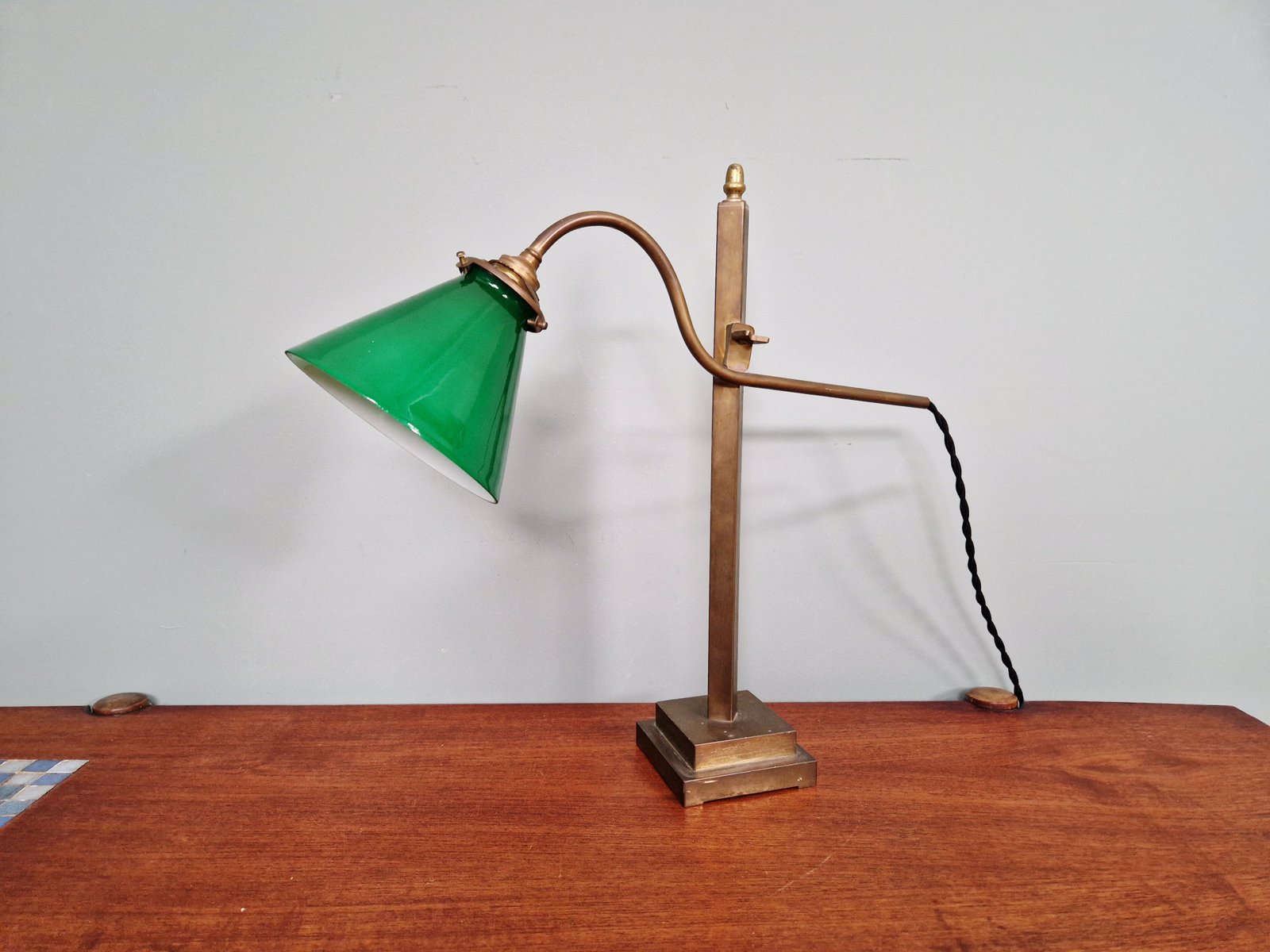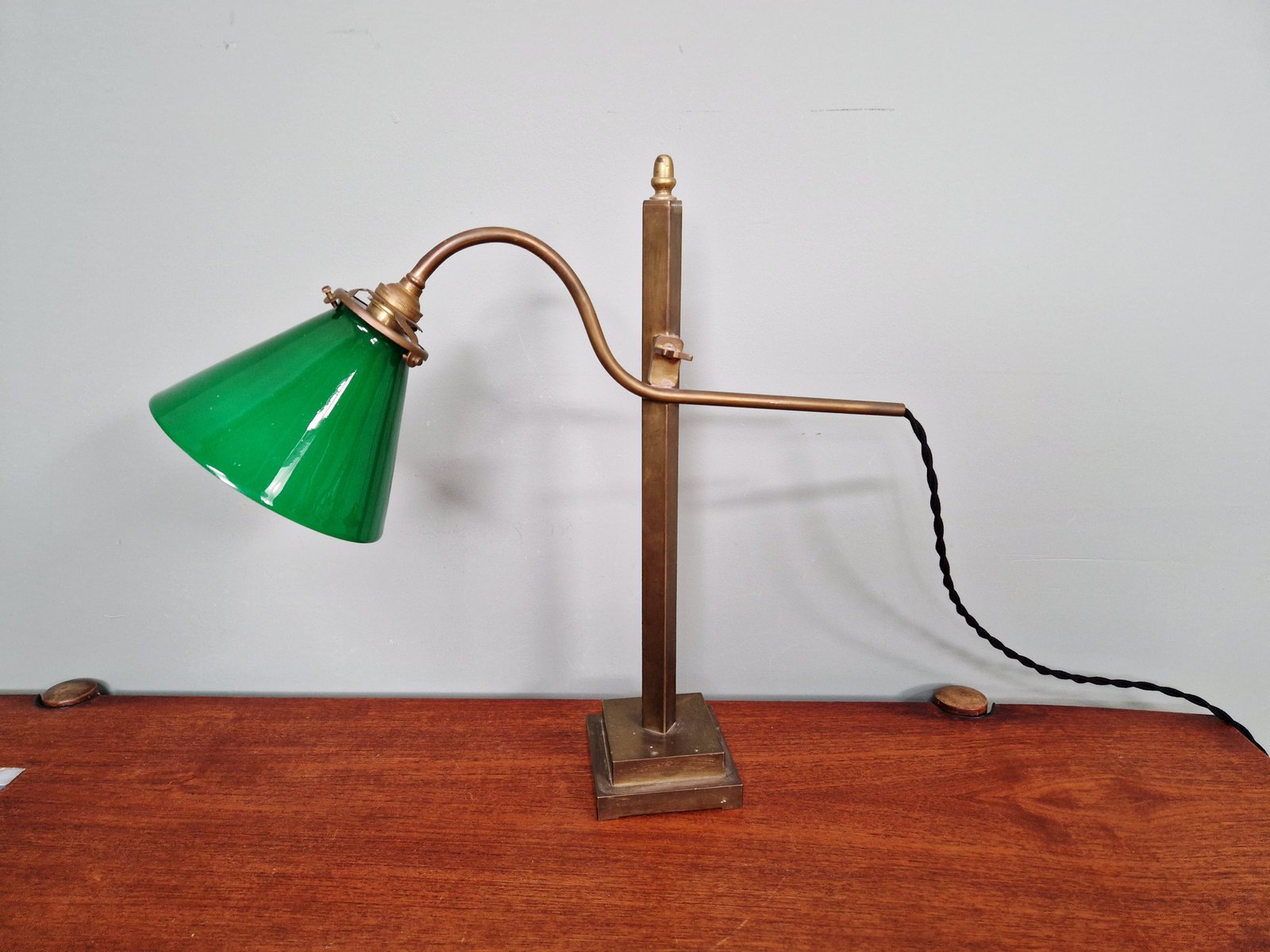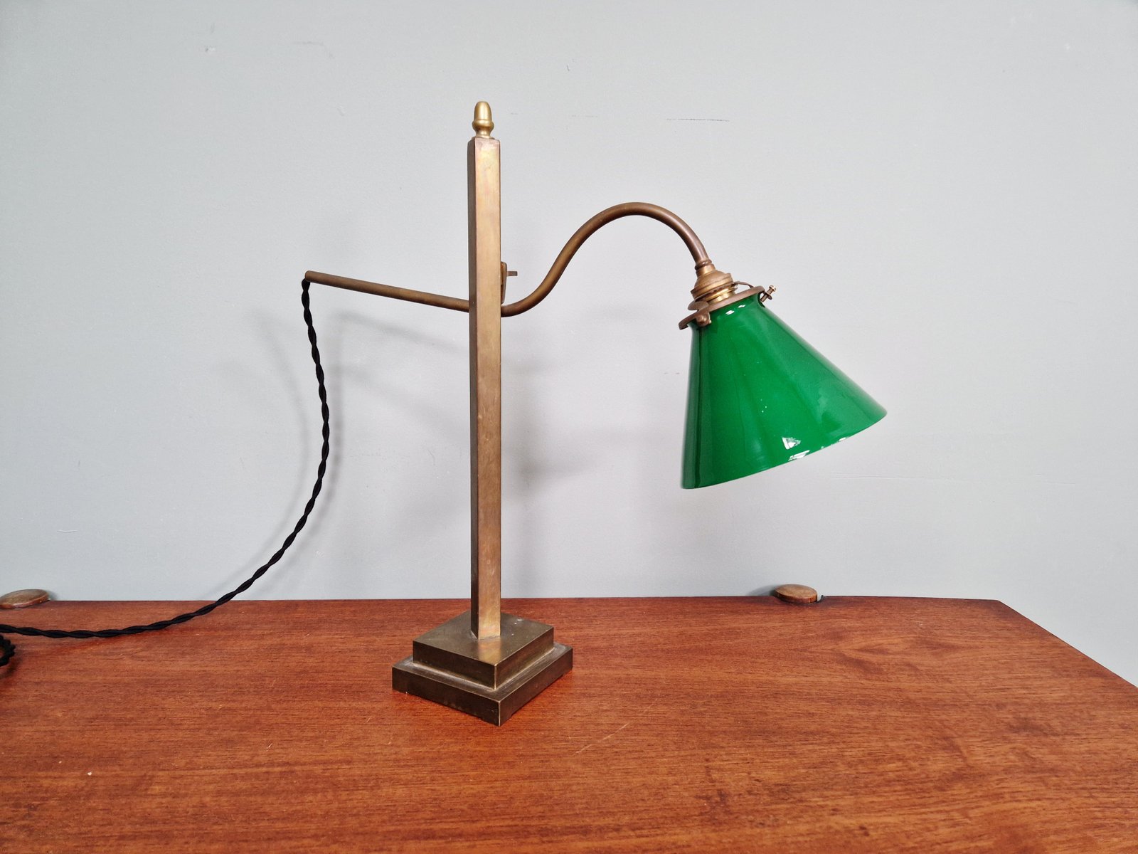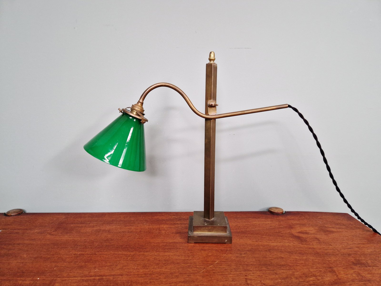 Lampada da scrivania conica in bronzo e vetro opalino verde, anni '20