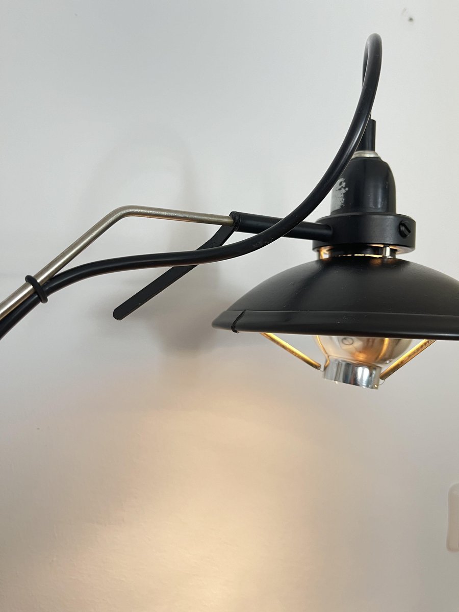 Questa bellissima lampada da scrivania degli anni '70 è un esempio lampante del design moderno del Mid-Century, che combina funzionalità ed effetti di luce artistici. La lampada presenta una pesante base circolare che garantisce stabilità, mentre un lungo braccio metallico "fluttuante" consente una facile regolazione. Con il suo leggero movimento, il braccio crea ombre uniche e diverse sfumature di luce, aggiungendo un tocco dinamico al vostro spazio.