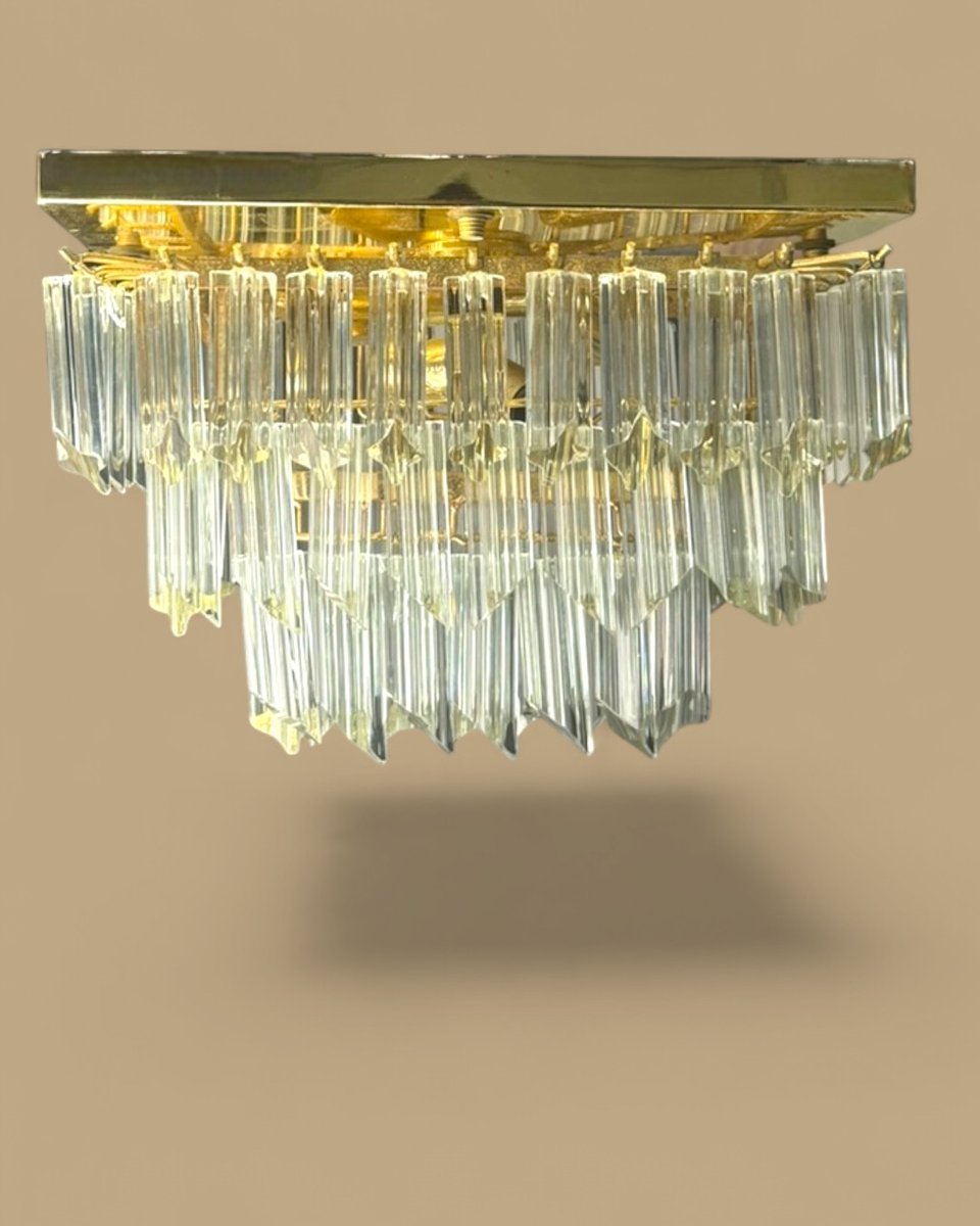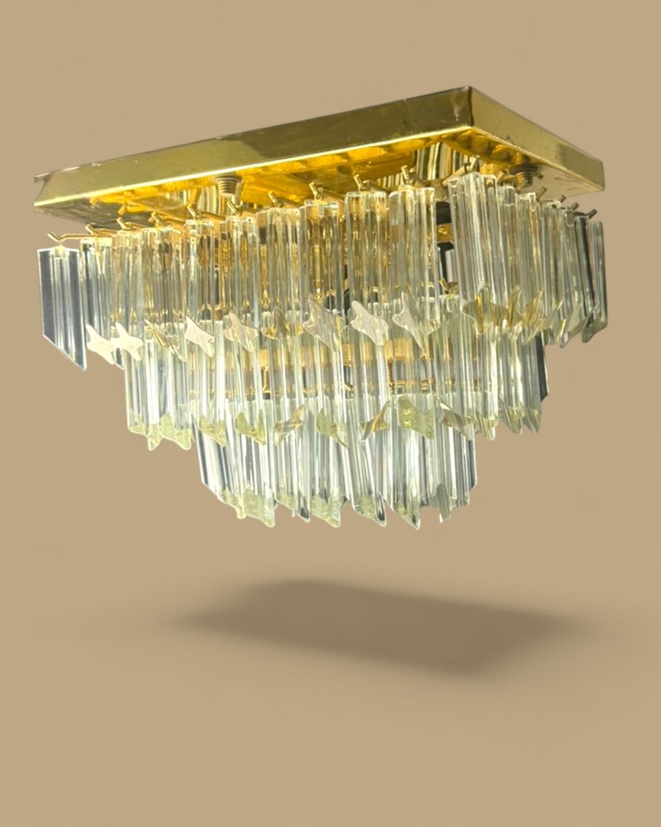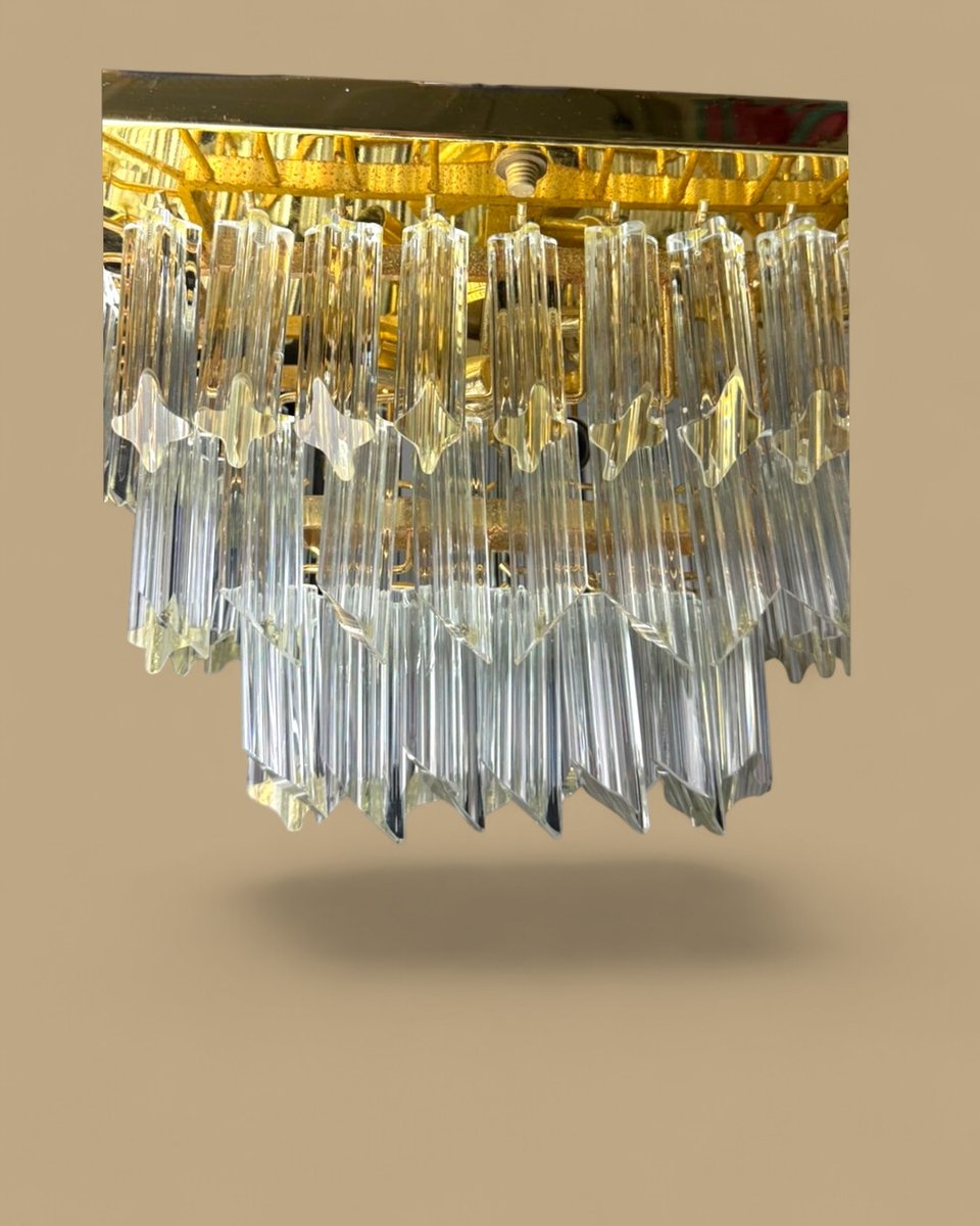 Lampada da soffitto italiana in vetro di Murano – Serie CH di Novaresi, anni '70 Lampada da soffitto italiana vintage in vetro di Murano della serie CH di Novaresi, prodotta in Italia negli anni '70. Un oggetto da collezione caratterizzato da una struttura in ottone placcato oro combinata con elementi distintivi in vetro di Murano, disposti in un'elegante composizione a cascata.