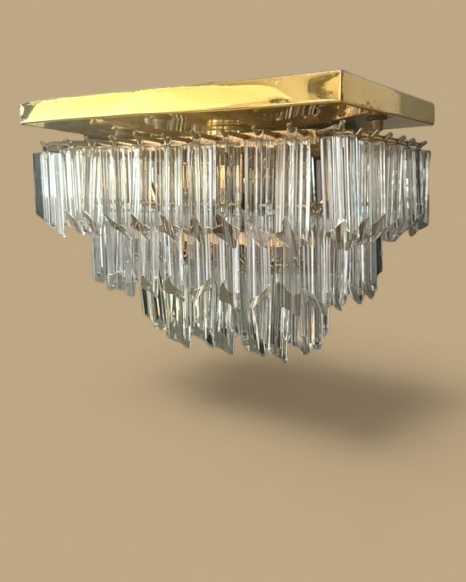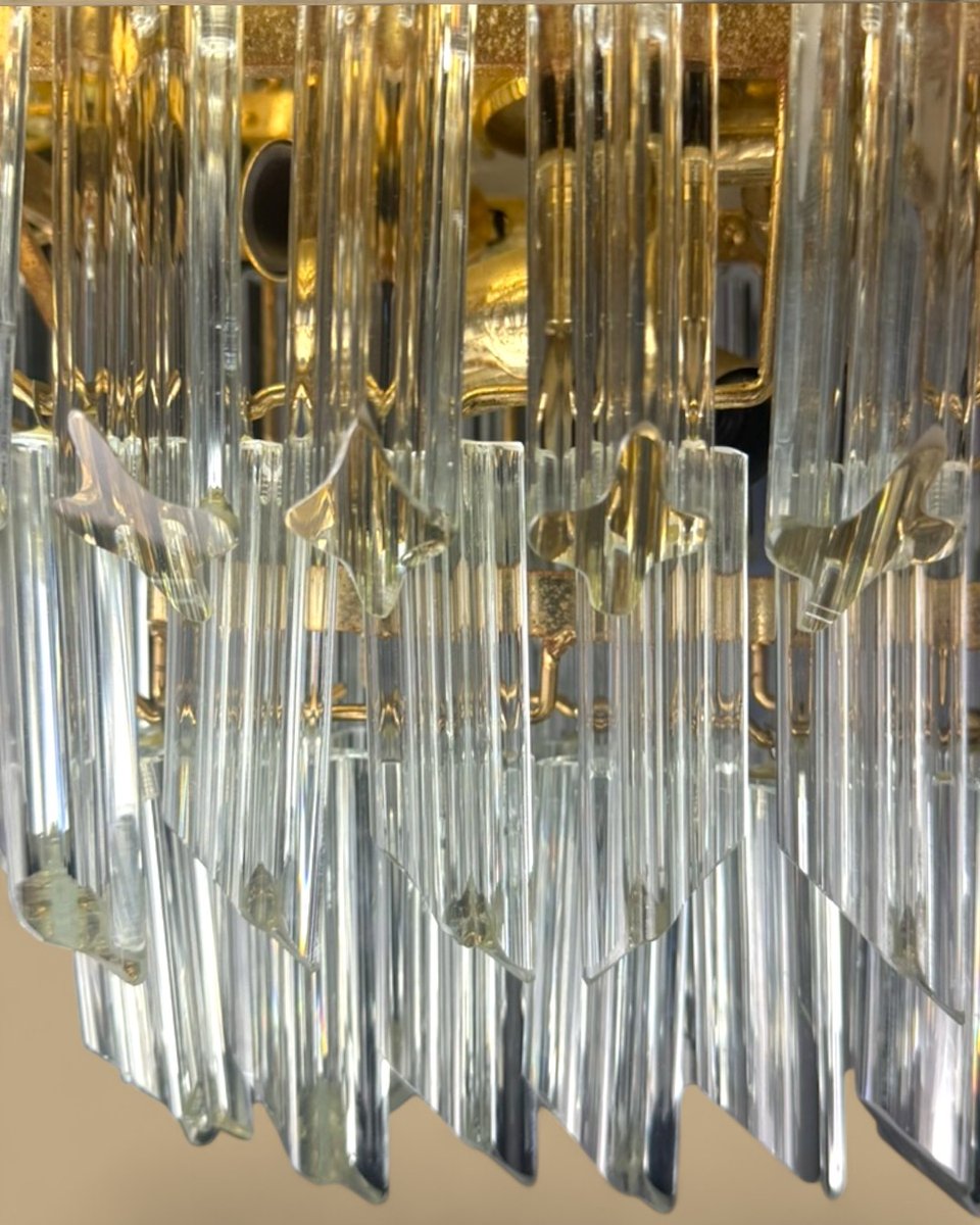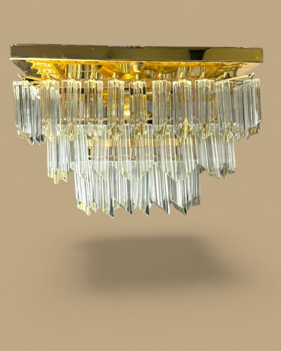 Lampada da soffitto italiana in vetro di Murano – Serie CH di Novaresi, anni '70 Lampada da soffitto italiana vintage in vetro di Murano della serie CH di Novaresi, prodotta in Italia negli anni '70. Un oggetto da collezione caratterizzato da una struttura in ottone placcato oro combinata con elementi distintivi in vetro di Murano, disposti in un'elegante composizione a cascata.