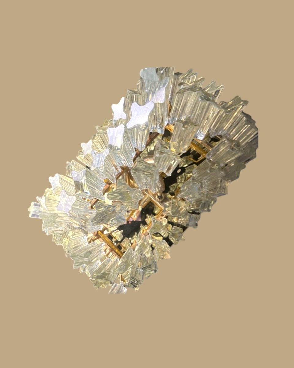 Note: a few of the glass elements show internal cracks, which are only visible when the crystals are removed from the lamp. When mounted, these imperfections are not visible and do not affect the stability or overall visual impact of the piece.