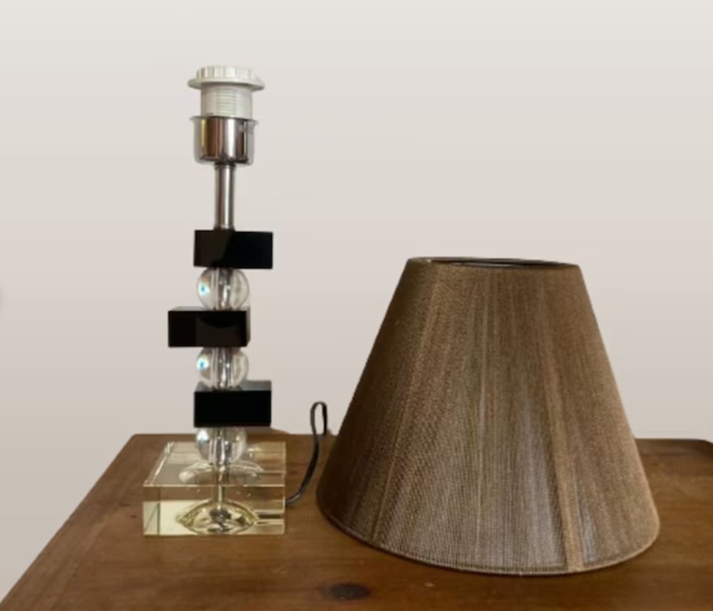 Transform any room into an oasis of tranquility with this exquisite lamp. Its unique design and glass construction make it a standout piece that will complement any décor style. Elevate your space with this table lamp and enjoy the beauty of its methacrylate-style glass so popular in the 70s and 80s. Experience the perfect combination of vintage charm and contemporary simplicity with this eye-catching bedside lamp.