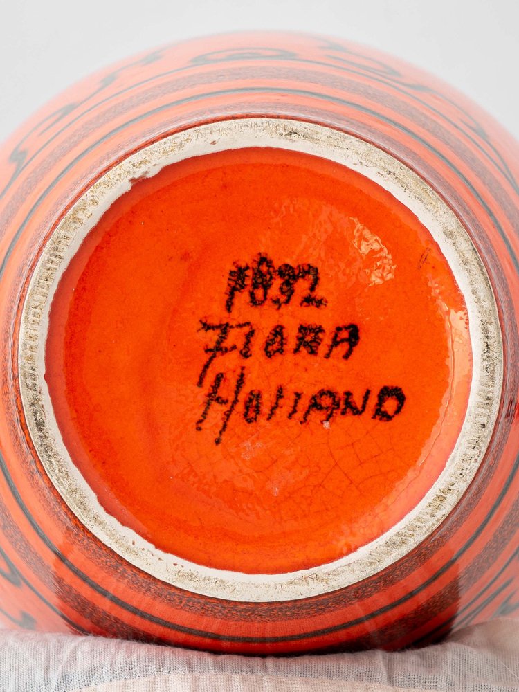 Il corpo in ceramica è caratterizzato da una vivace smaltatura arancione fuoco, stratificata con motivi lineari neri opachi che avvolgono ritmicamente la forma. La decorazione è emblematica della produzione tardo-moderna di Flora Gouda: astratta, architettonica e volutamente grafica, con forti bande orizzontali e simboli calligrafici che richiamano sia lo stile mid-century che quello postmoderno. Lo smalto arancione saturo ha una profondità fusa, quasi lavica, mentre le decorazioni nere creano un netto contrasto e una struttura visiva.