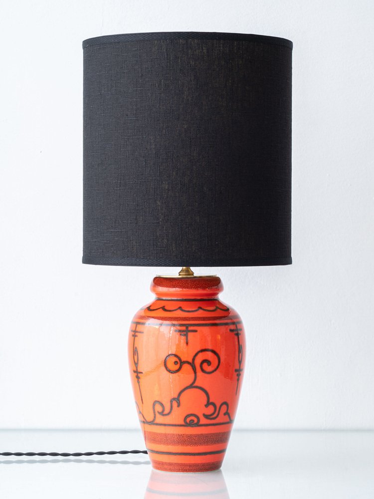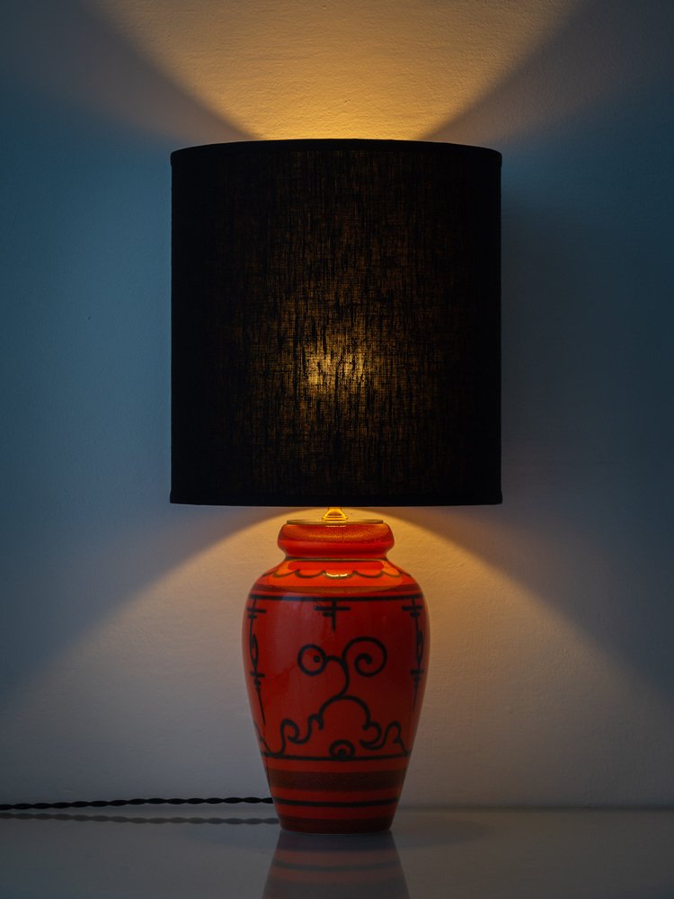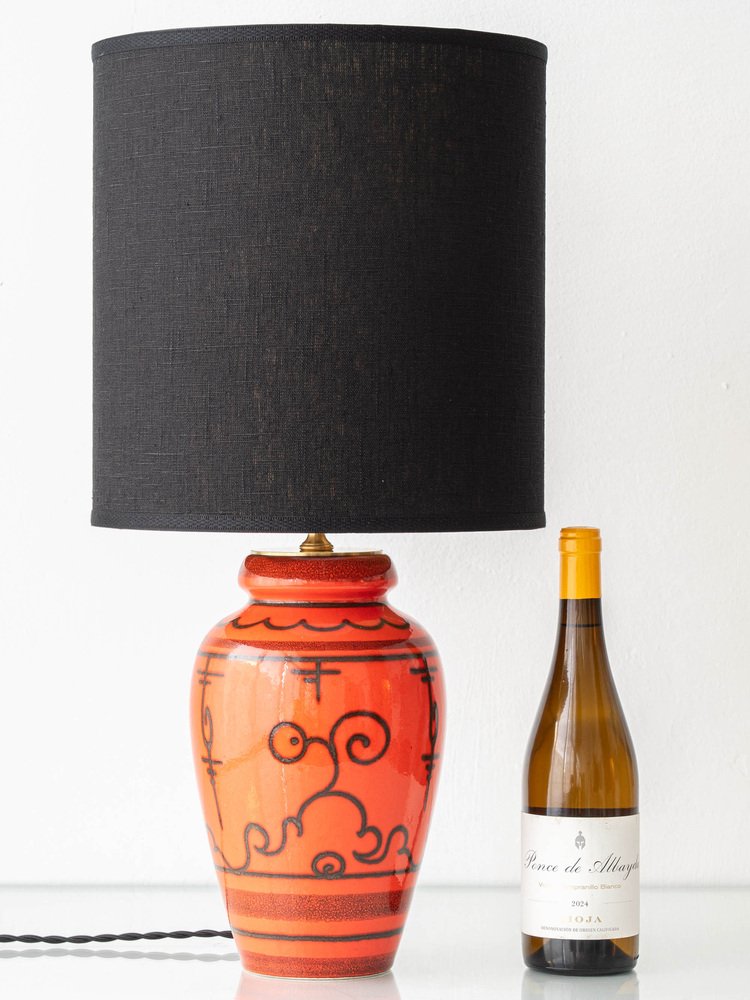 Vivace lampada olandese in ceramica Gouda realizzata con un raro vaso Flora "Tokio" (1968-77 circa) dalle grandi dimensioni, con smalto arancione brillante, linee grafiche nere e un nuovo paralume a tamburo in lino nero con bordi dorati personalizzato. Cablaggio professionale con nuova presa e cavo rivestito in tessuto; fornita con spina americana o adattata per il Paese di utilizzo. L'altezza include il paralume.